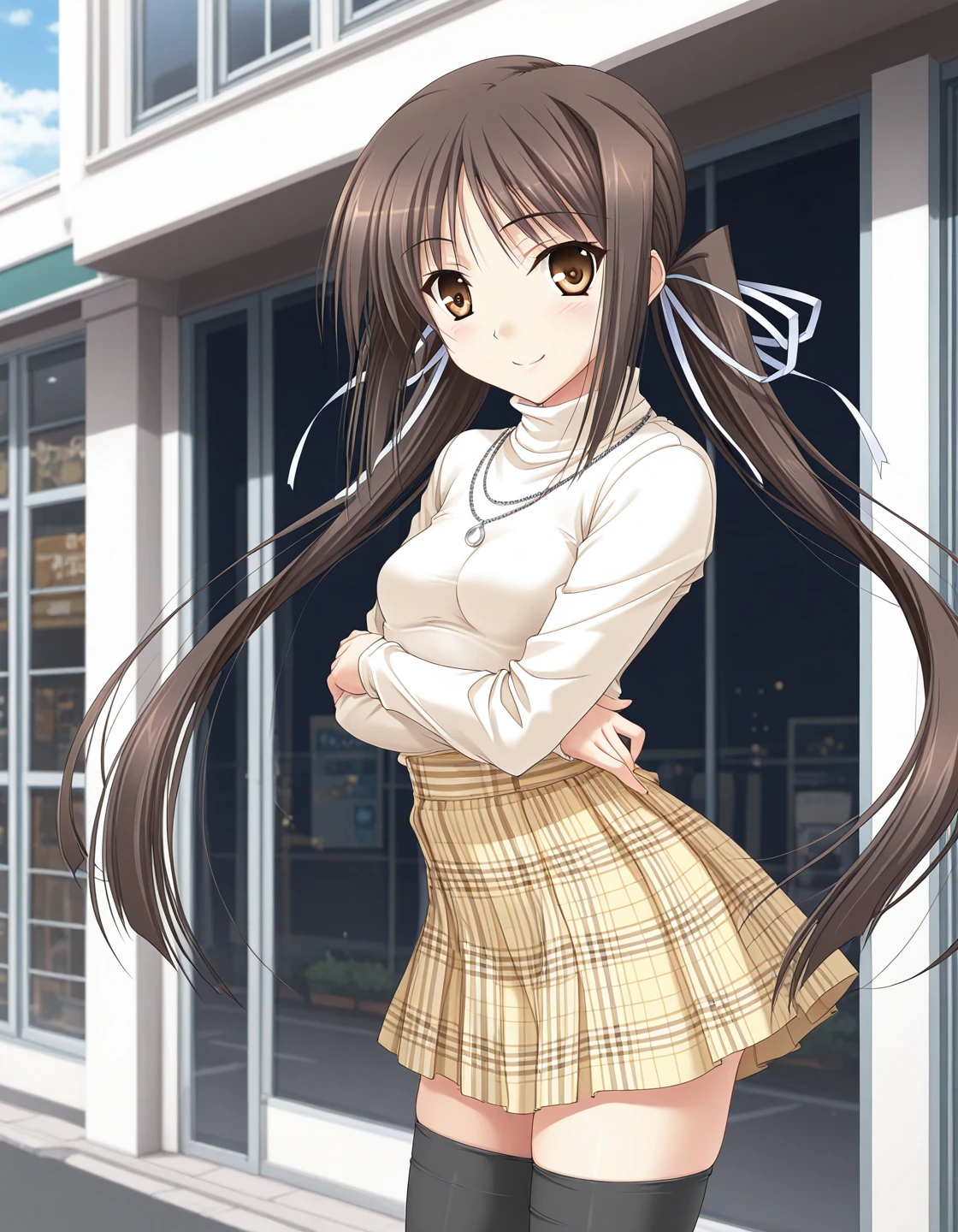 houjouin seika, brown hair, long hair, twintails, hair ribbon, brown eyesOutfit :