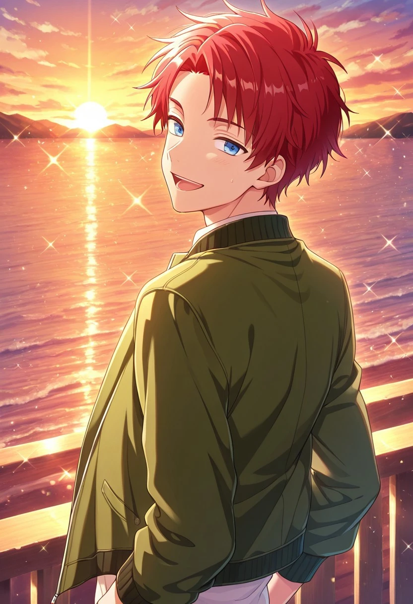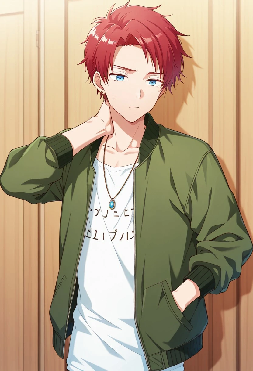 1boy, male focus, solo, blue eyes, red hair, collarbone, necklace, white shirt, green jacket, open jacket, blue pants, boots, brown footwear,