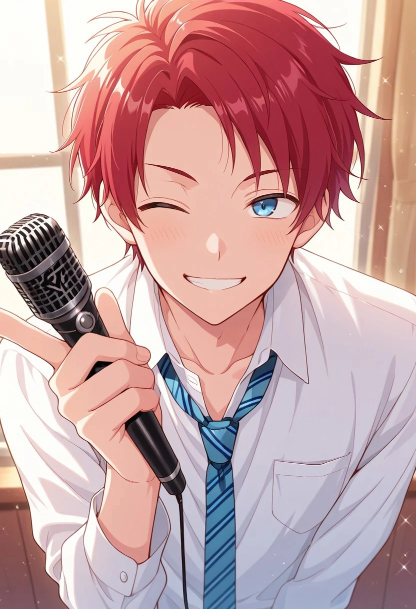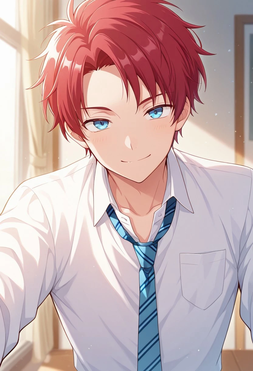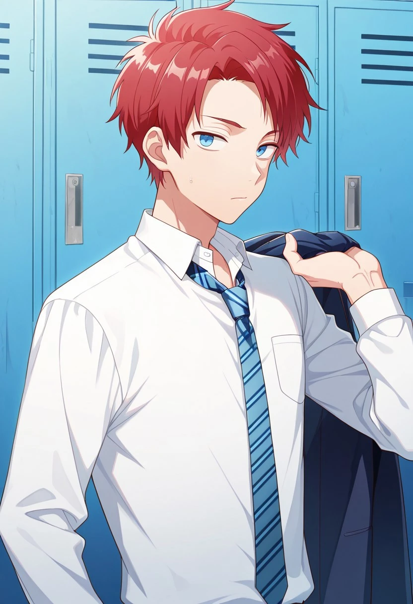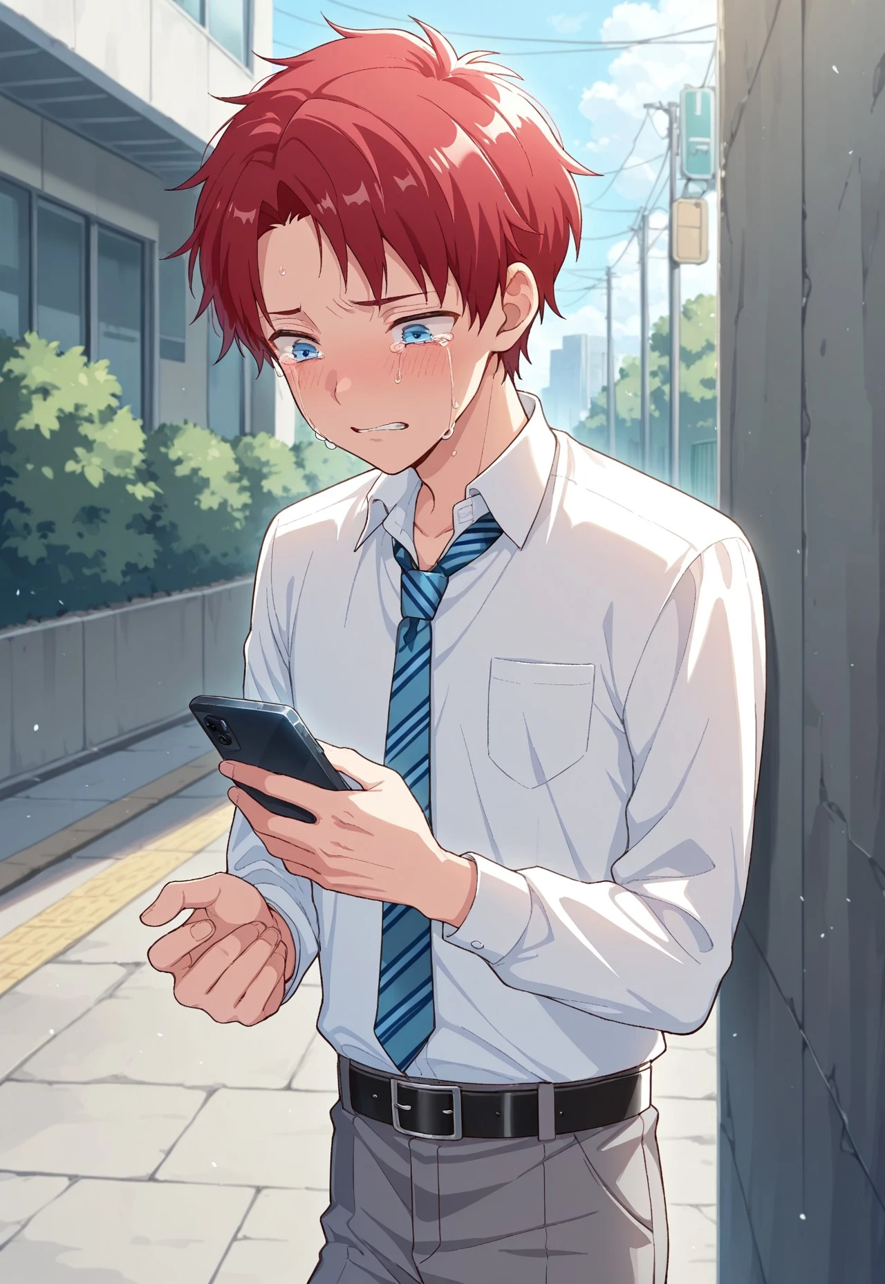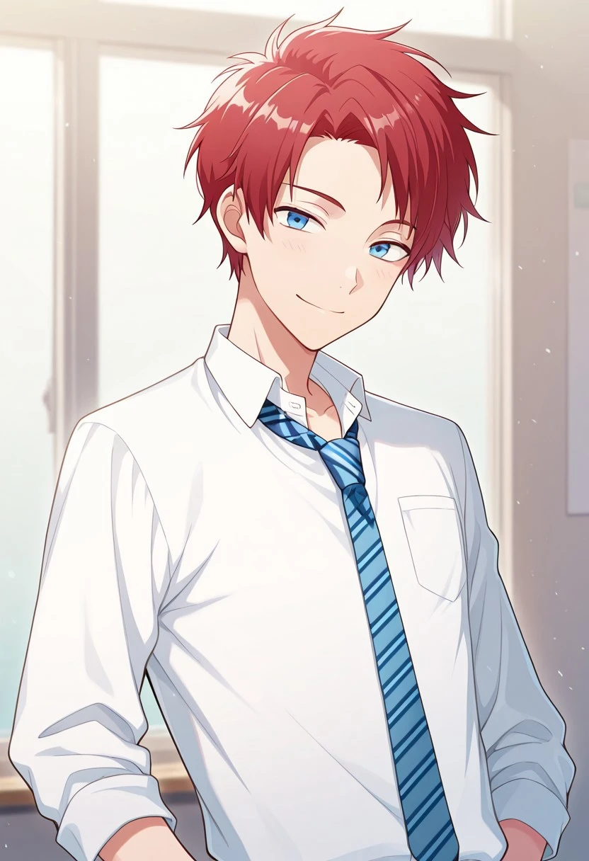 1boy, male focus, solo, blue eyes, red hair, white shirt, collared shirt, open collar, blue necktie, striped necktie, shirt tucked in, belt, grey pants, shoes, black footwear,