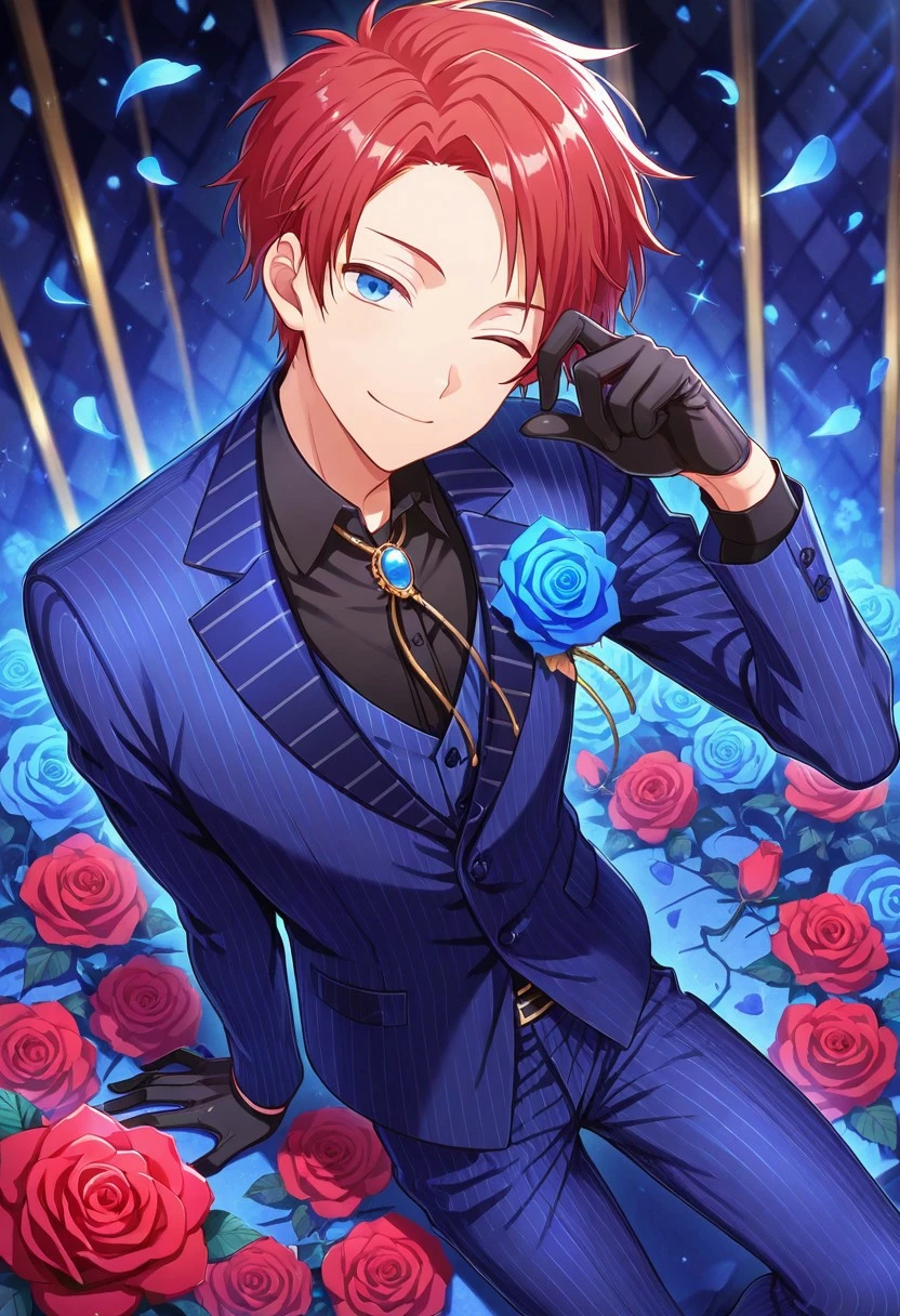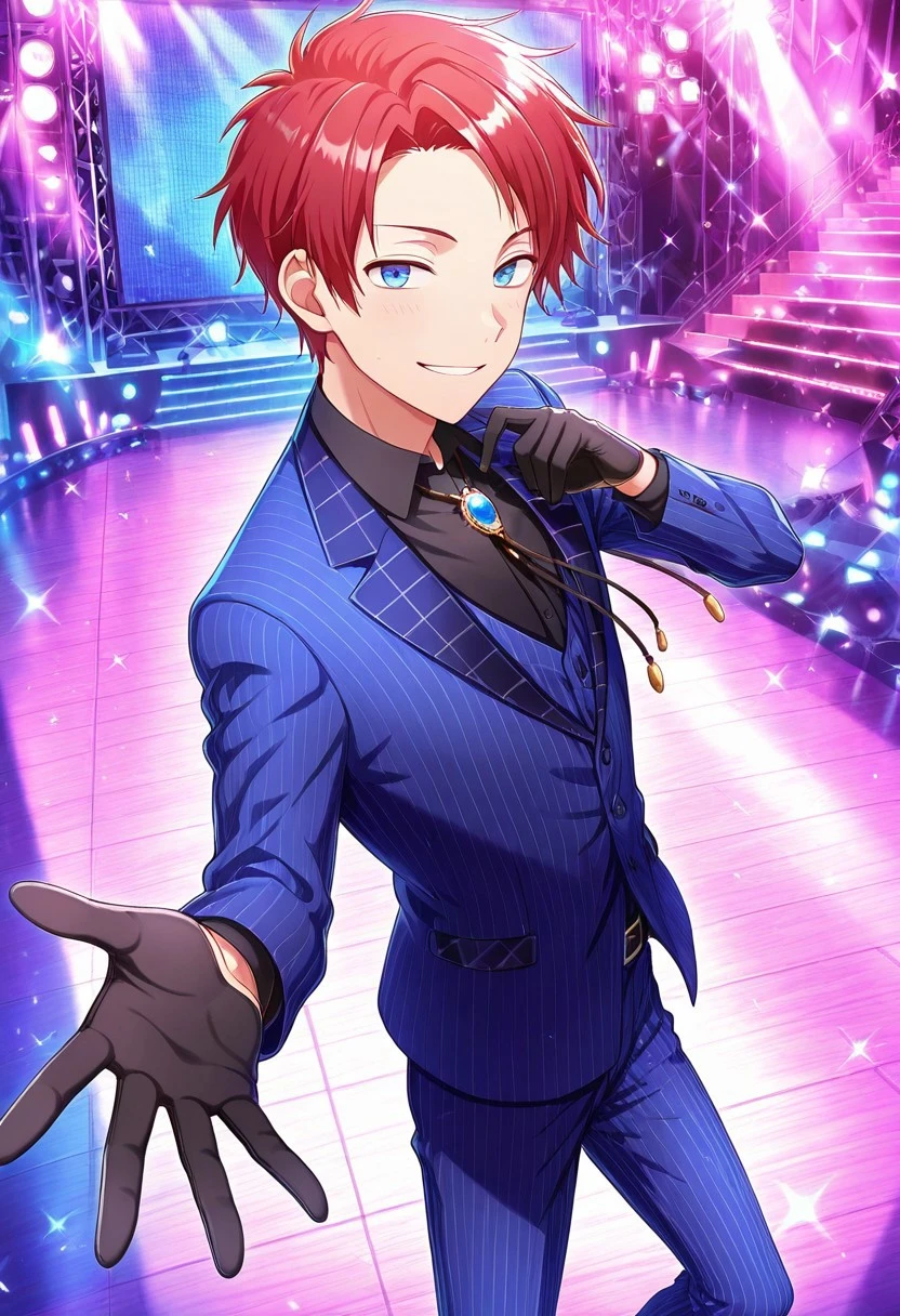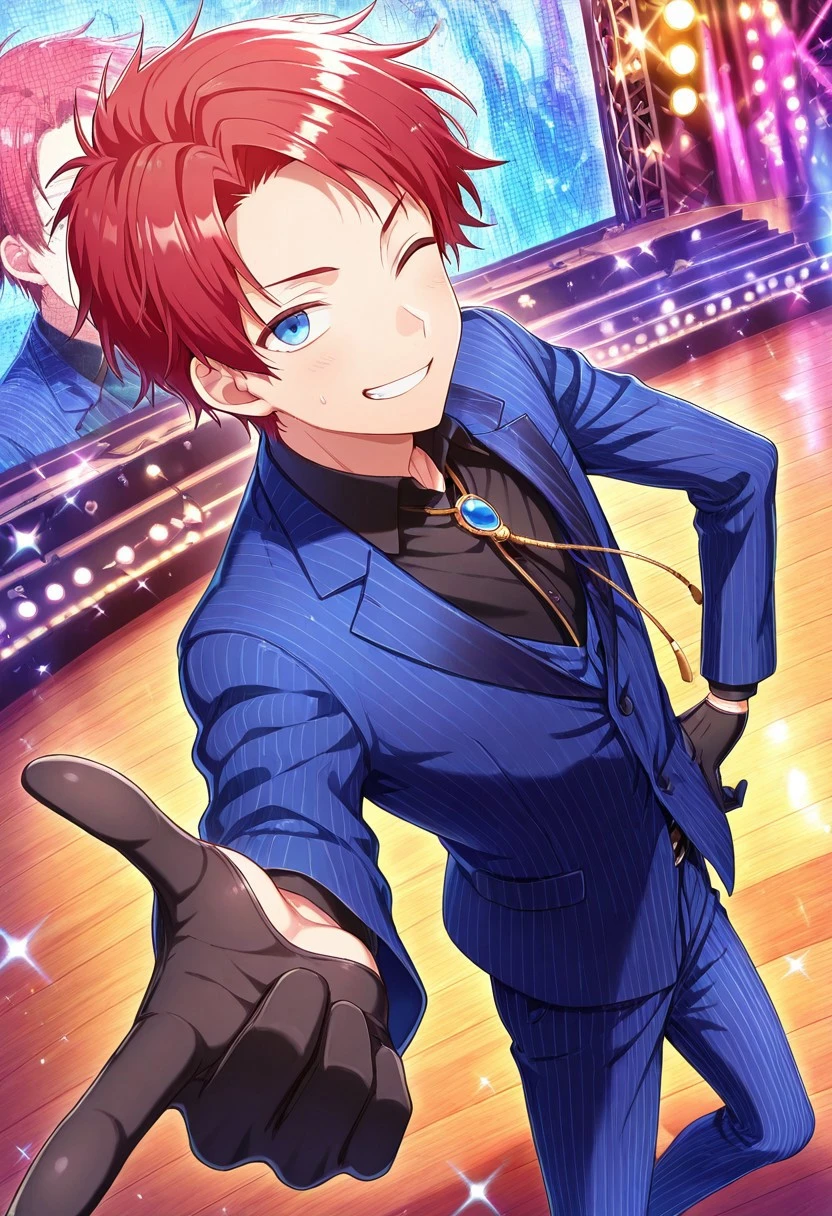 1boy, male focus, solo, blue eyes, red hair, suit, black shirt, collared shirt, bolo tie, blue jacket, blue pants, pinstripe pattern, black gloves, shoes, brown footwear,