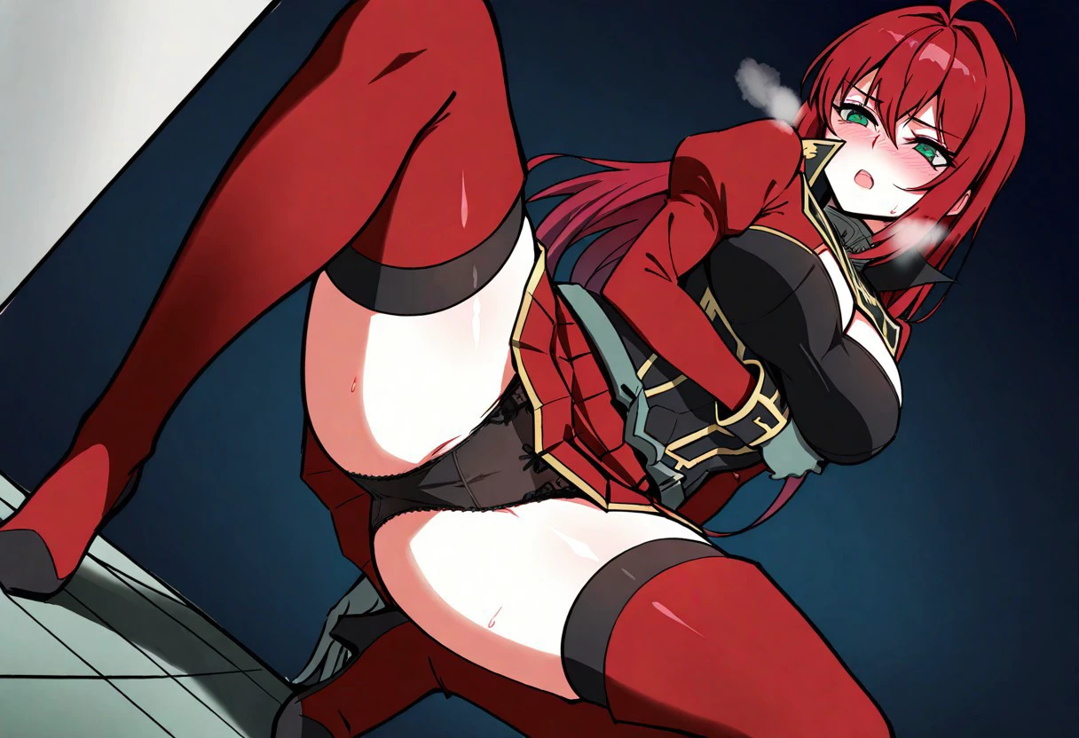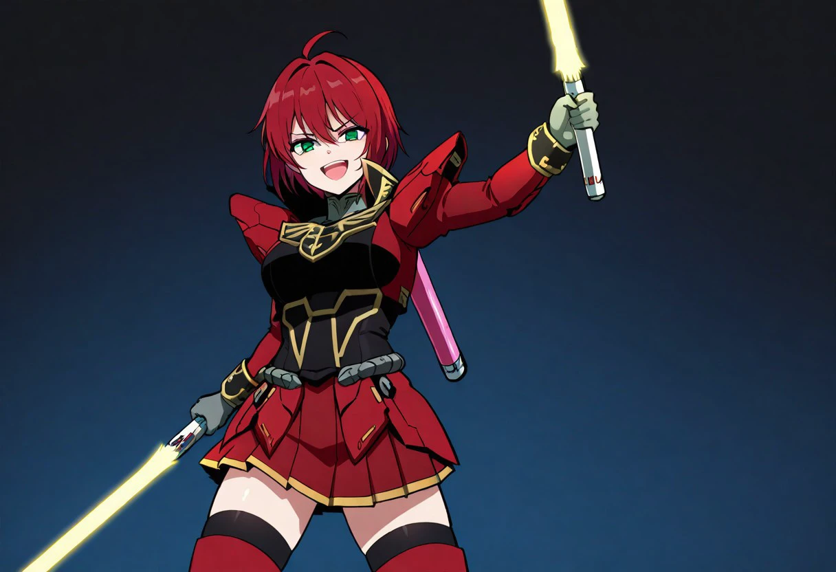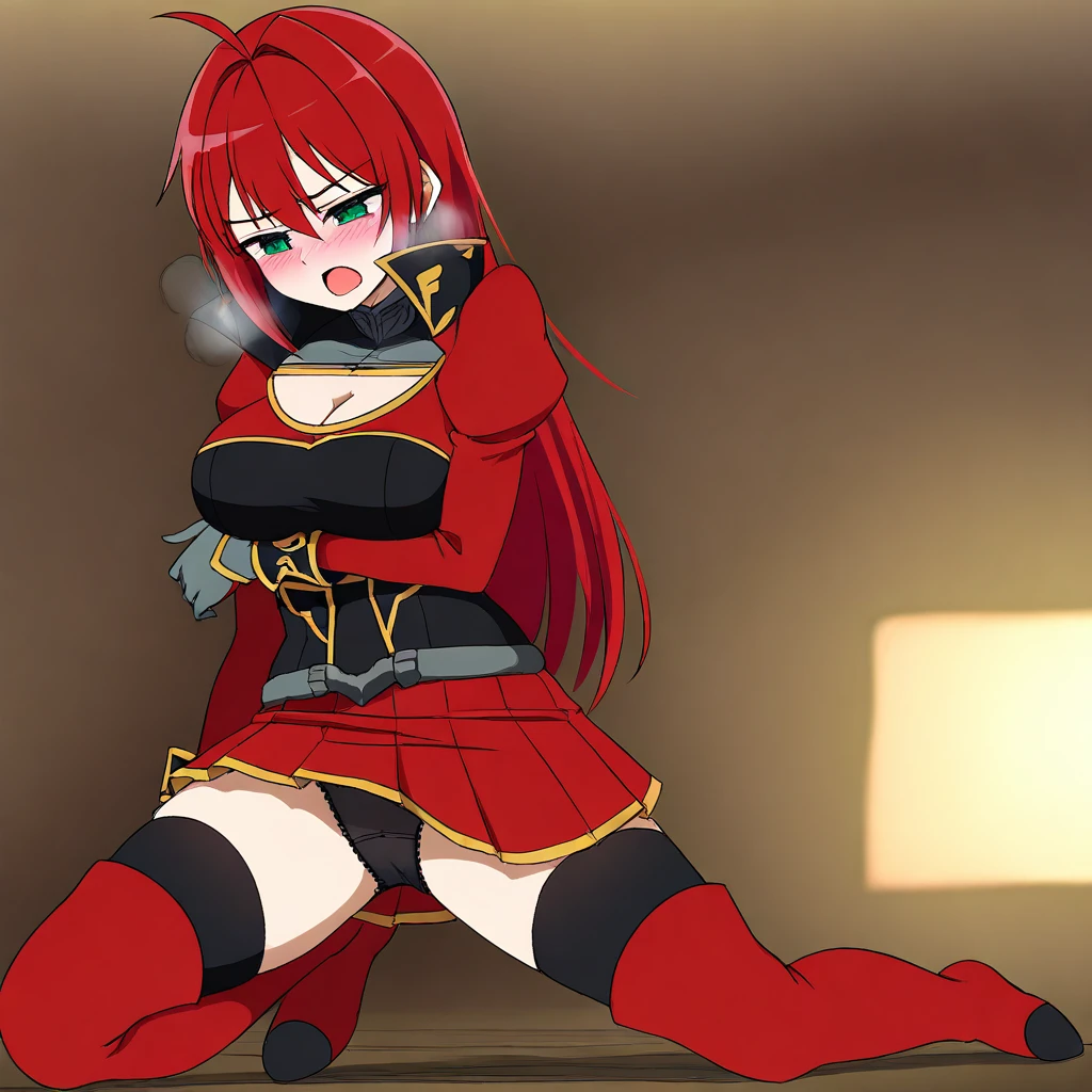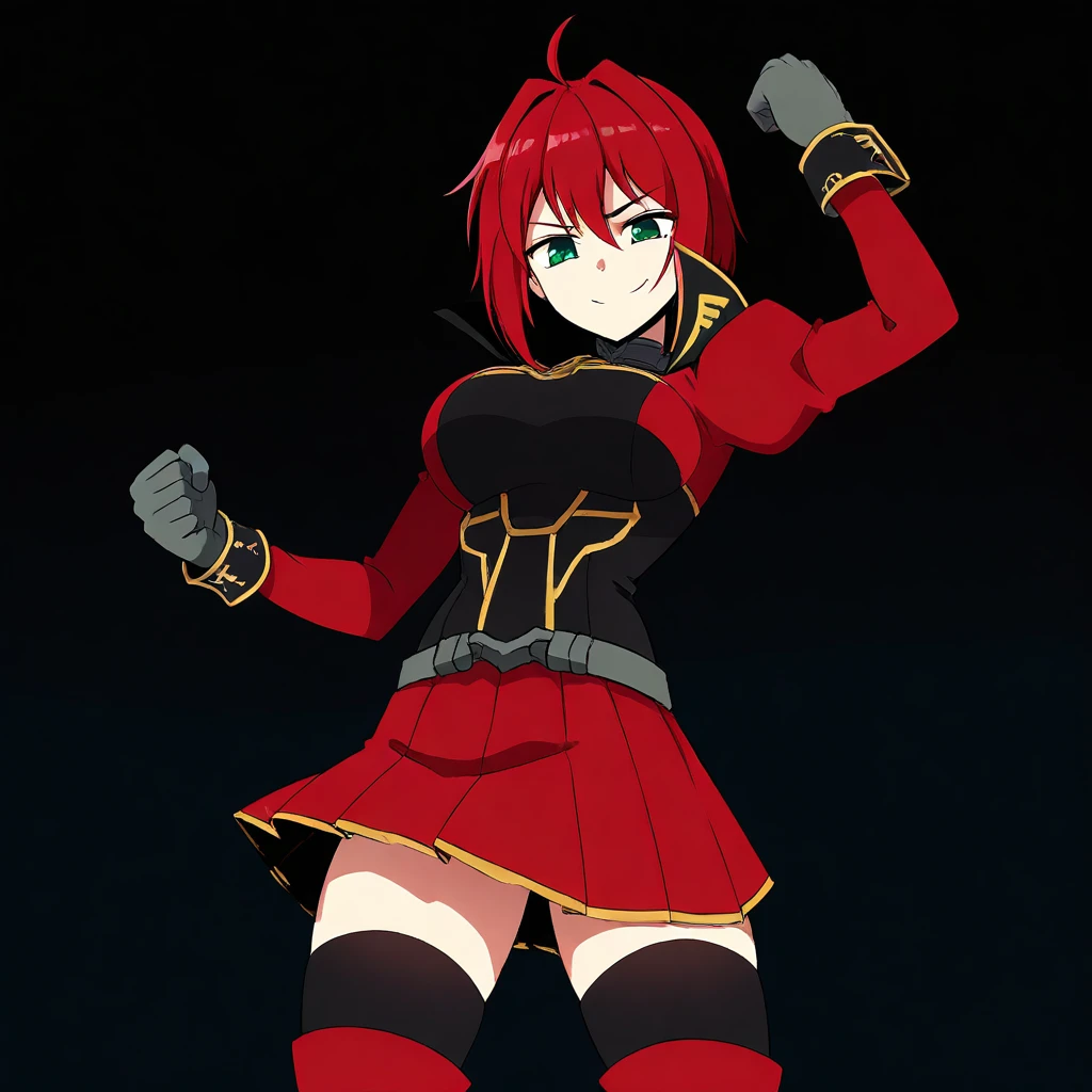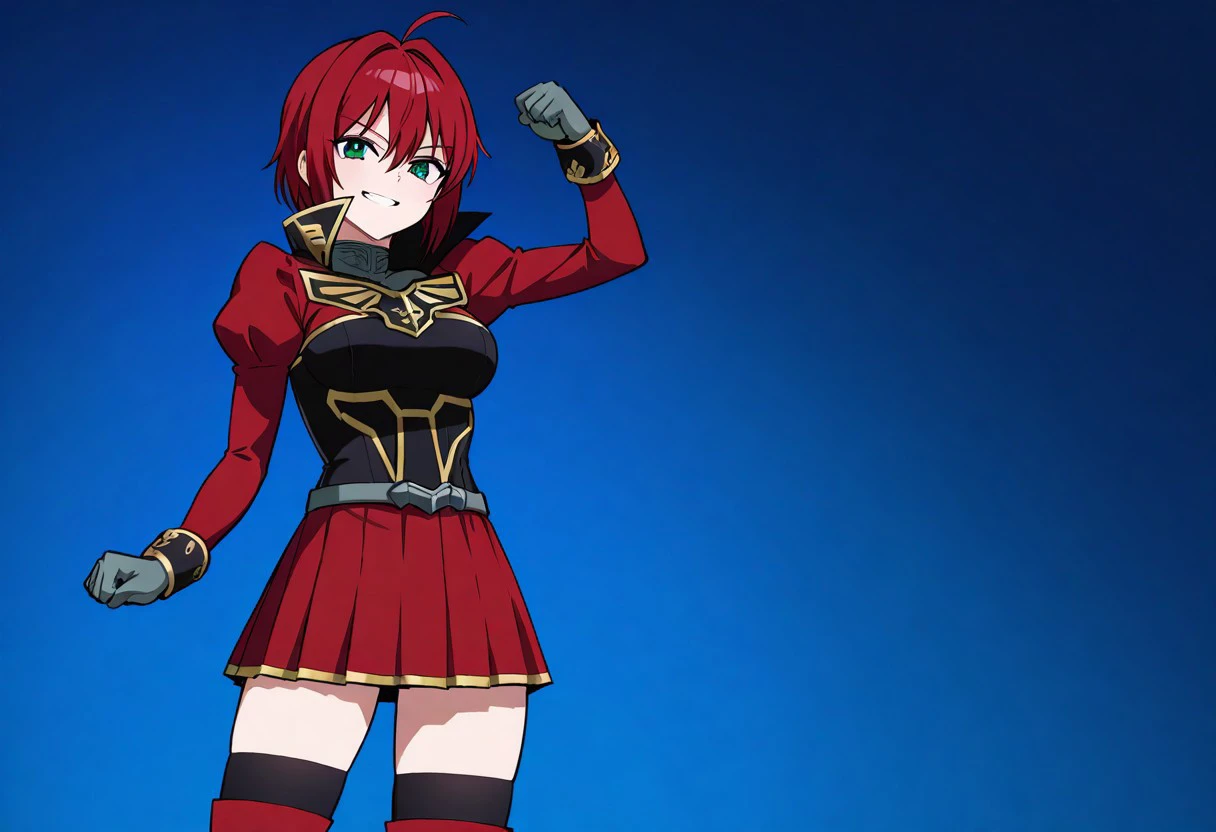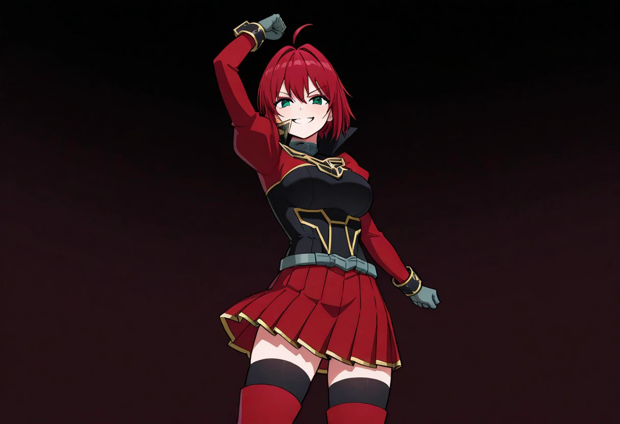 Outfit (Armorless): red and black shirt, gold trim, high collar, puffed shoulders, wristcuffs, red skirt, pleated skirt, black thighhighs, red thighboots, gray gloves