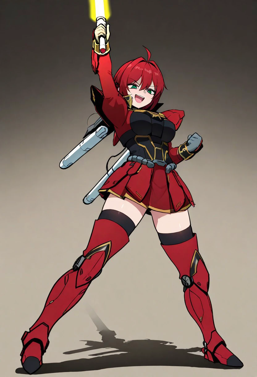 Outfit (Armor): red and black shirt, gold trim, high collar, puffed shoulders, wristcuffs, armor, red skirt, pleated skirt, black thighhighs, red thighboots, backpack, mecha musume, gray gloves
