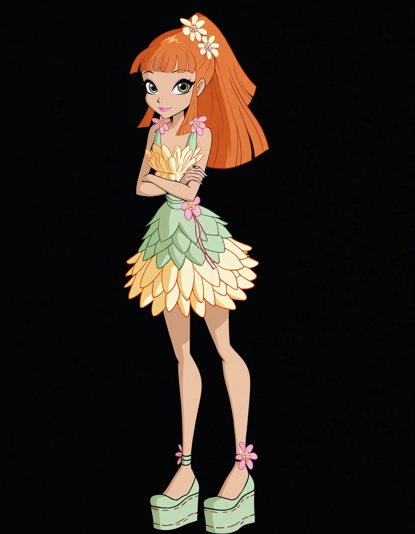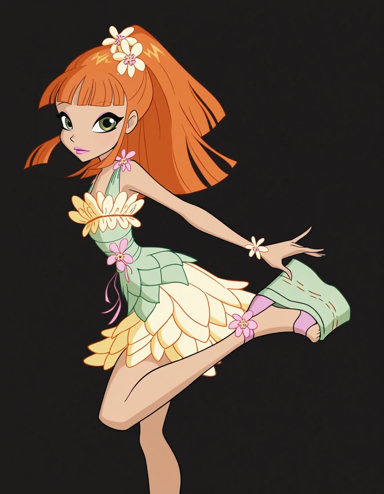 xmielex, orange hair, long hair, ponytail, bangs, green eyes, hair flower, makeup, lipstick