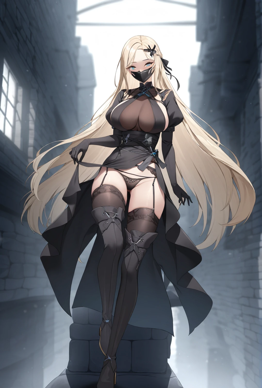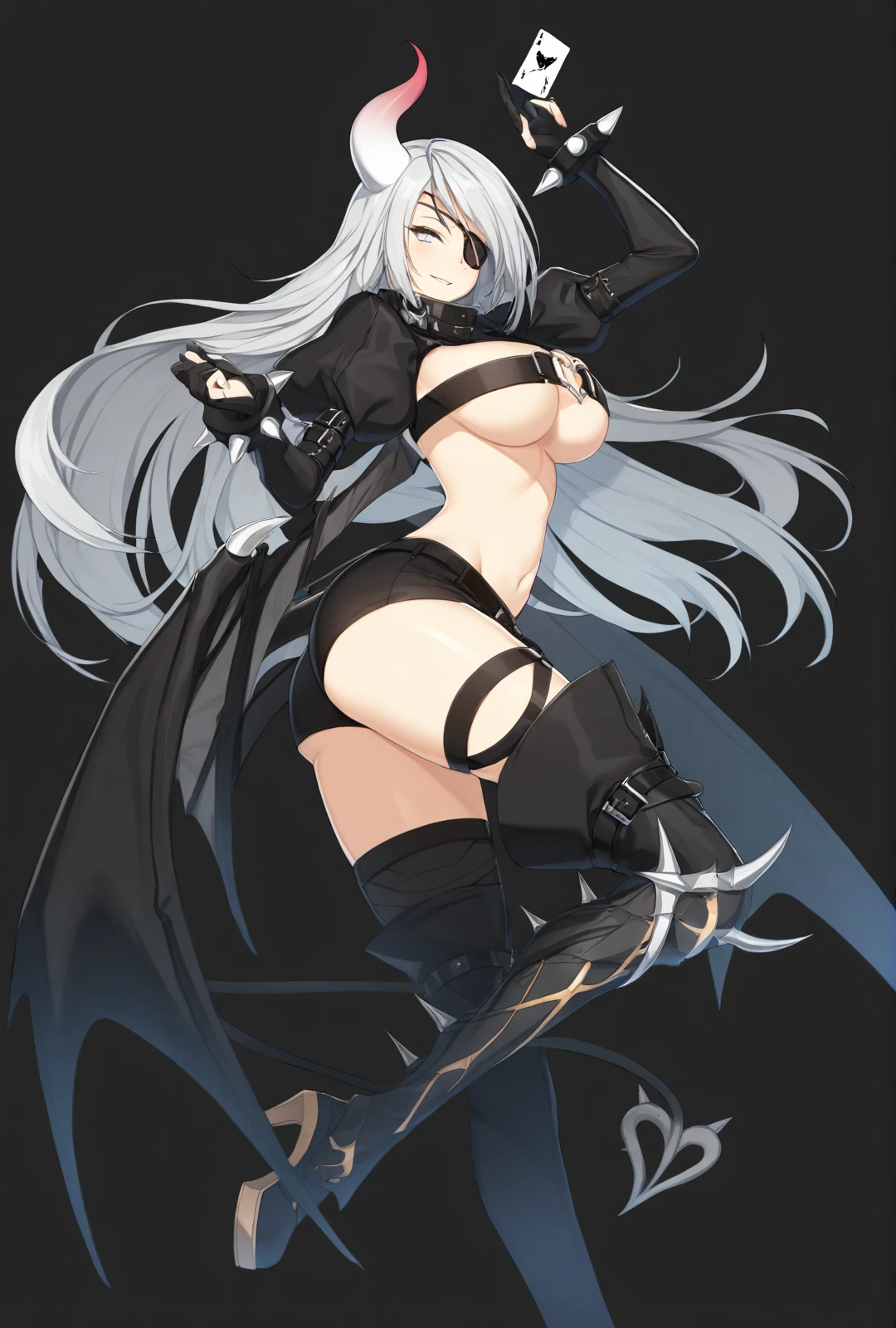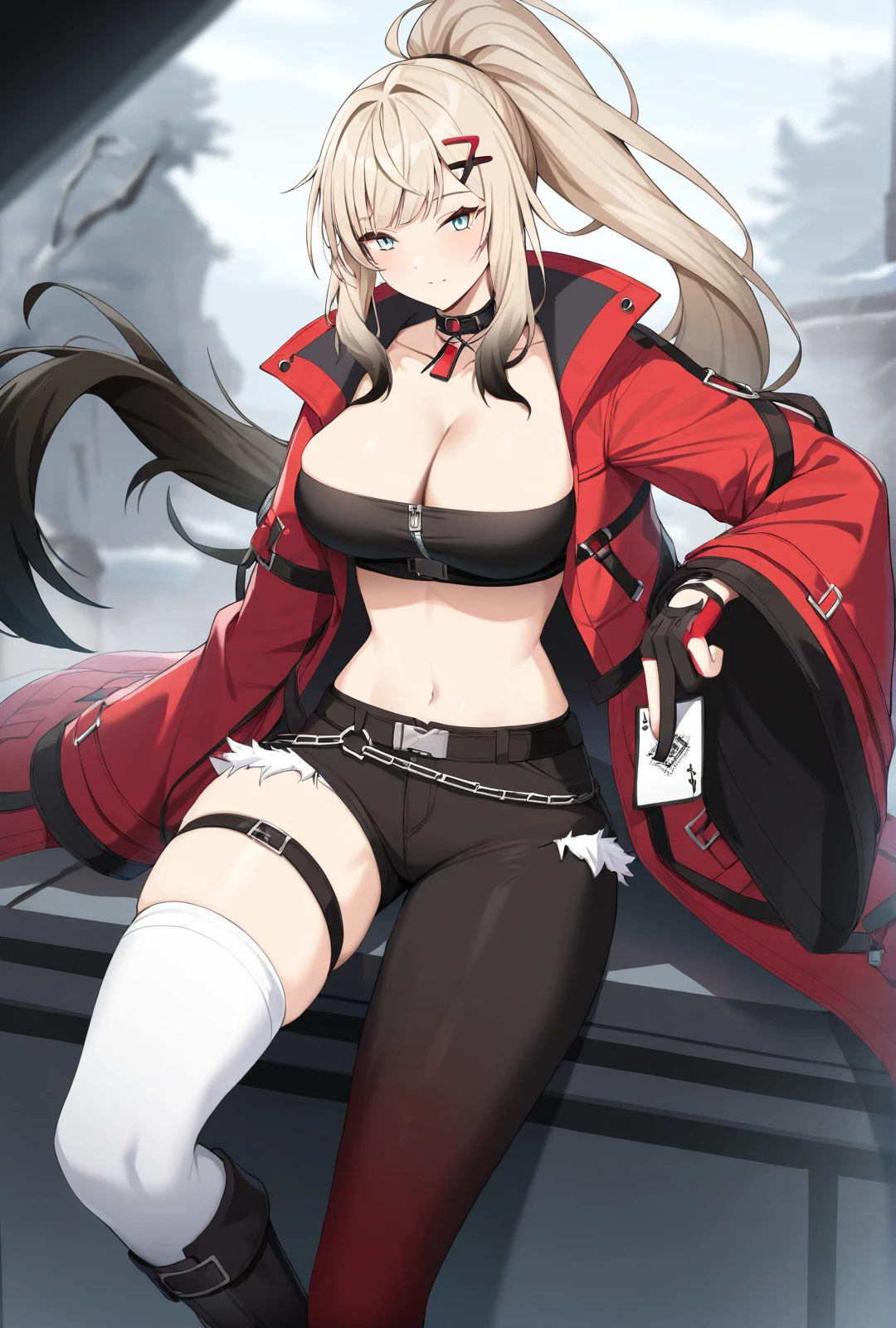 Harpy, 1girl, solo, long hair, blue eyes, shirt, large breasts, blonde hair, gloves, thighhighs, cleavage, thighs, boots, shorts, black gloves, collared shirt, high heels, short shorts, chain, thigh boots, corset, sleeves rolled up, asymmetrical legwear, partially fingerless gloves,