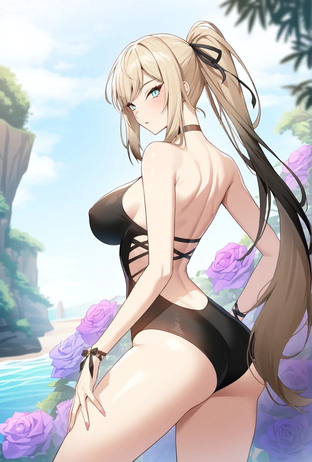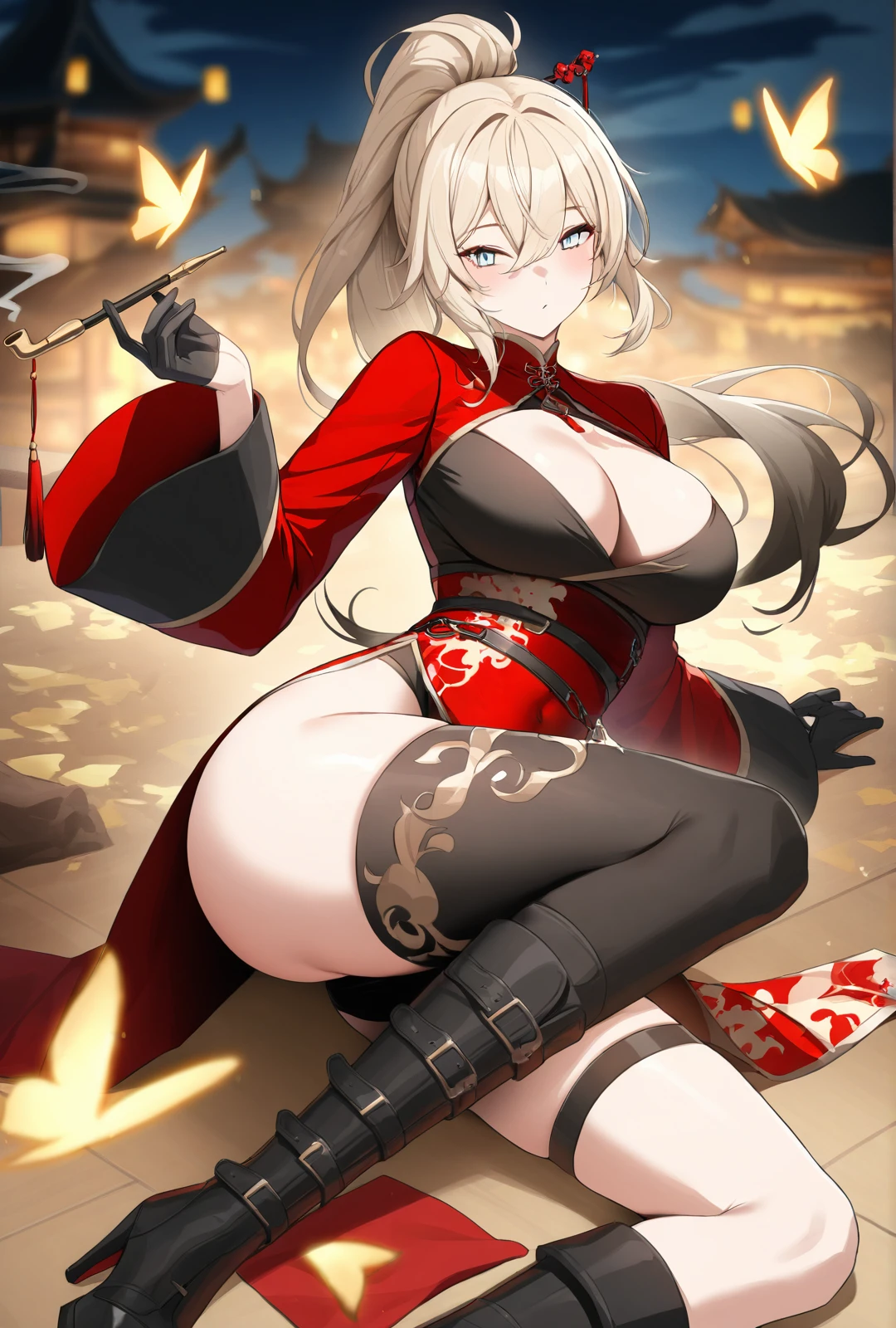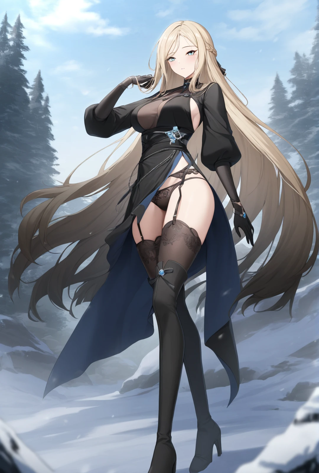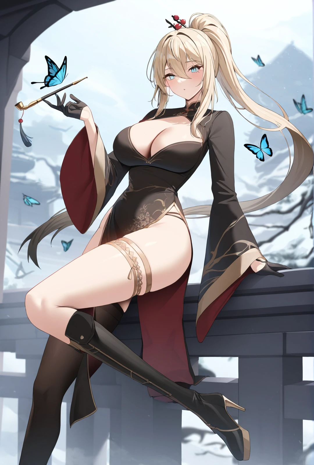 Harpy, 1girl, solo, long hair, blue eyes, shirt, large breasts, blonde hair, gloves, thighhighs, cleavage, thighs, boots, shorts, black gloves, collared shirt, high heels, short shorts, chain, thigh boots, corset, sleeves rolled up, asymmetrical legwear, partially fingerless gloves,