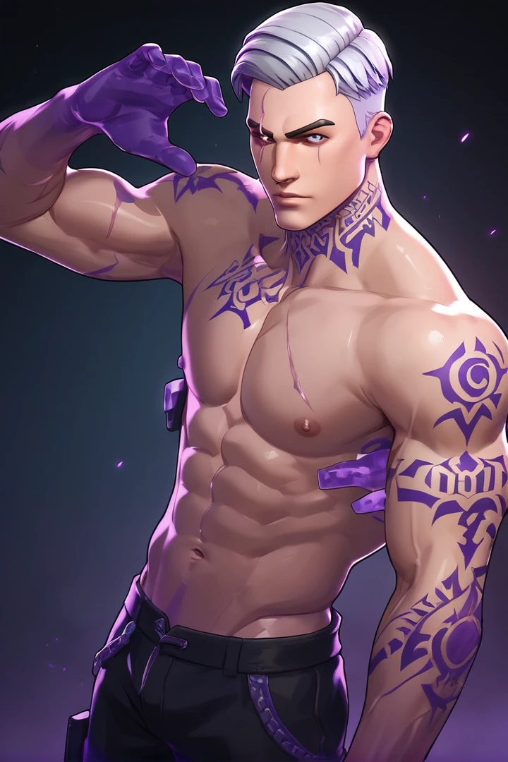shadowmidas, tattoo, grey hair, scar, purple glow