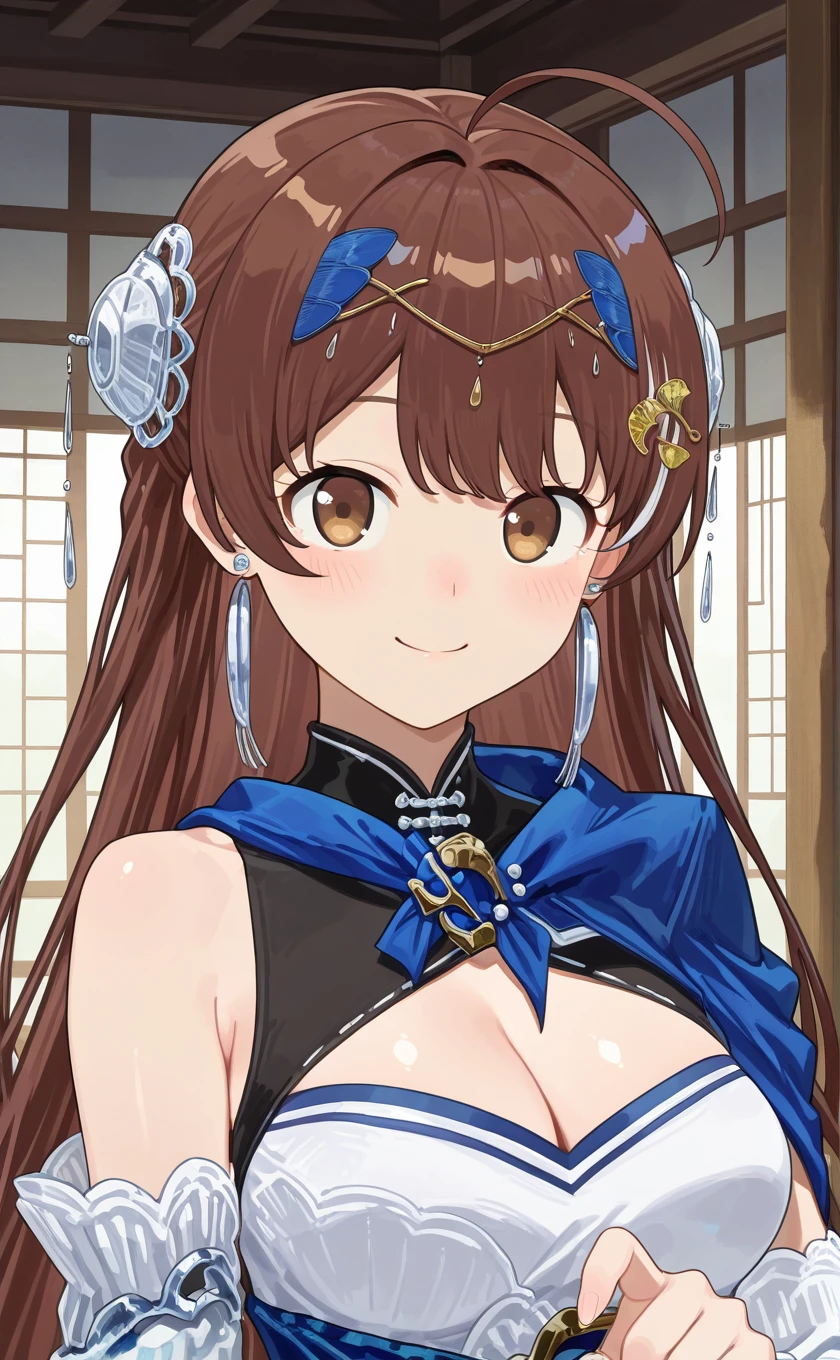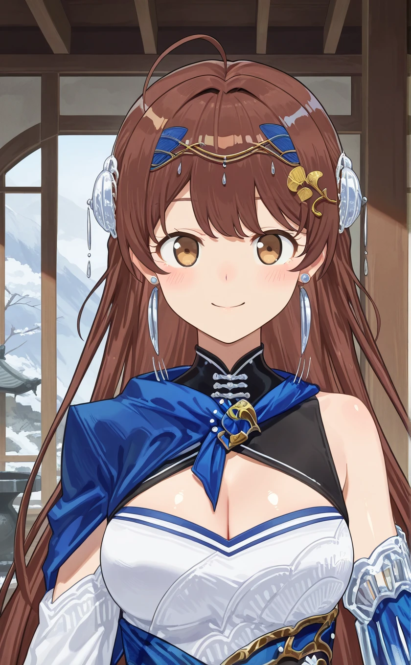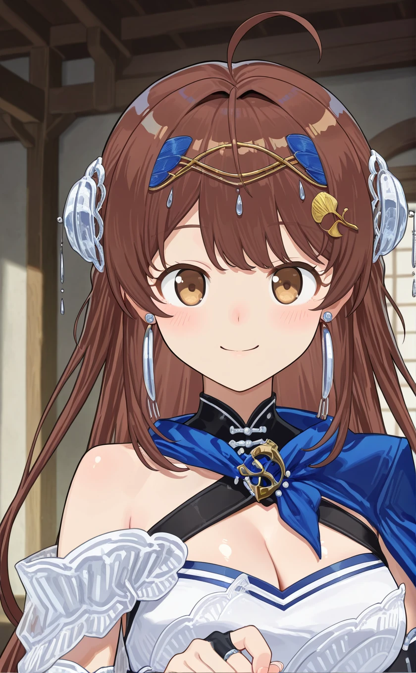 ahoge,very long hair,brown hair,white hair ornament,white earrings,brown eyes