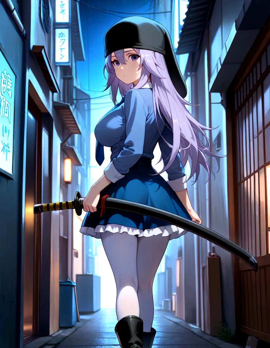 black hat, rabbit hat, blue shirt, dress shirt, blue necktie, blue skirt, frilled skirt, white pantyhose, black boots, knee boots