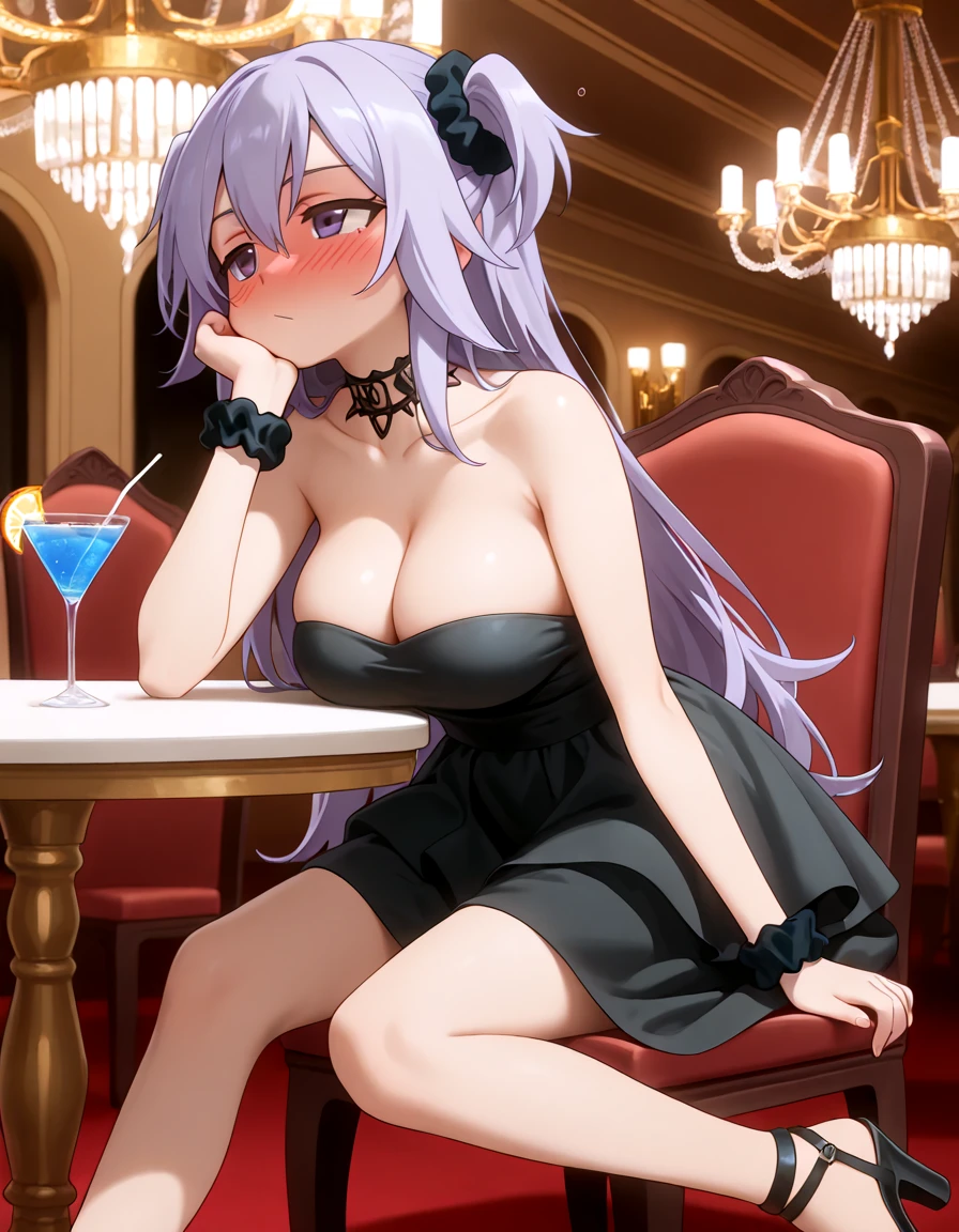 black dress, strapless dress, collarbone, cleavage, lace choker, wrist scrunchie, hair scrunchie, strappy heels