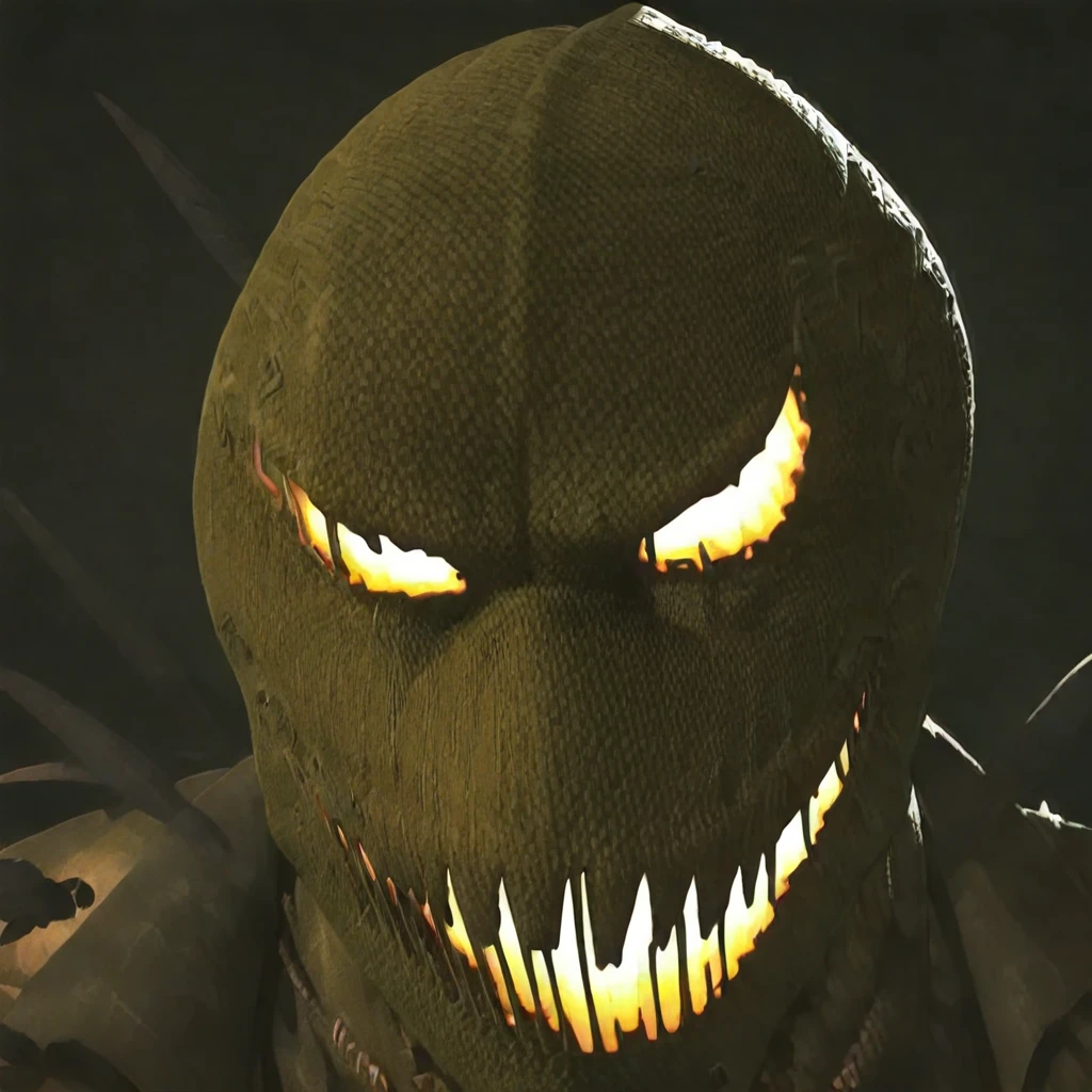 I2Scarecrow, scarcrow mask, monster, male, psychopathical , shining yellow eyes, short hair, injustice 2, identical face, villain