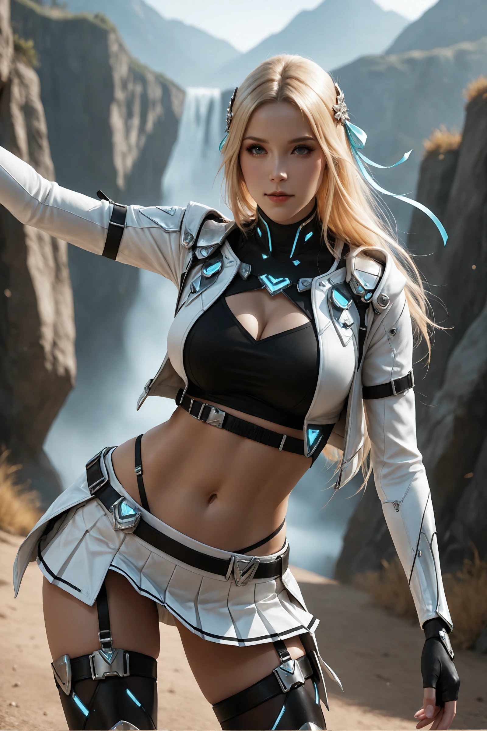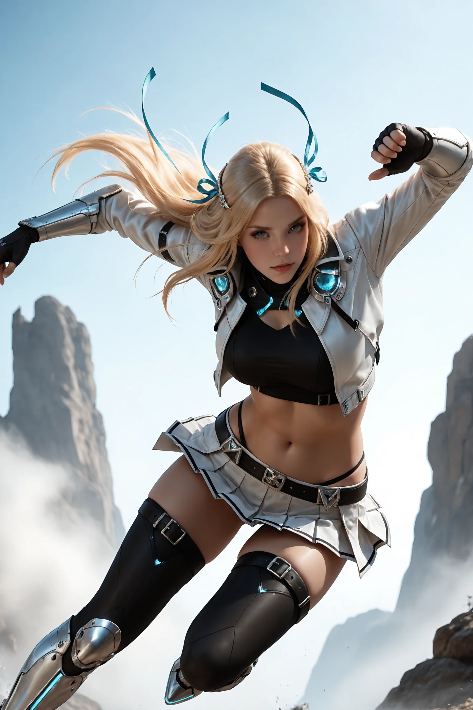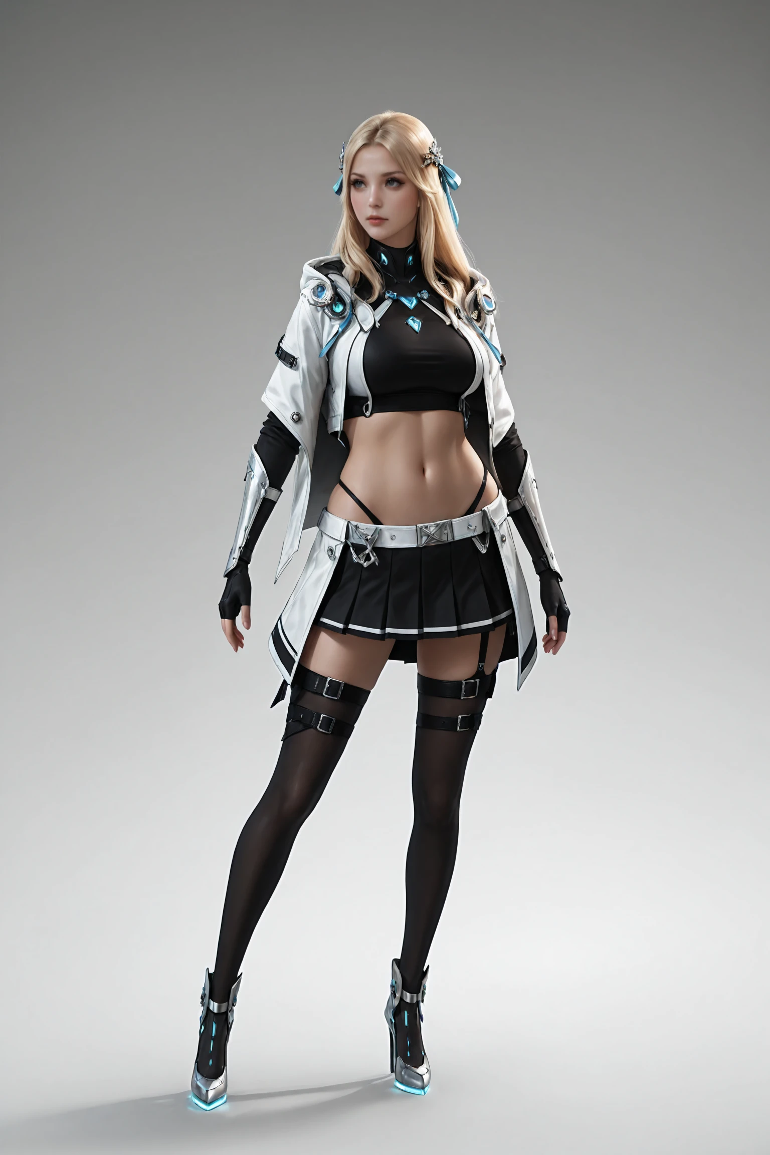 blonde_hair,long_hair,hair_ribbon,hair_ornament, large_breasts,navel,midriff,open_jacket, jacket,crop_top,fingerless_gloves,belt,thong,pleated_skirt,thigh_belt,black_thighhighs, mechanical_footwear,high_heels,
