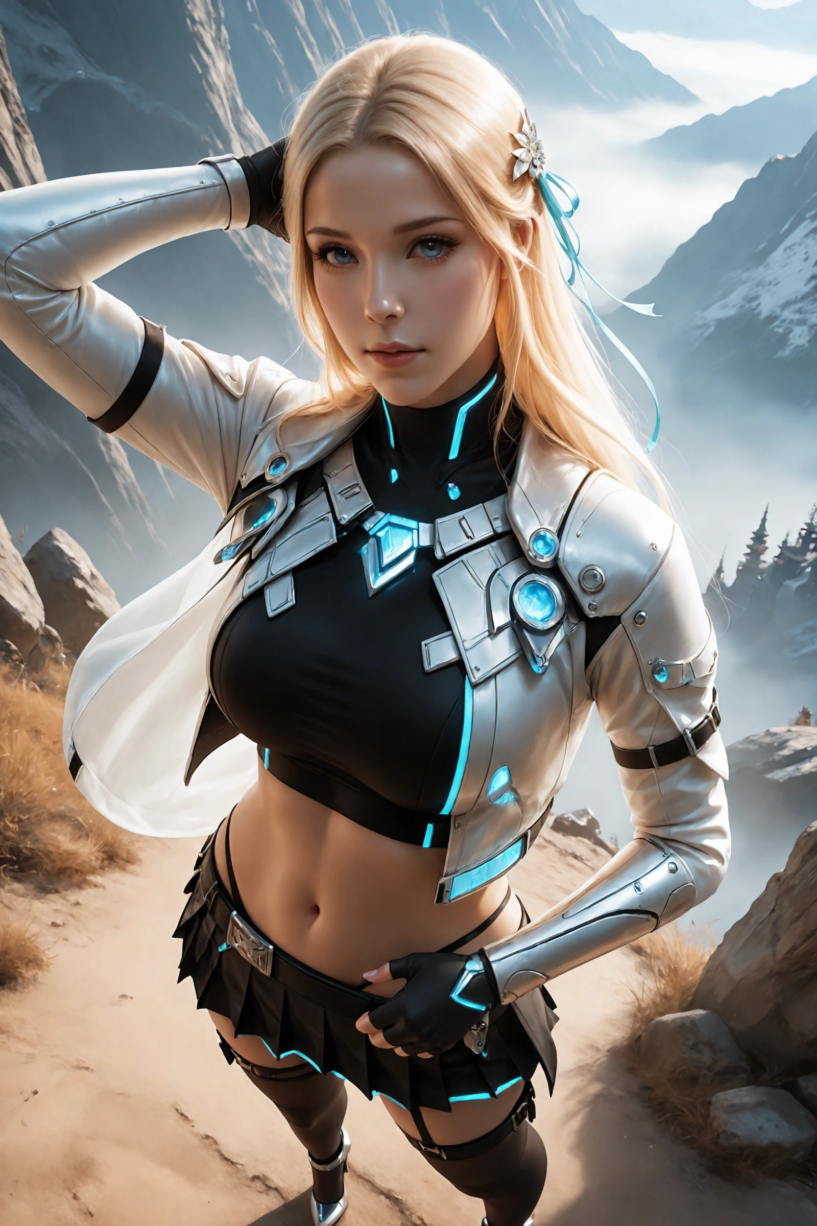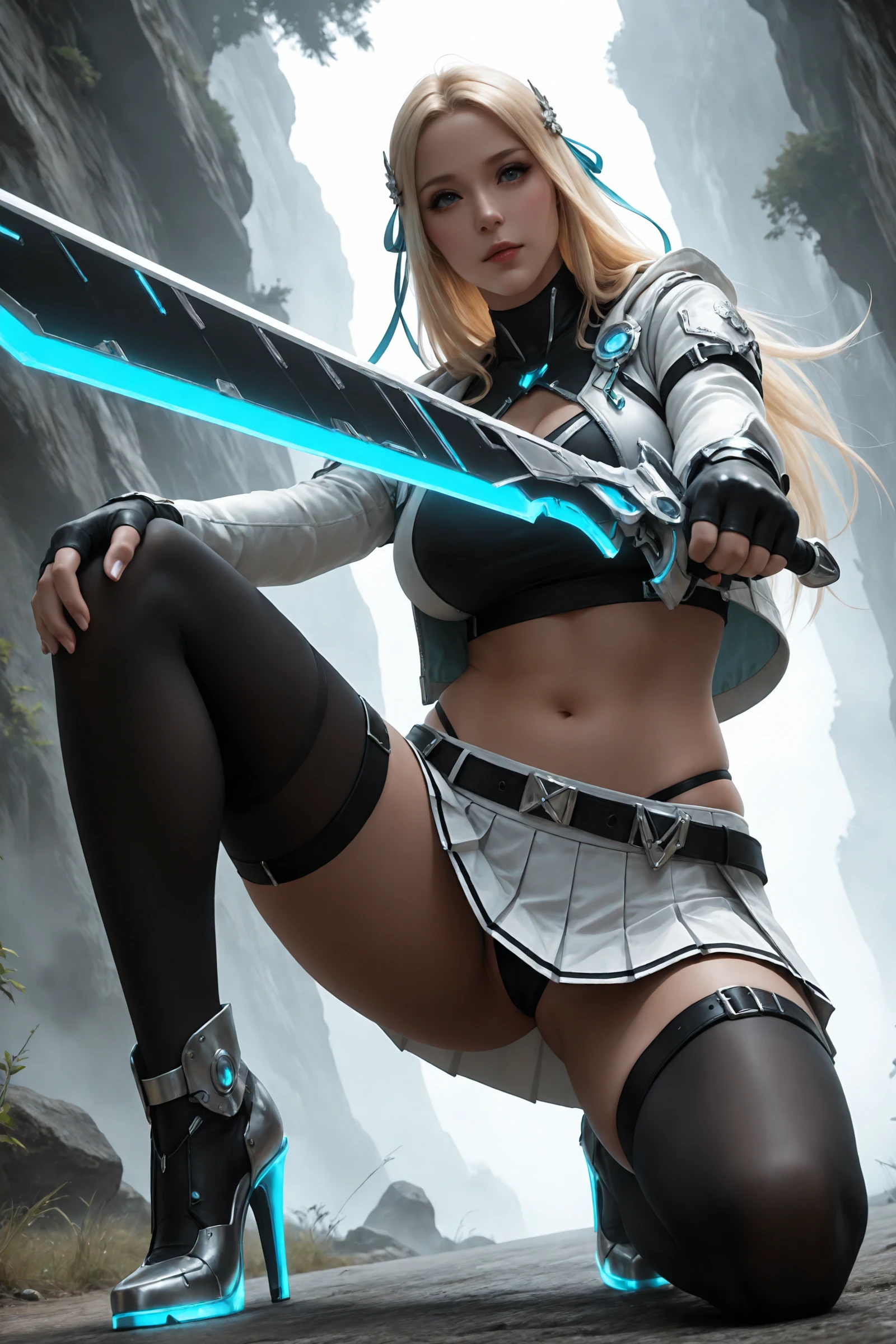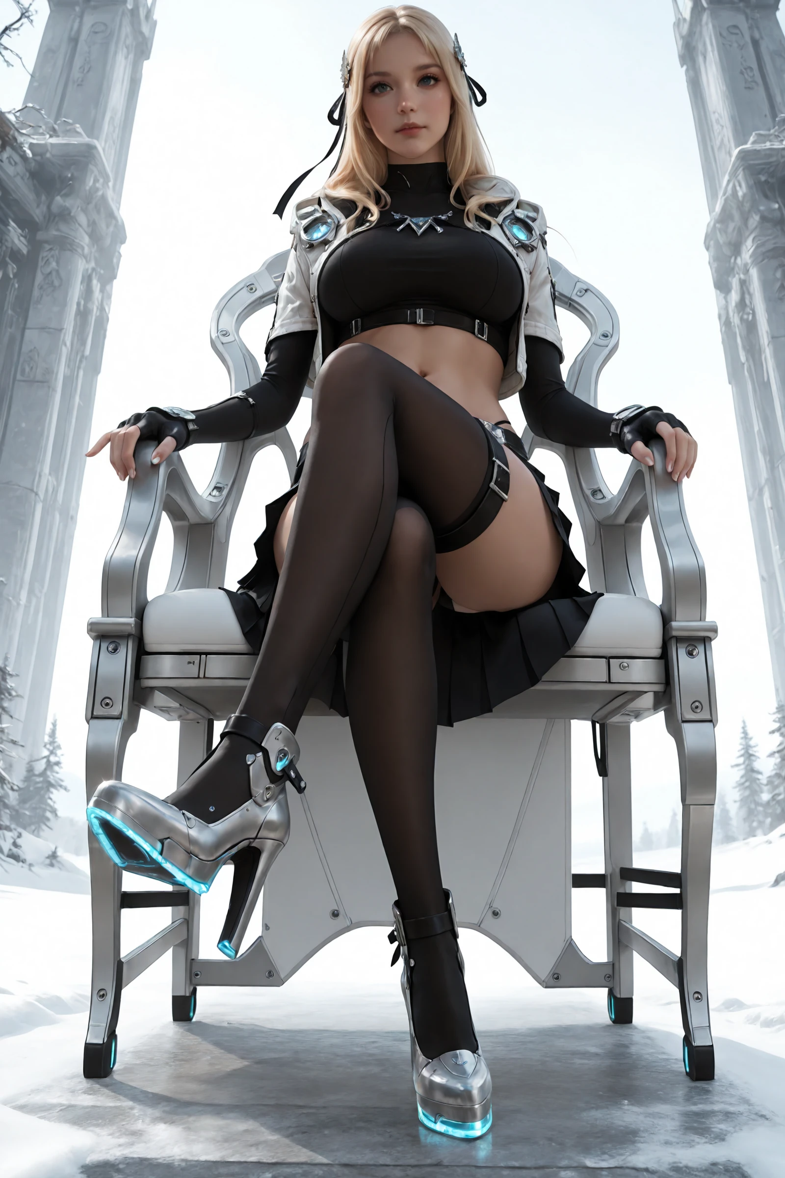blonde_hair,long_hair,hair_ribbon,hair_ornament, large_breasts,navel,midriff,open_jacket, jacket,crop_top,fingerless_gloves,belt,thong,pleated_skirt,thigh_belt,black_thighhighs, mechanical_footwear,high_heels,