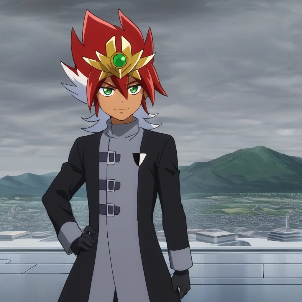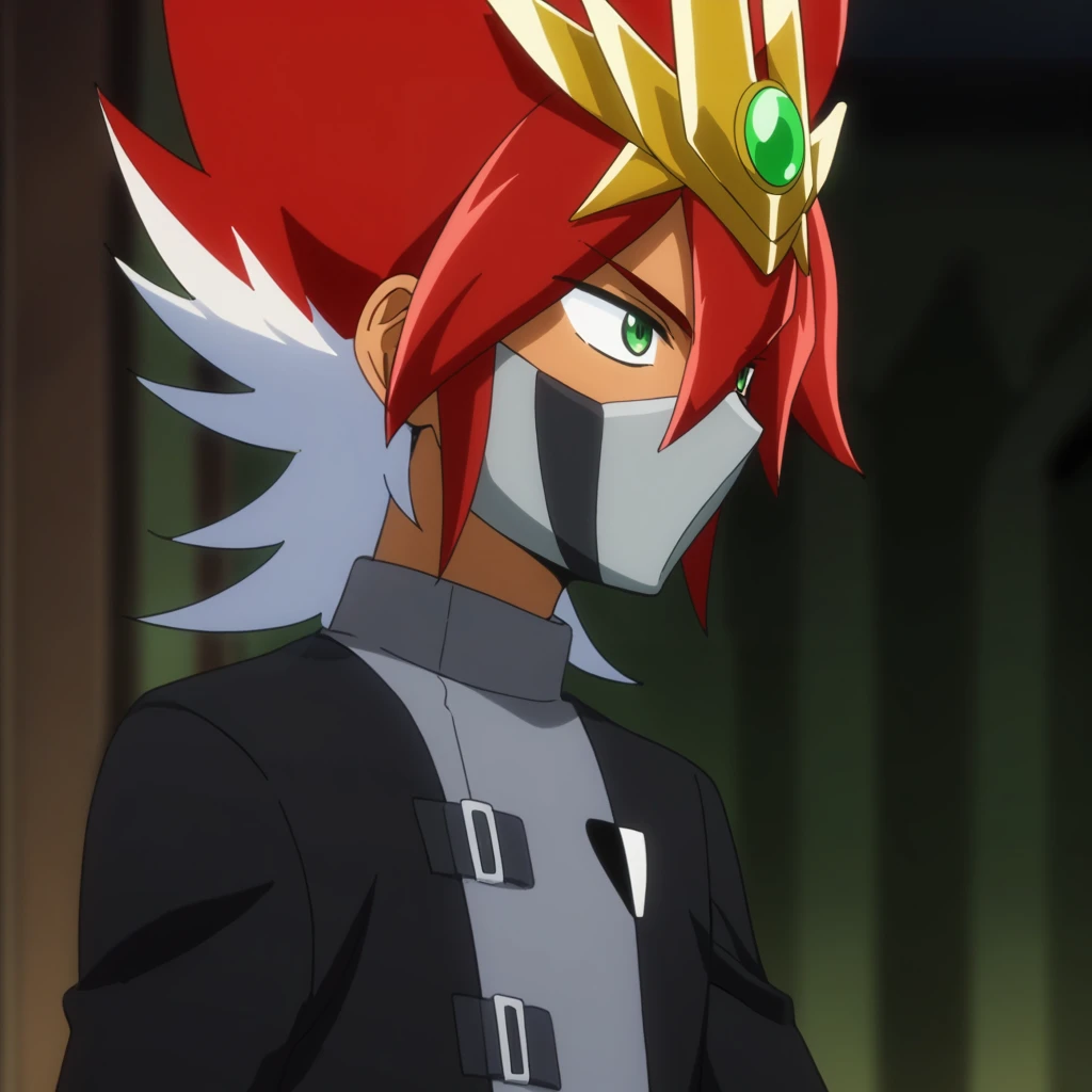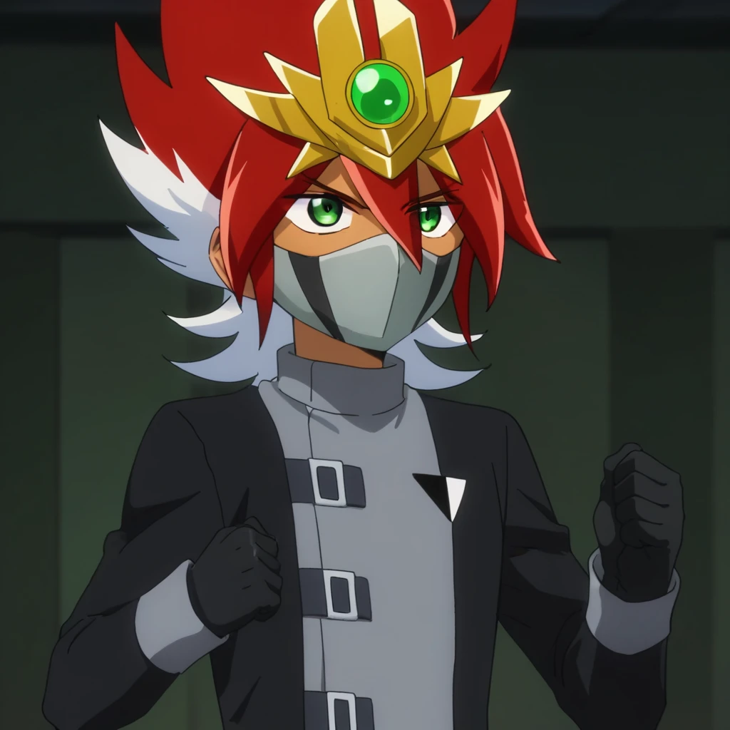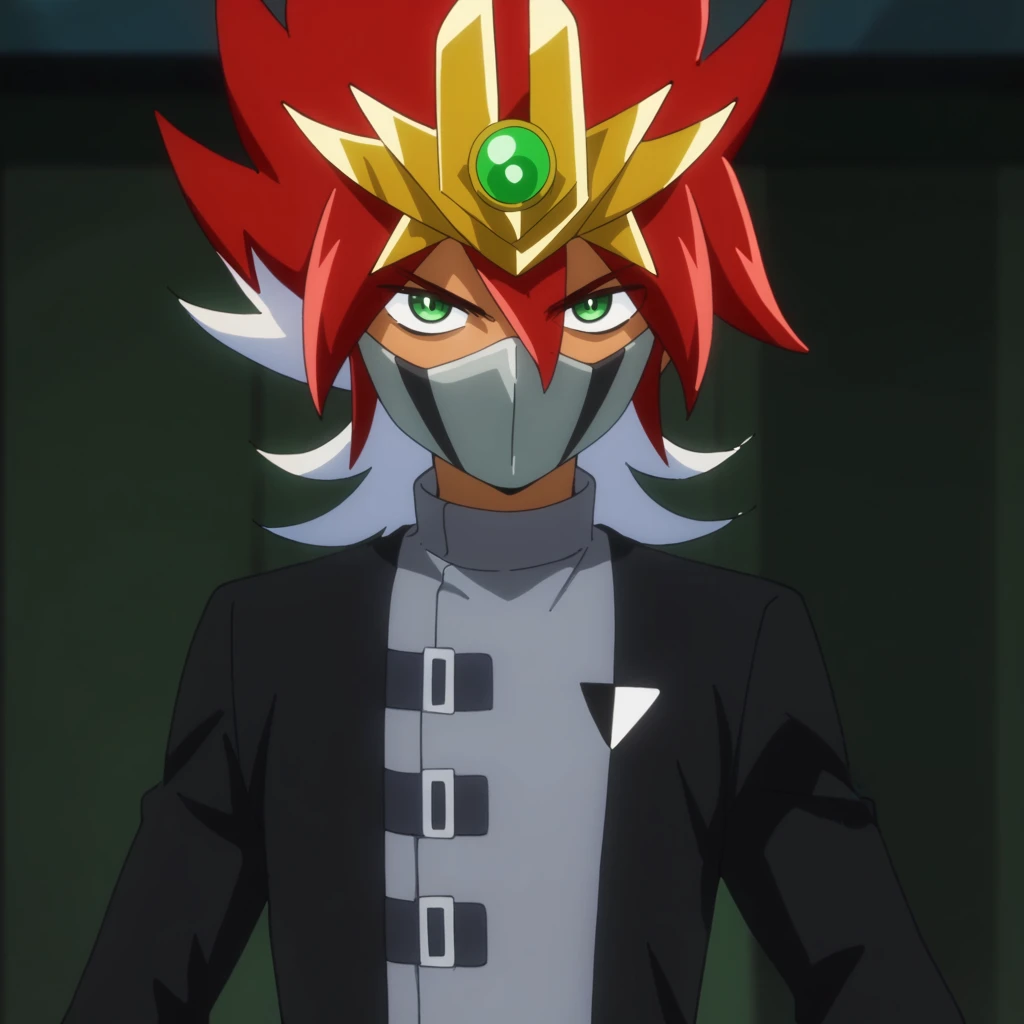 Prompts: male, tan skin, multicolored hair, two-tone hair, red hair, white hair, tiara, green eyes, mouth mask, coat, long sleeves, gloves, pants, boots