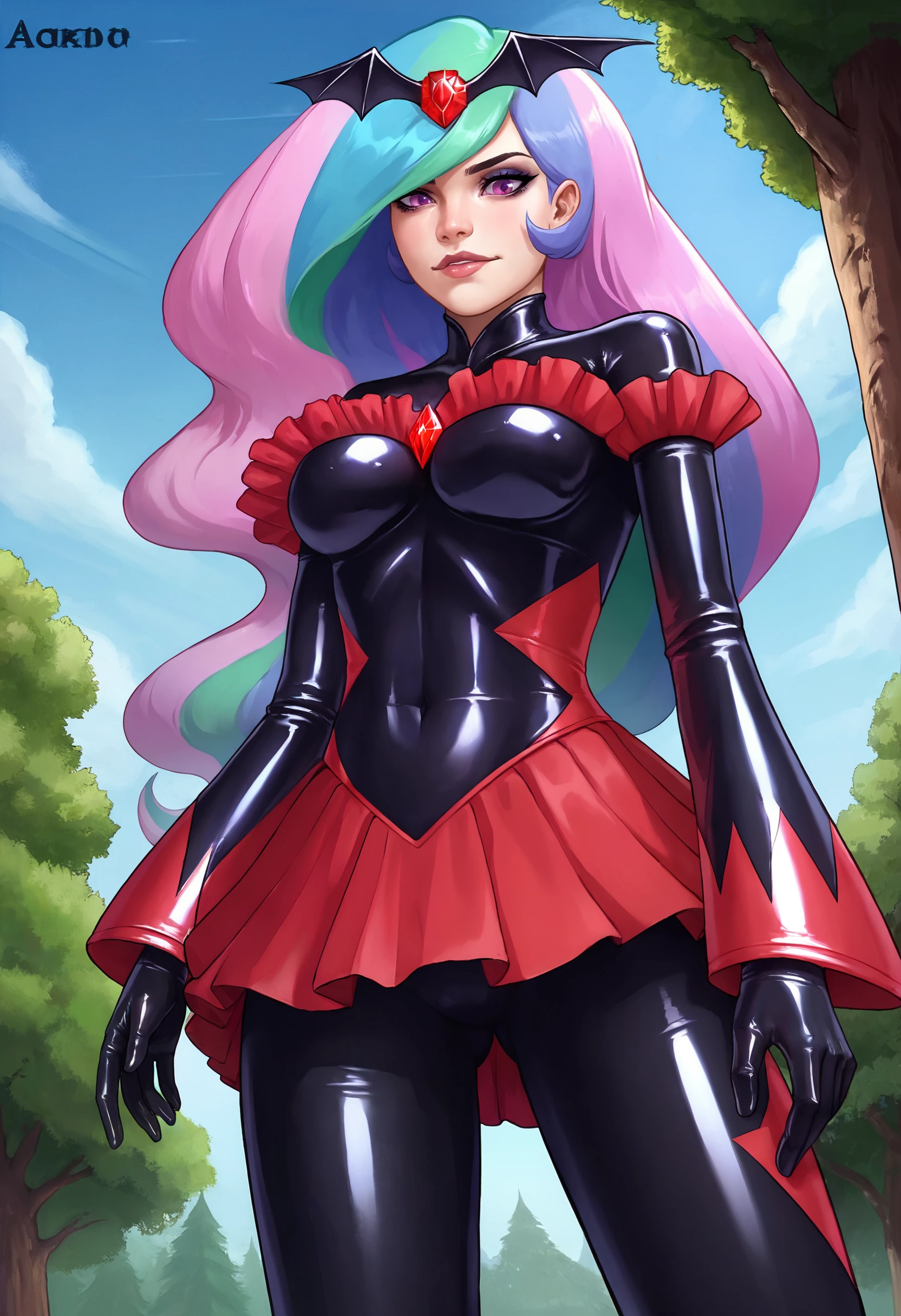 black badend-bodysuit, badend-tiara, red frills, red skirt, red gem