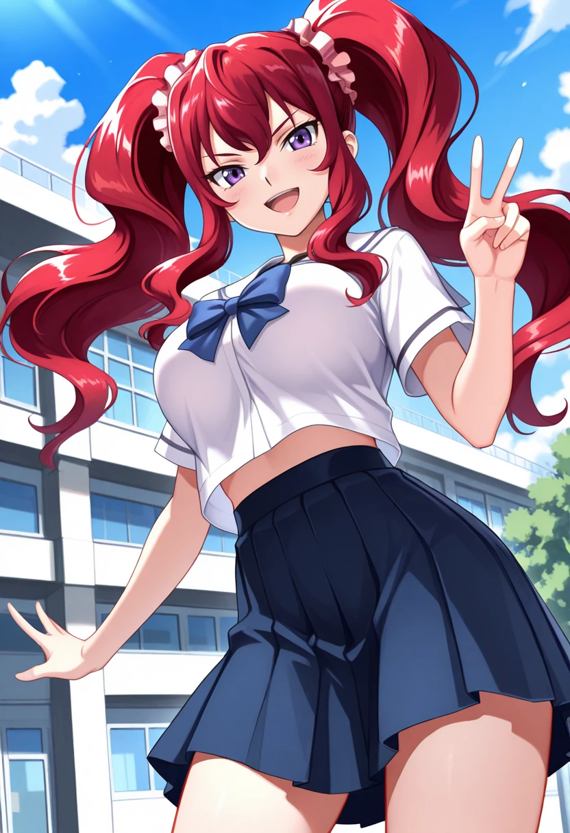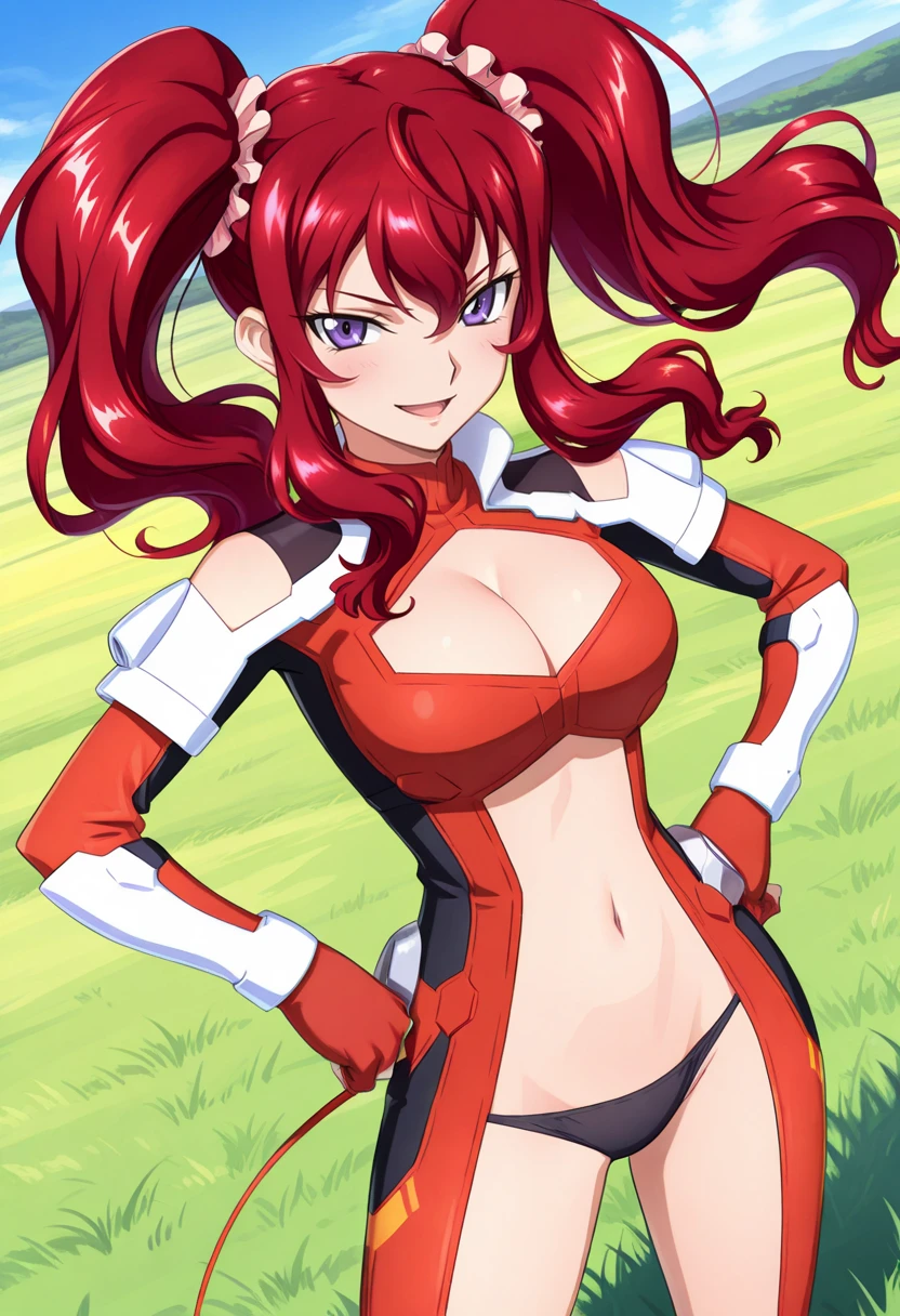 red bodysuit, detached sleeves, red fingerless gloves, cleavage cutout, navel cutout, black panties, bare thighs, large breasts, red hair, twintails, hair scrunchie, sidelocks, purple eyes, v-shaped eyebrows, tsurime