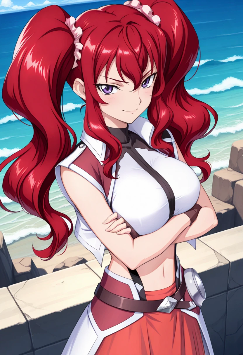 white jacket, sleeveless jacket, white shirt, brown fingerless gloves, suspender, red skirt, navel cutout, belt, white backskirt, red hair, twintails, hair scrunchie, sidelocks, purple eyes, v-shaped eyebrows, tsurime