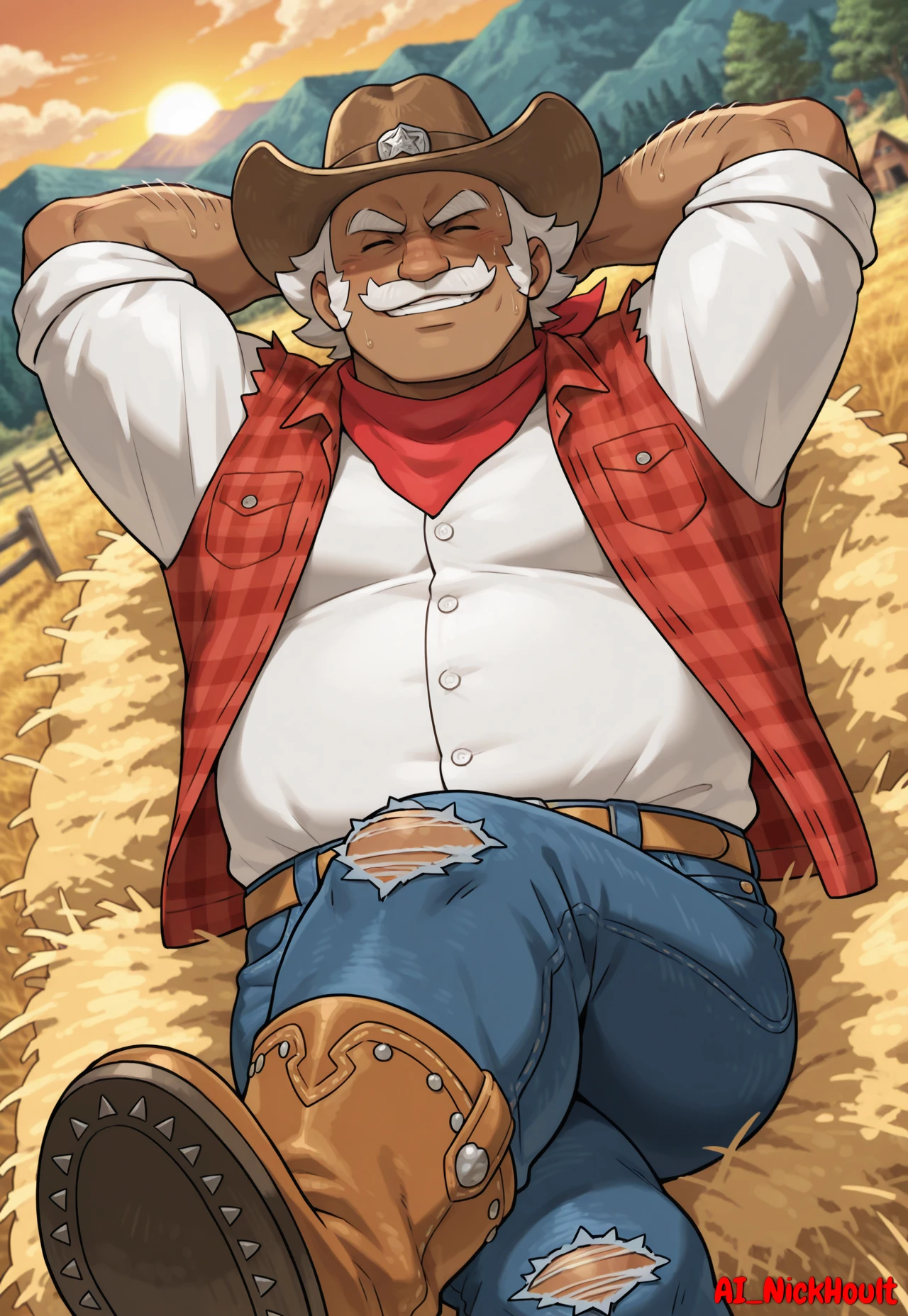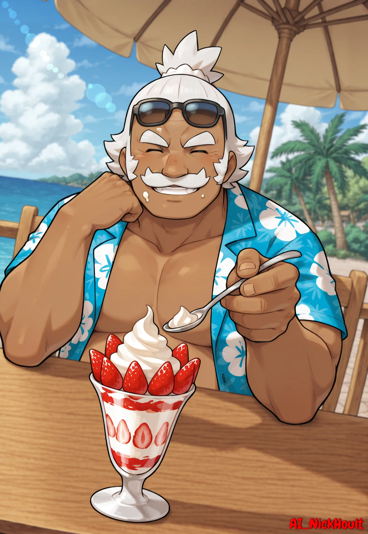 Hala, old man, chubby, muscular build, dark skin, spiky white hair, moustache, closed eyes,