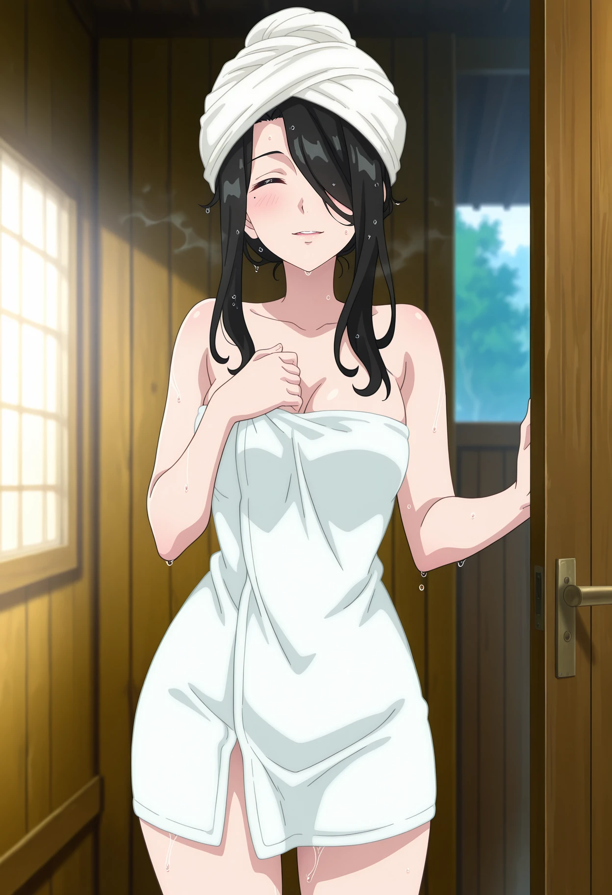 cleavage, medium breasts, naked towel, towel on head, white turban