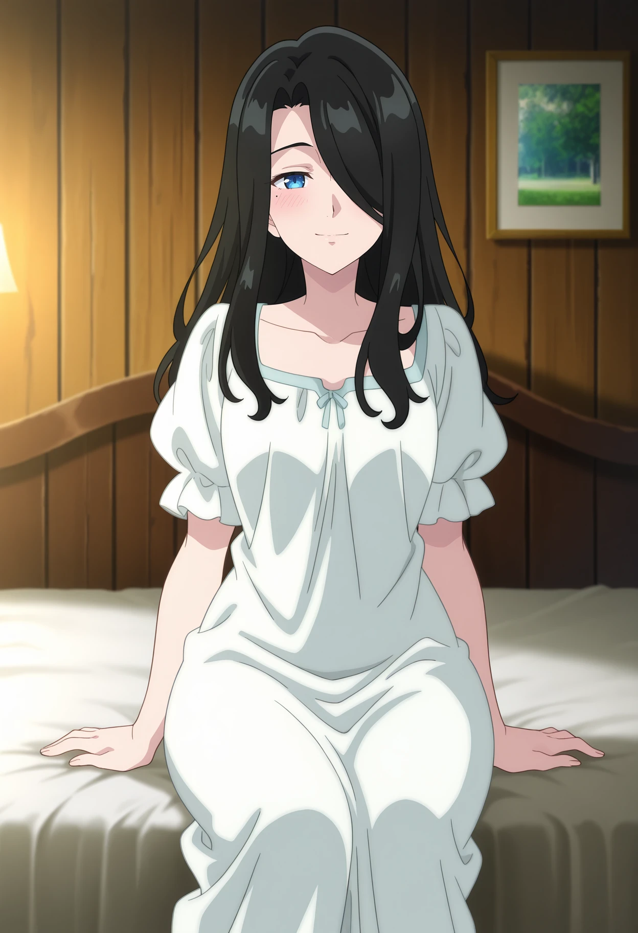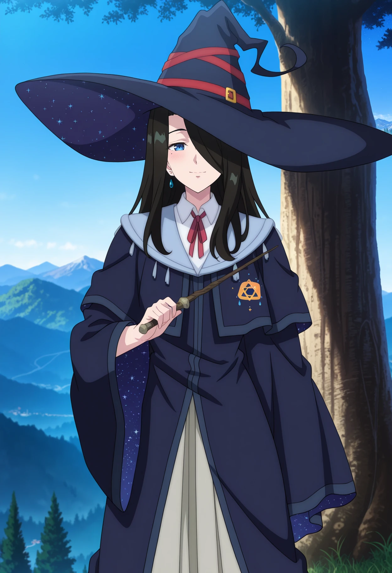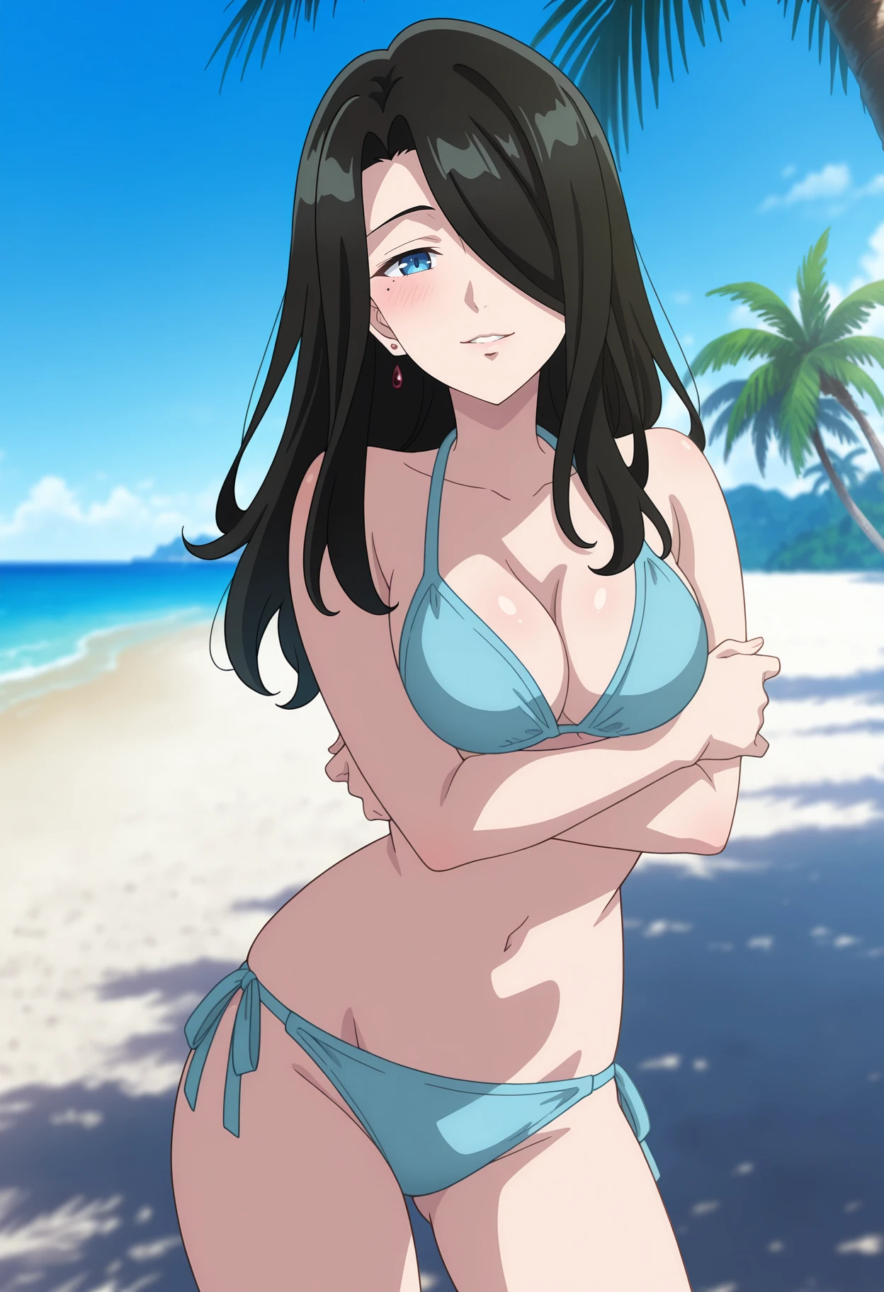 hair over one eye, long hair, black hair, blue eyes, mole under eye, single earring
