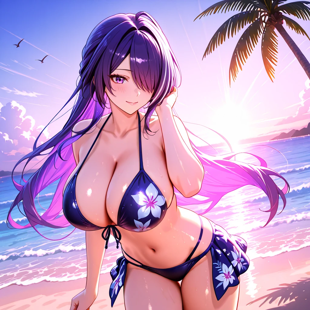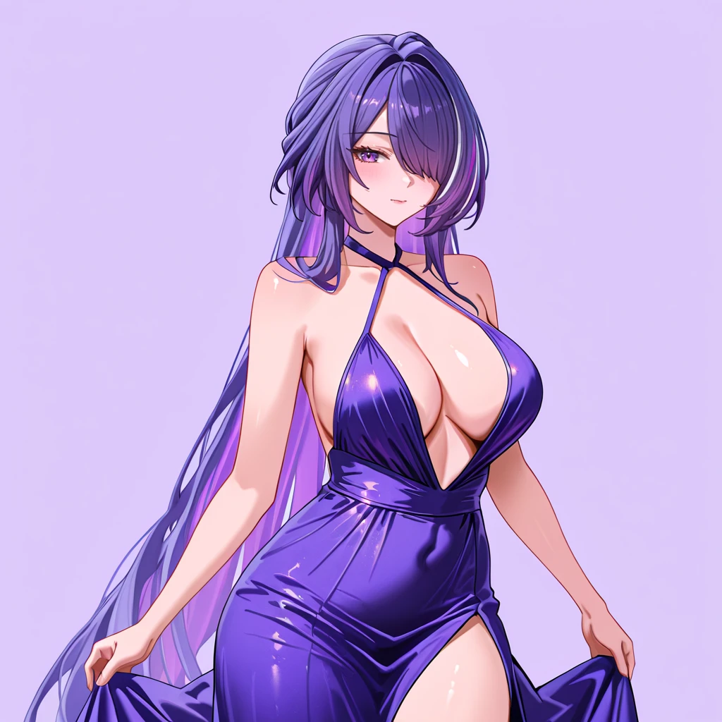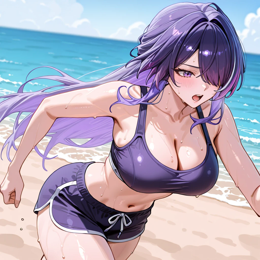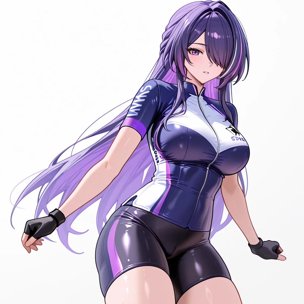 Trigger : Acheron, 1girl, crop top, breasts, hair over one eye, black gloves, cleavage, purple eyes, thighhighs, navel, black shorts, blue hair, single glove, long sleeves, choker, tattoo, midriff, purple hair, bangs, single thighhigh, multicolored hair, bare shoulders, belt, tattoo, chains, cowboy shot