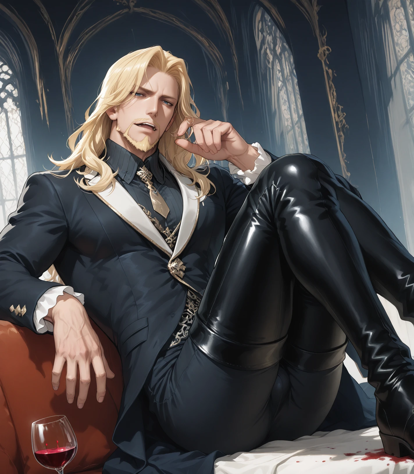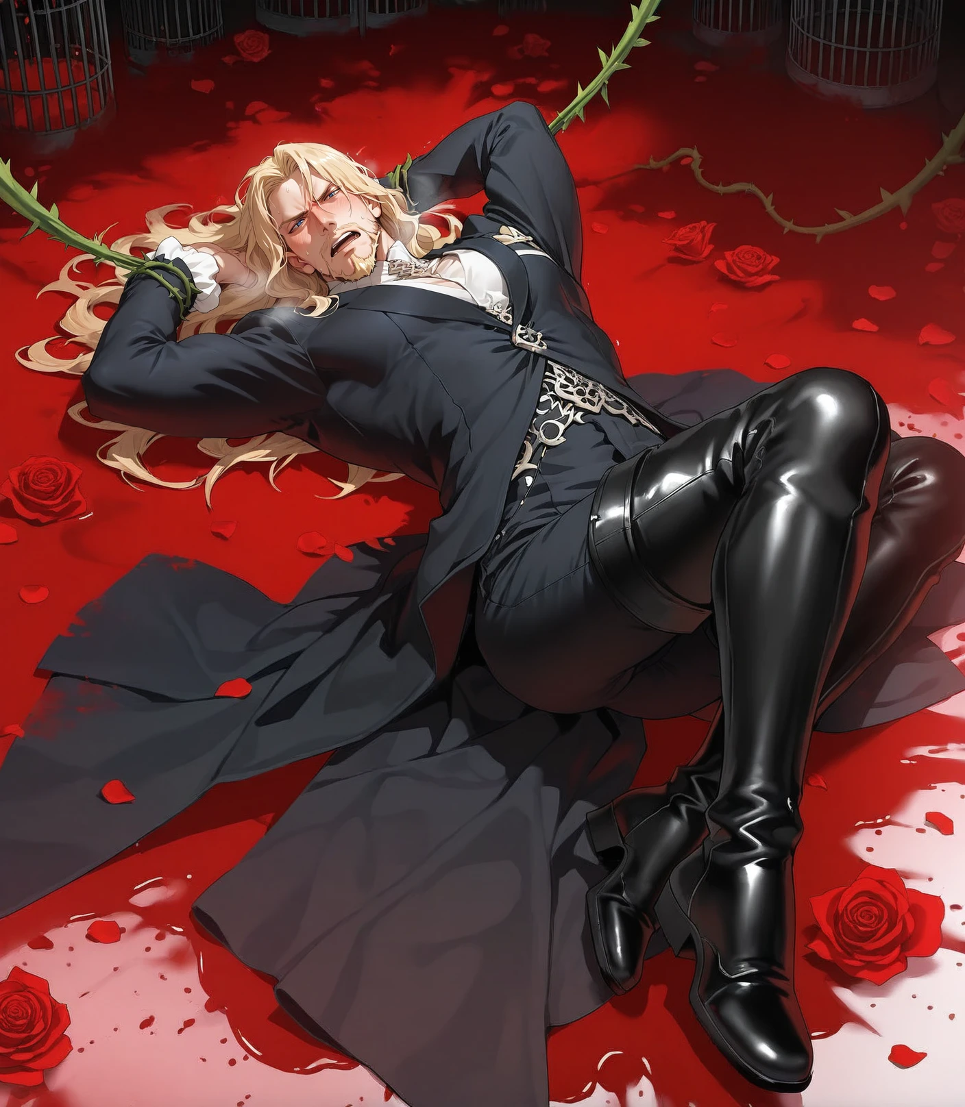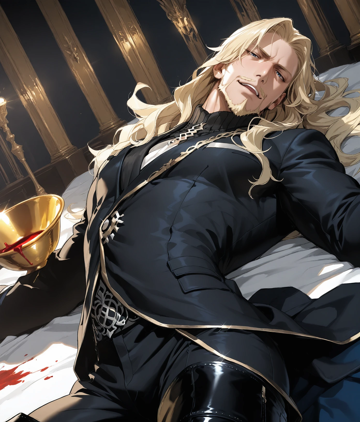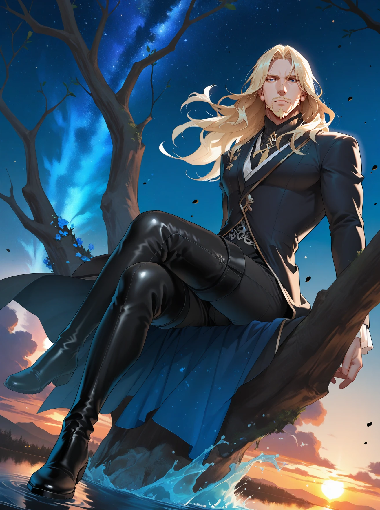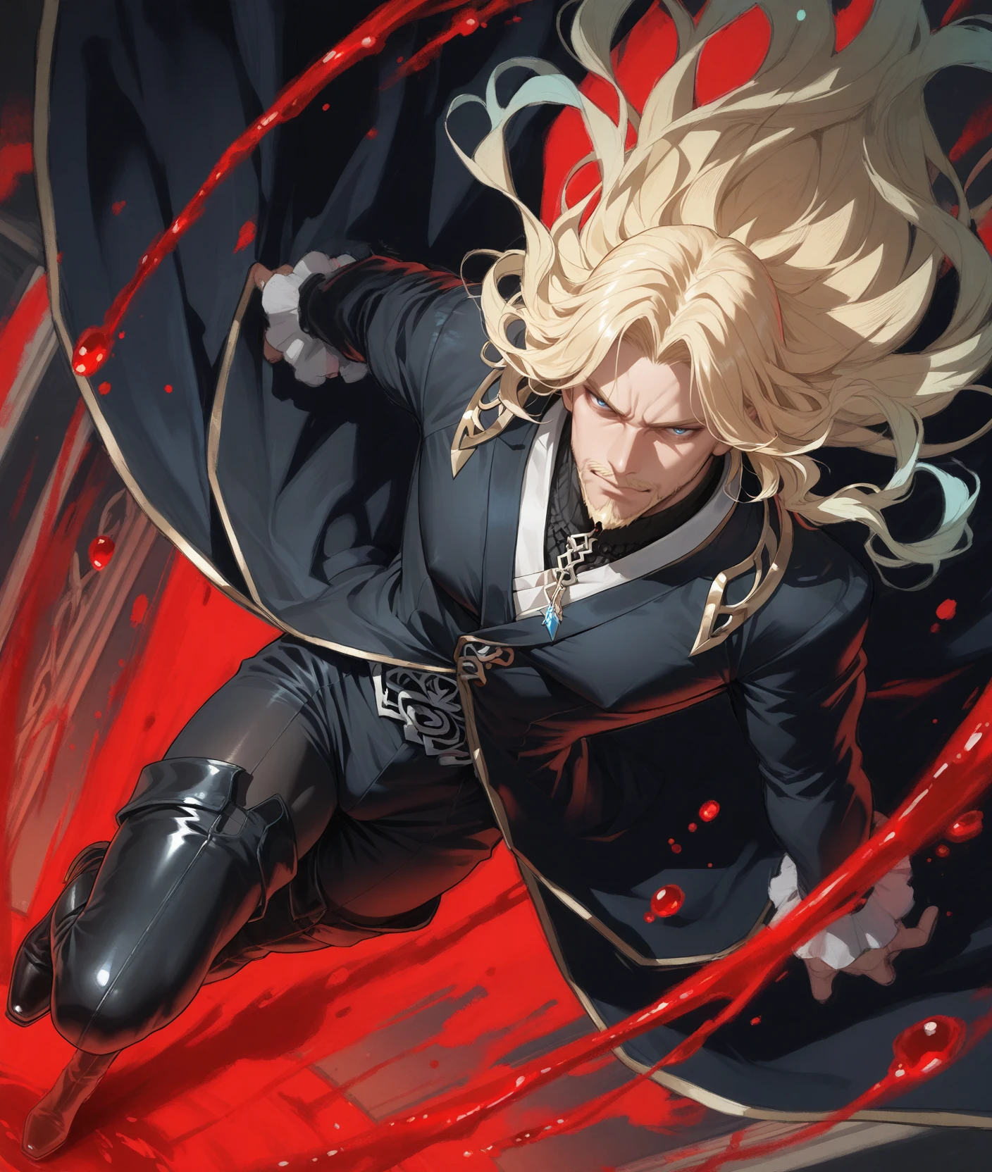 beard,black coat,black footwear,black pants,blonde hair,blue eyes,boots,thigh boots,facial hair,mustache,long hair,
