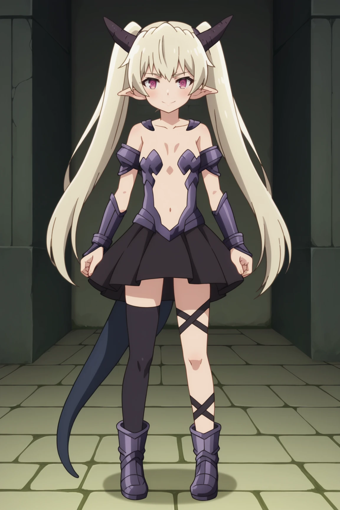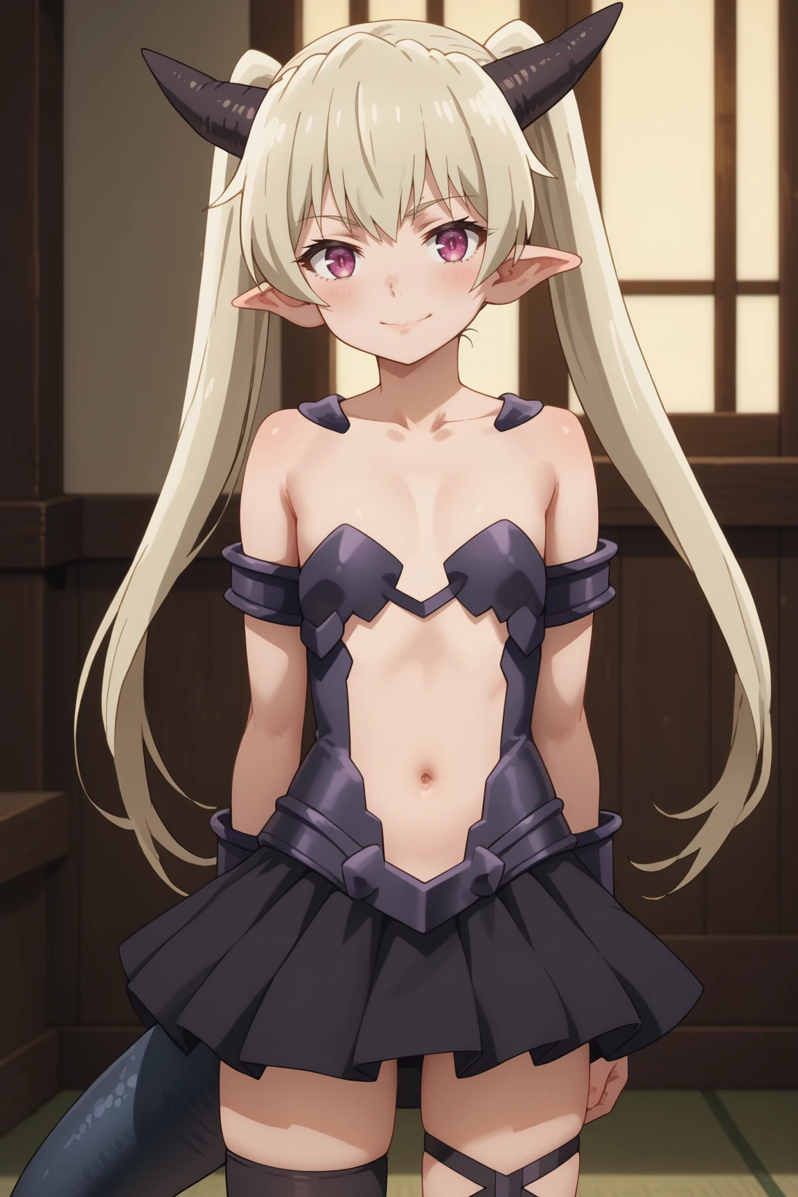 1girl, krebskulm, isekai maou to shoukan shoujo no dorei majutsu, purple eyes, twintails, pointy ears, dragon horns, dragon tail, dragon girl, outfit 1 (first outfit: