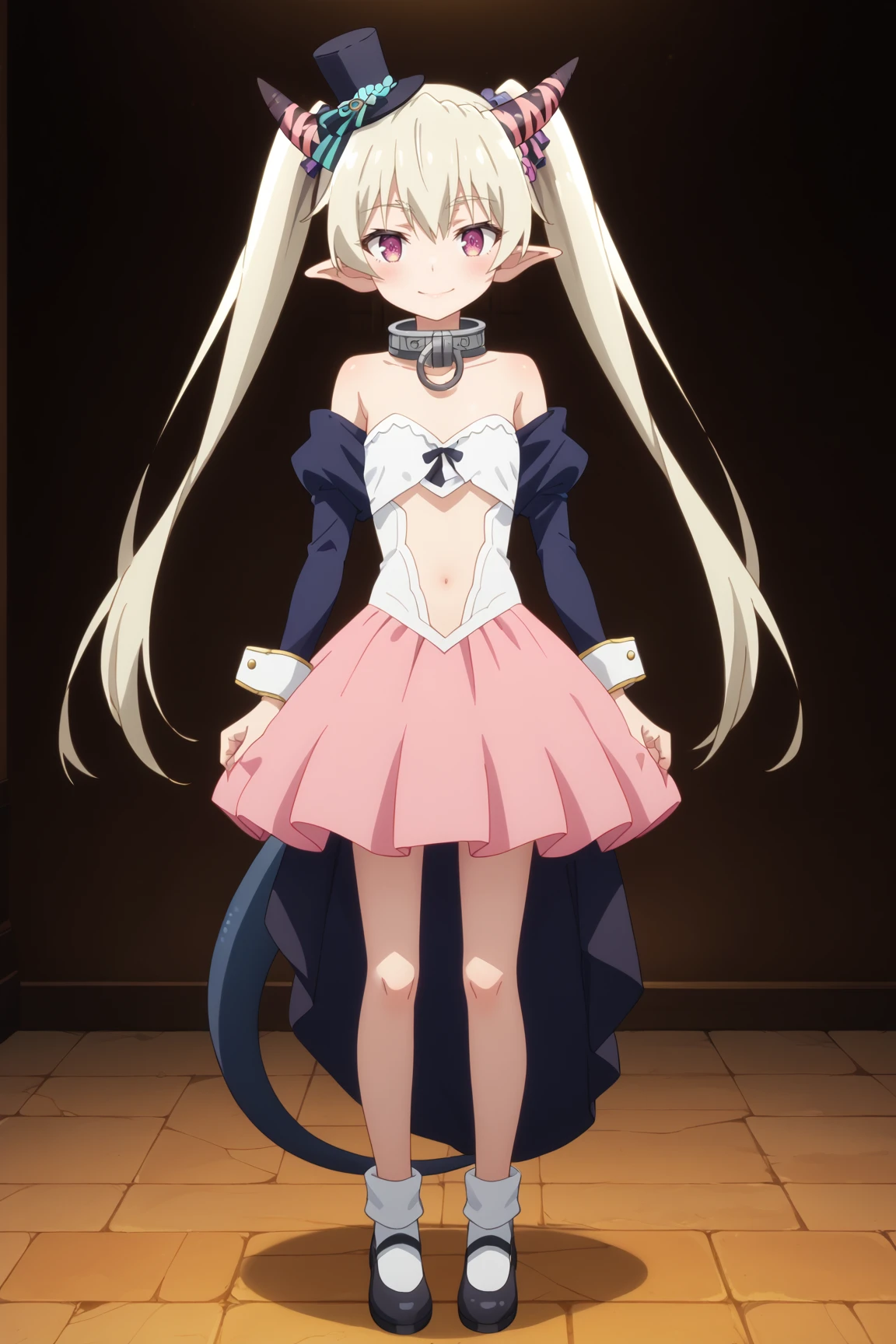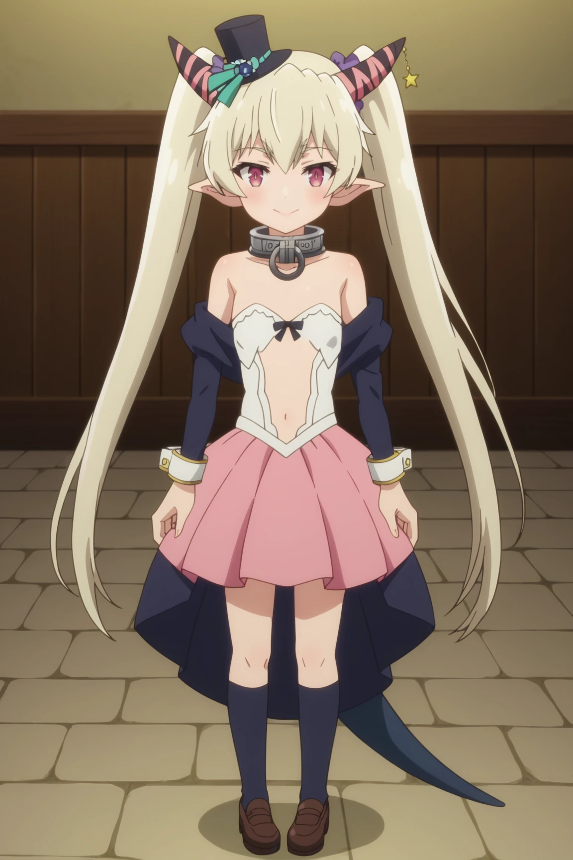 krumout2, mini top hat, metal collar, long sleeves, off shoulder, wrist cuffs, pink skirt,Quality tags for Pony Diffusion v6 and his variants: