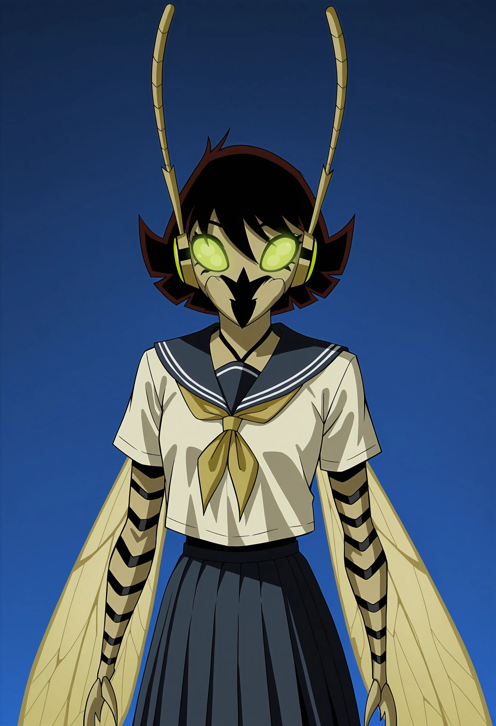 short hair, green eyes, glowing eyes, antennae, skirt, claws, insect wings