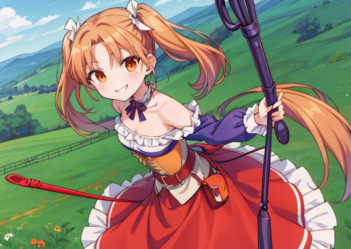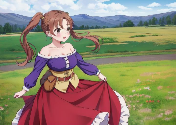 'Jessica Albert [Dragon Quest], 1girl, frilly red skirt, corset, purple shirt, bare shoulders, belt with pouches, short twintails' - Example prompt for her default outfit.