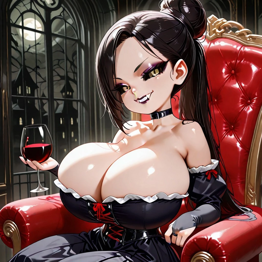 bosodusk, 1girl, vampire, fangs, black sclera, yellow eyes, huge breasts, hair bun, ponytail, brown hair, makeup,