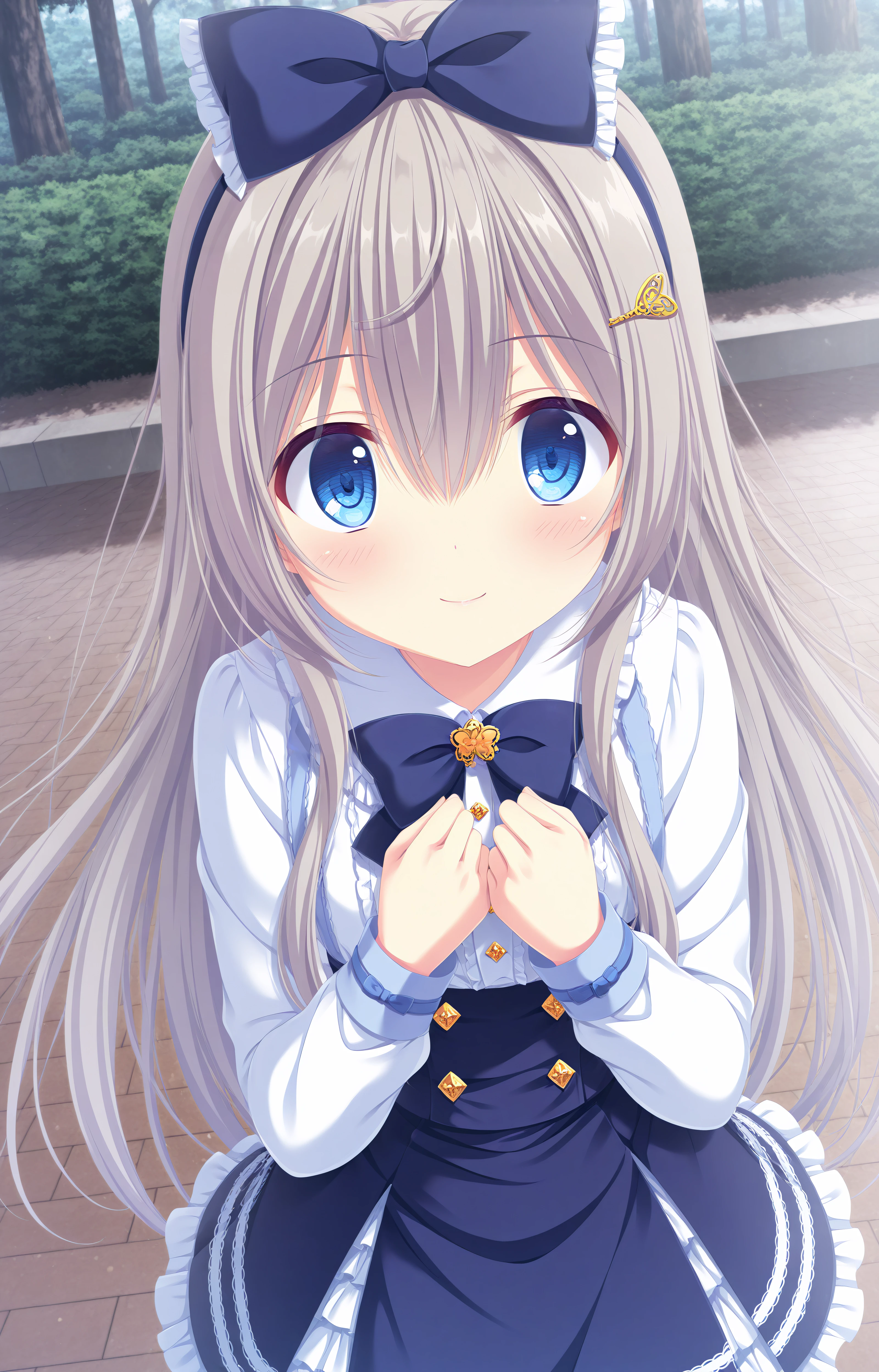 Uniform: Arisu, Uniform Arisu, very long hair, grey hair, blue eyes, bangs, hair between eyes, hairclip, heart hairclip, blue_hairband, hair ornament, school uniform,long sleeves,white uniform, dark_blue_low_hair_bow, sailor uniform, white sailor collar, blue trim, double-breasted uniform, gold buttons, white skirt, pleated skirt, white thighhighs, light_blue_bow_thighhighs, (yellow_chest_ribbon:1.3), (blue_back_bow:1.3)