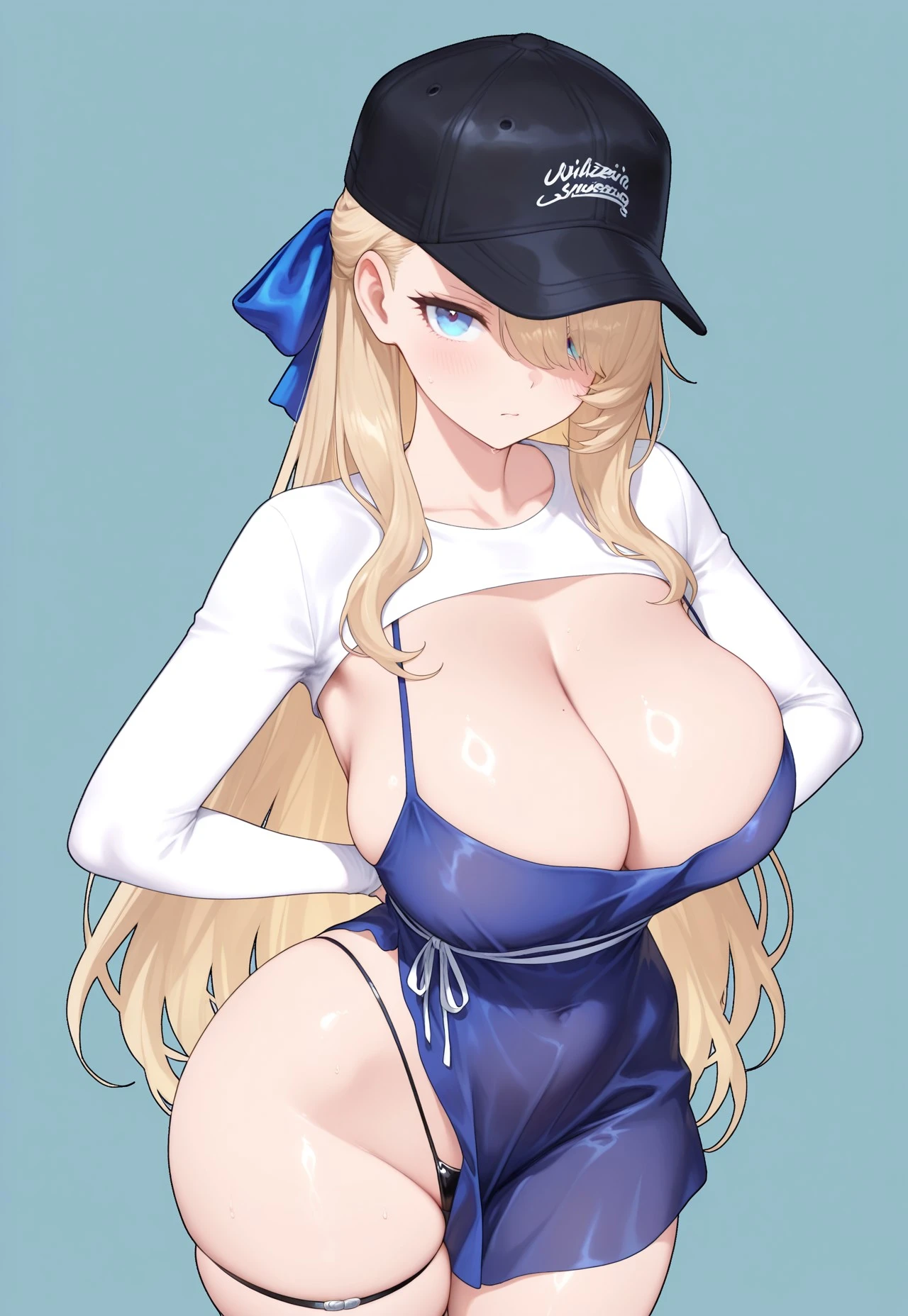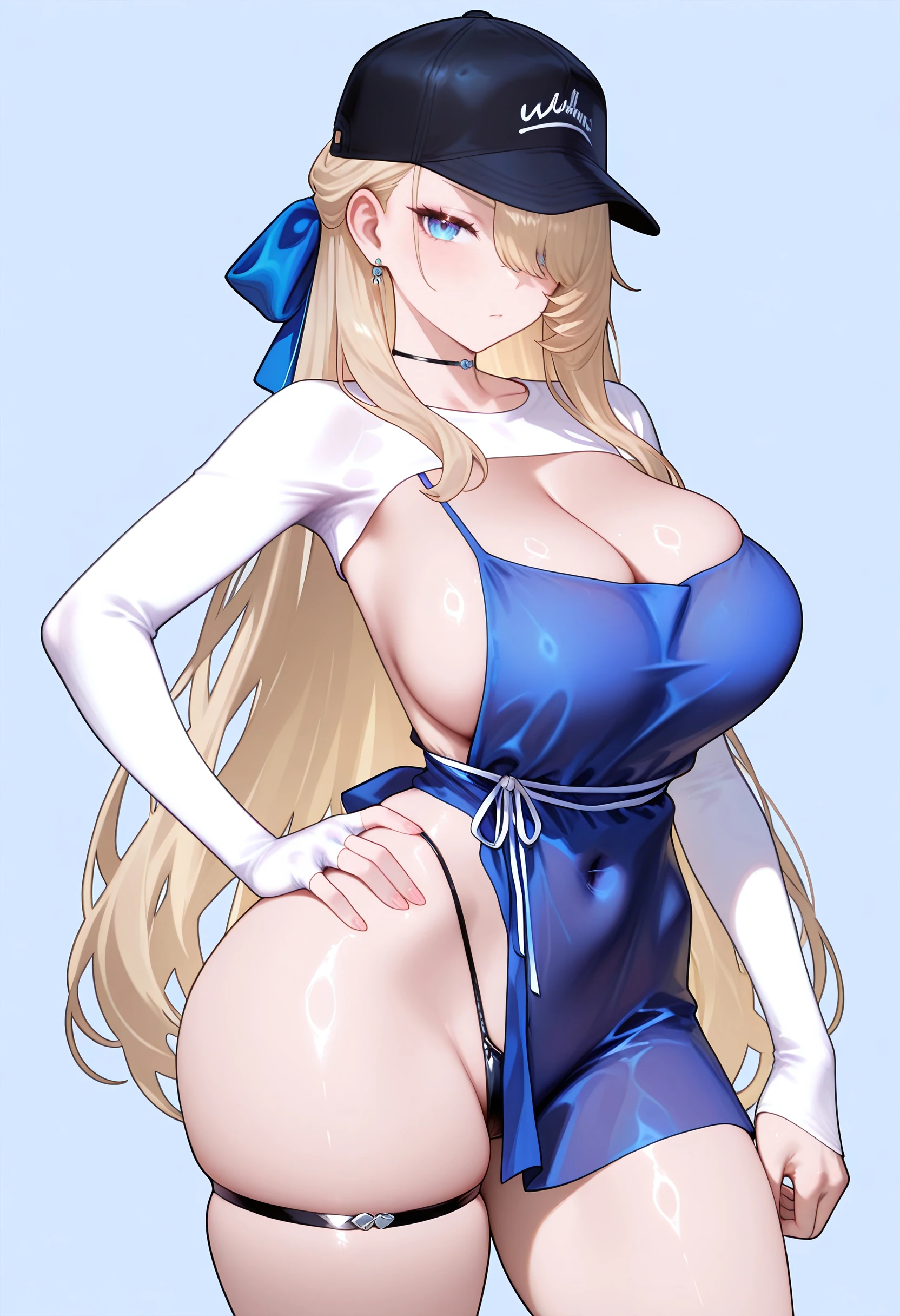 wilhelmina-WQ, large breasts, blue eyes, hair over one eye, long hair, blonde hair, black baseball cap, blue hair ribbon, white bolero shrug, blue apron dress, cleavage, white waist string, black thigh strap, black thong, white sandal,