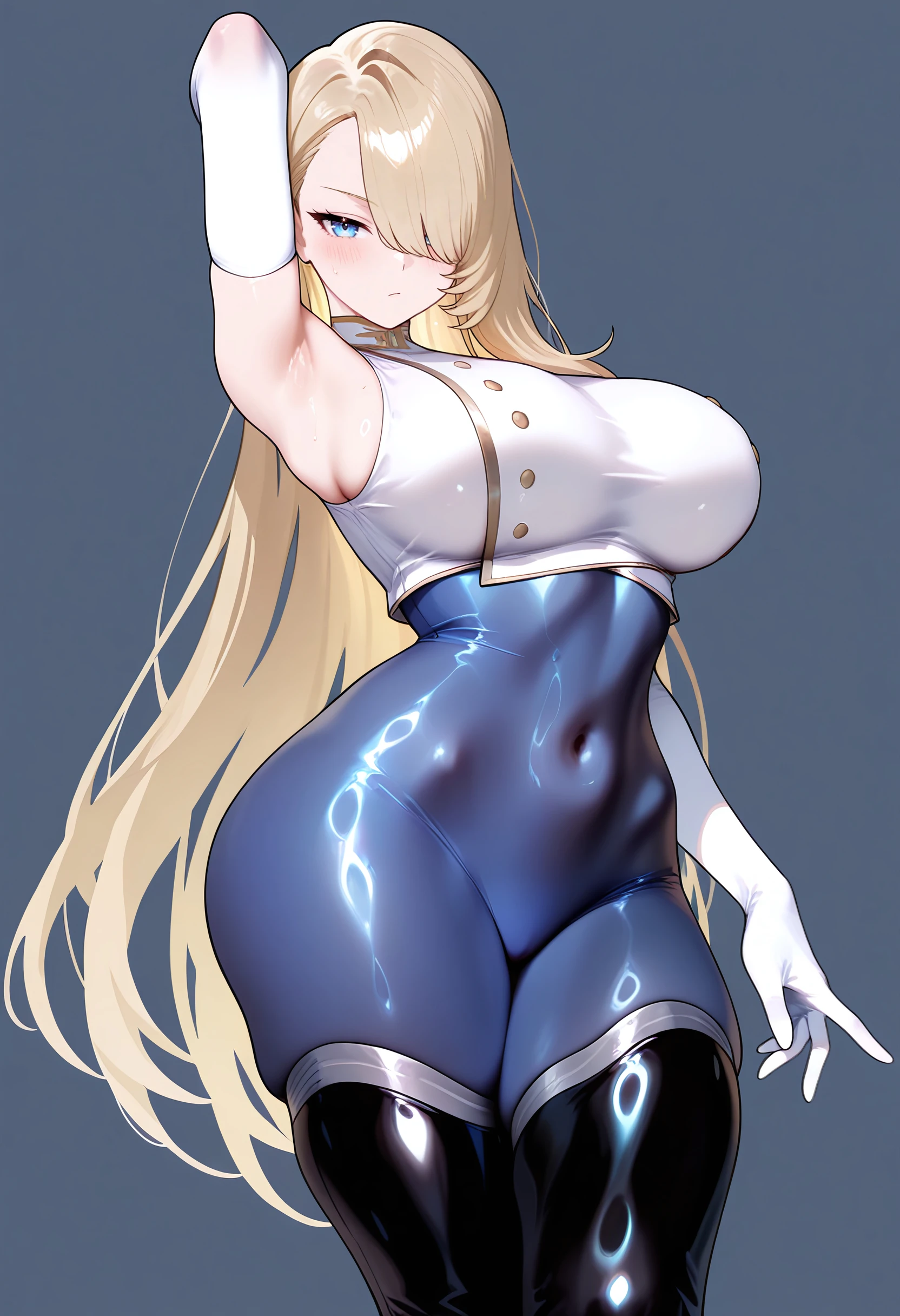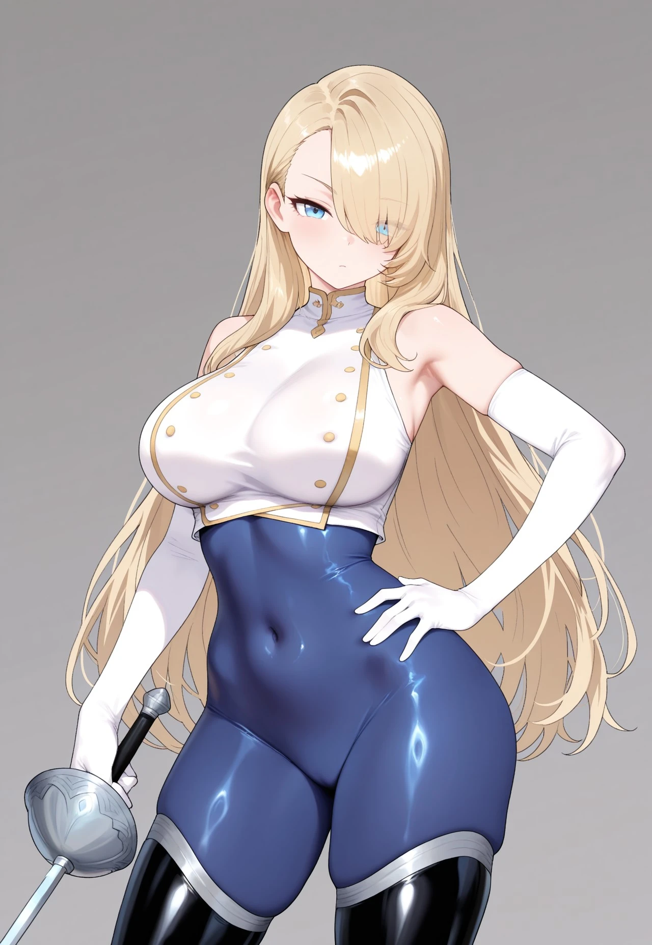wilhelmina-SL, large breasts, blue eyes, hair over one eye, long hair, blonde hair, white sleeveless crop_top, gold buttons, white elbow gloves, blue bodysuit bottoms, black thigh high boots,