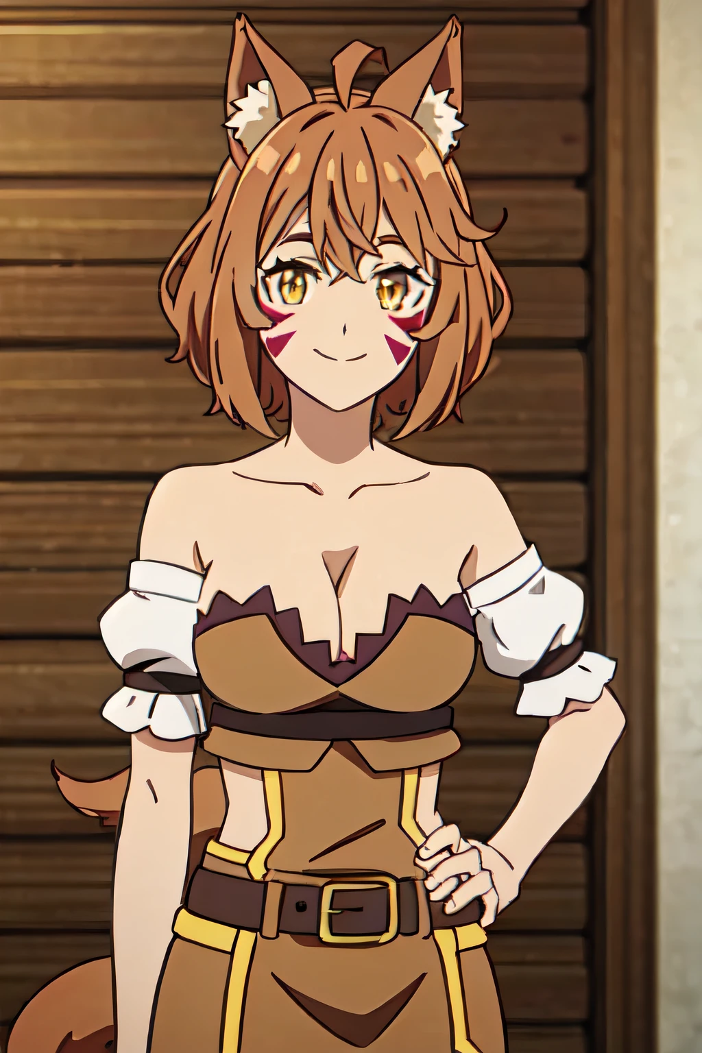 BROWN HAIR, SHORT HAIR, AHOGE, YELLOW EYES, ANIMAL EARS, FACIAL MARK, MEDIUM BREASTS