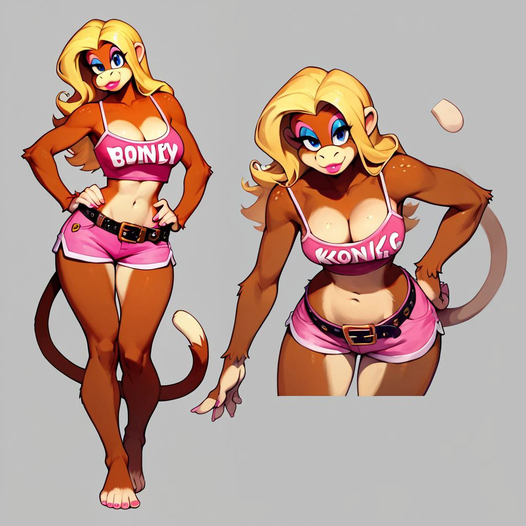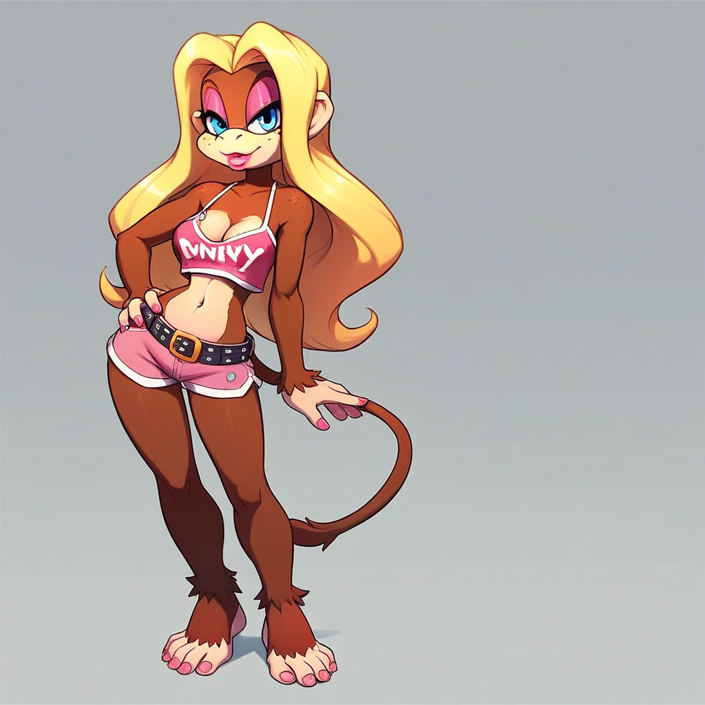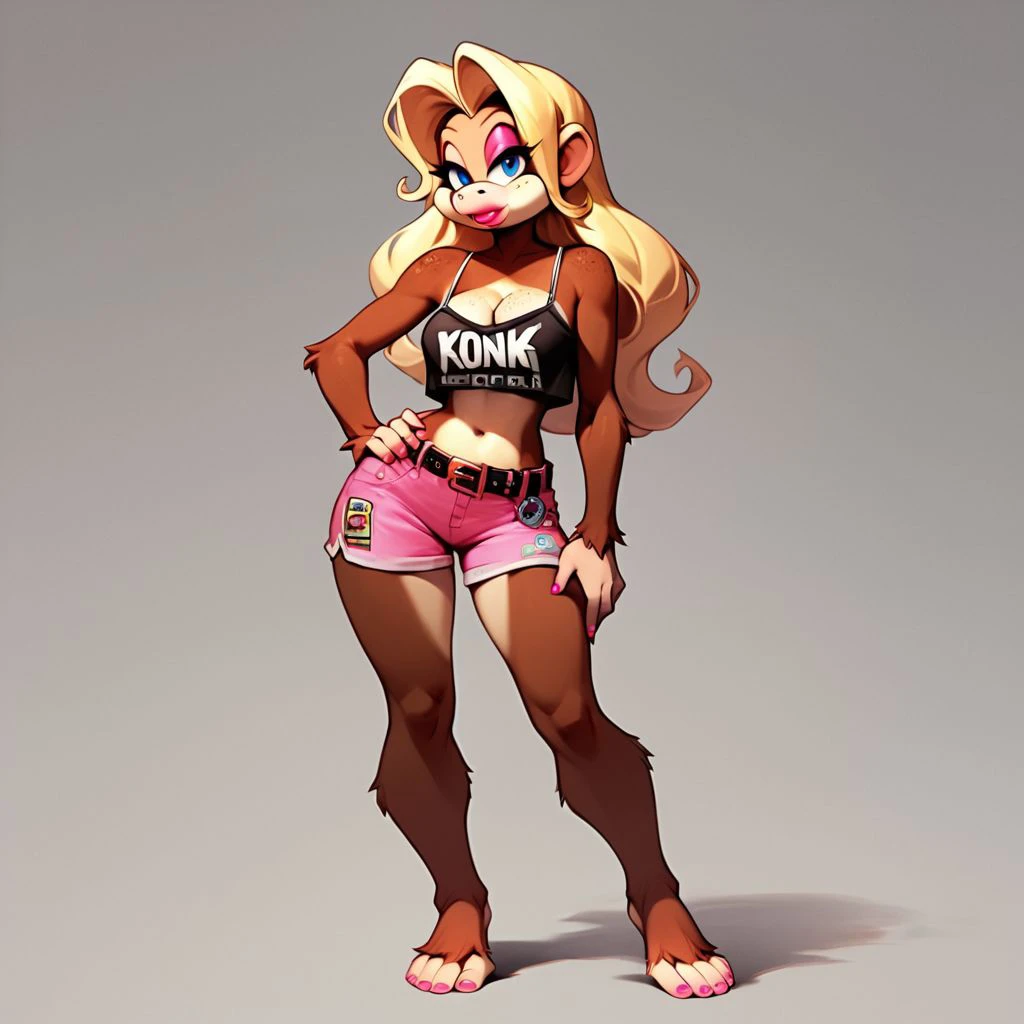 score_9, score_8_up, score_7_up, score_6_up, 1girl, solo, furry, anthro, monkey, Candy Kong, Donkey Kong, long hair, breasts, looking at viewer, blue eyes, blonde hair, navel, cleavage, bare shoulders, medium breasts, standing, full body, shorts, barefoot, midriff, belt, grey background, nail polish, lips, crop top, hand on hip, short shorts, makeup, toes, colored skin, lipstick, clothes writing, furry, pink nails, eyeshadow, freckles, toenails, pink lips, furry female, toenail polish, spaghetti strap, pink shortsPrompt (Negative)