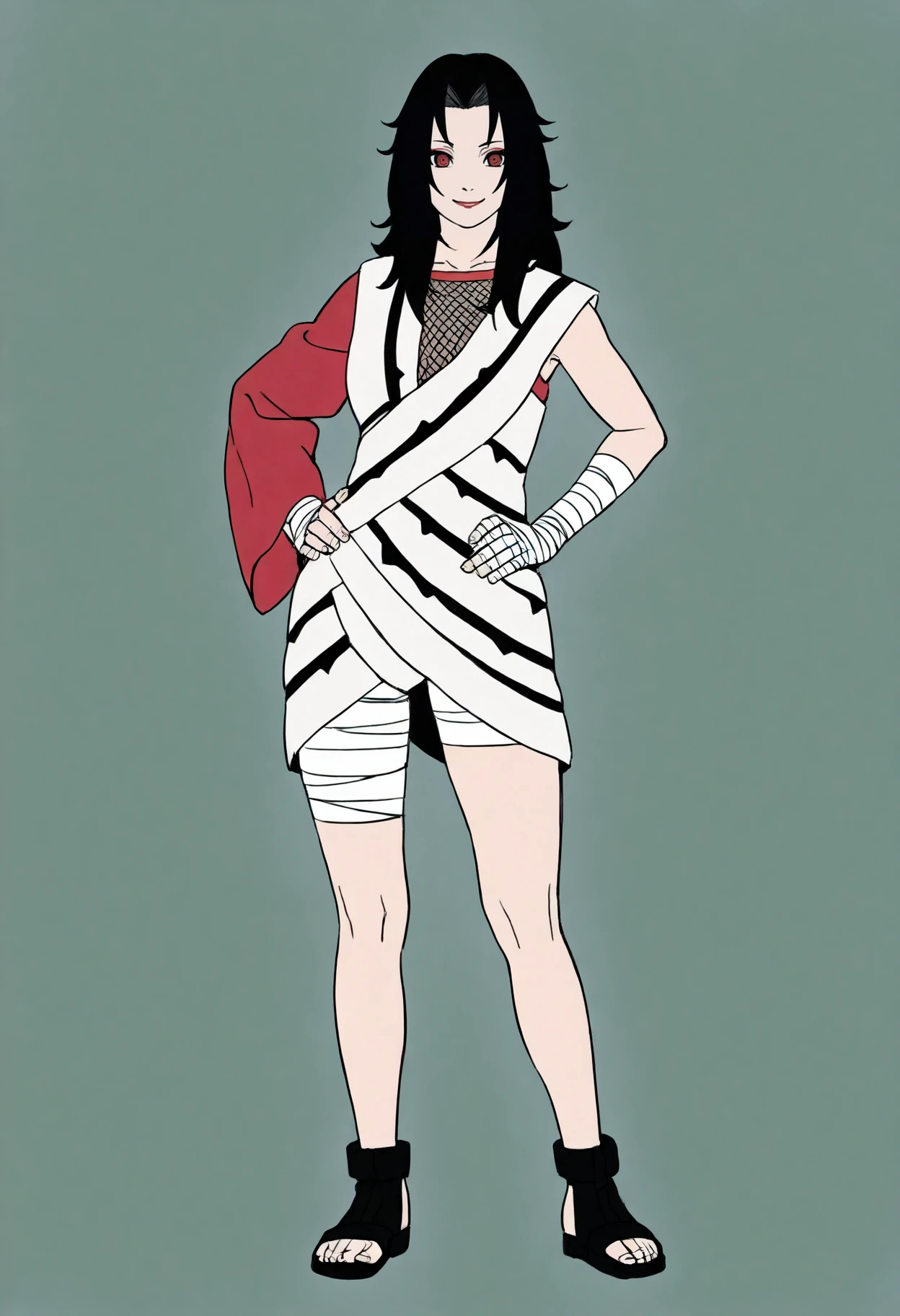Outfit prompts : forehead protector, bandaged arm, bandages, fishnet top, toeless footwear, asymmetrical clothes, single sleeve