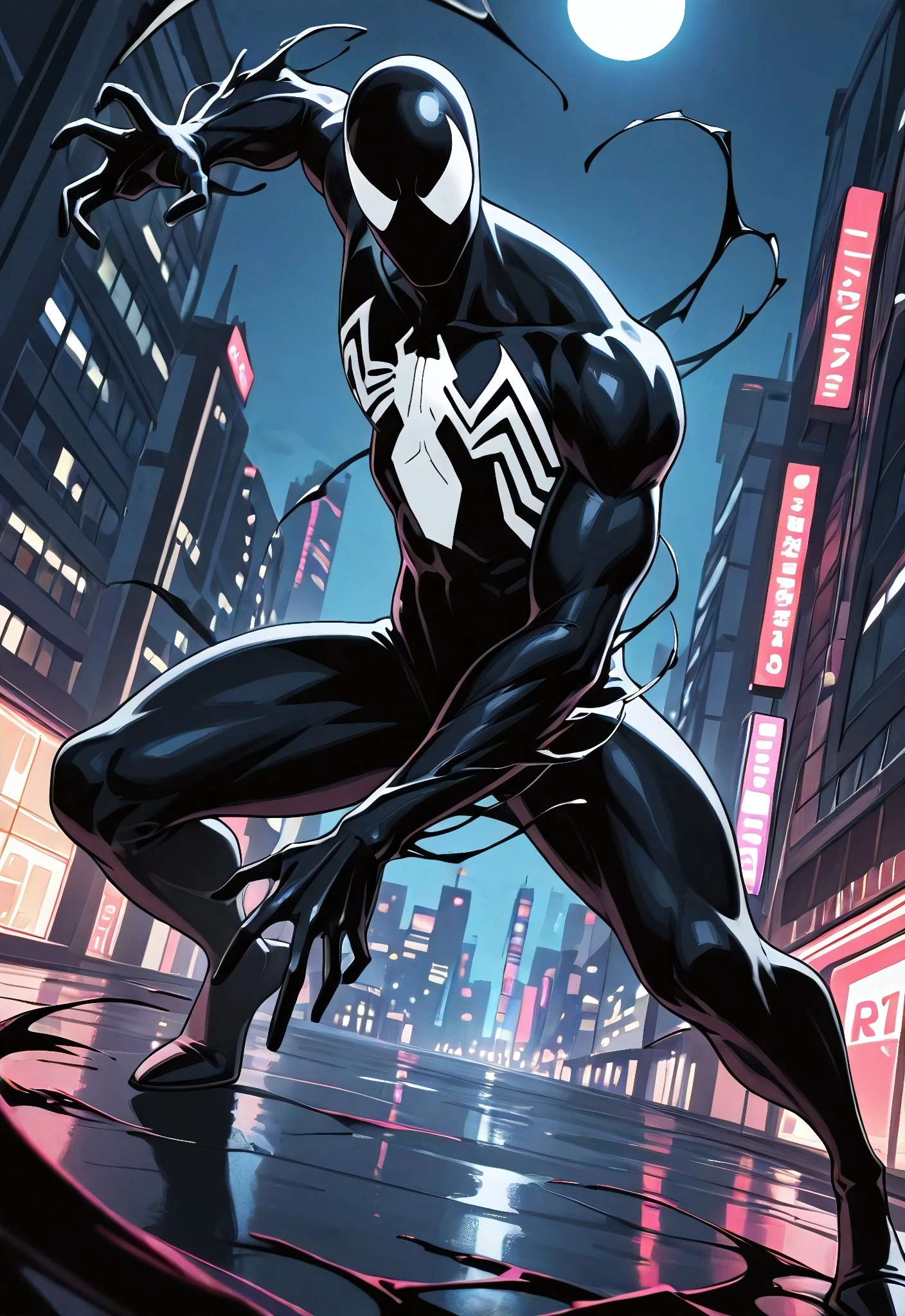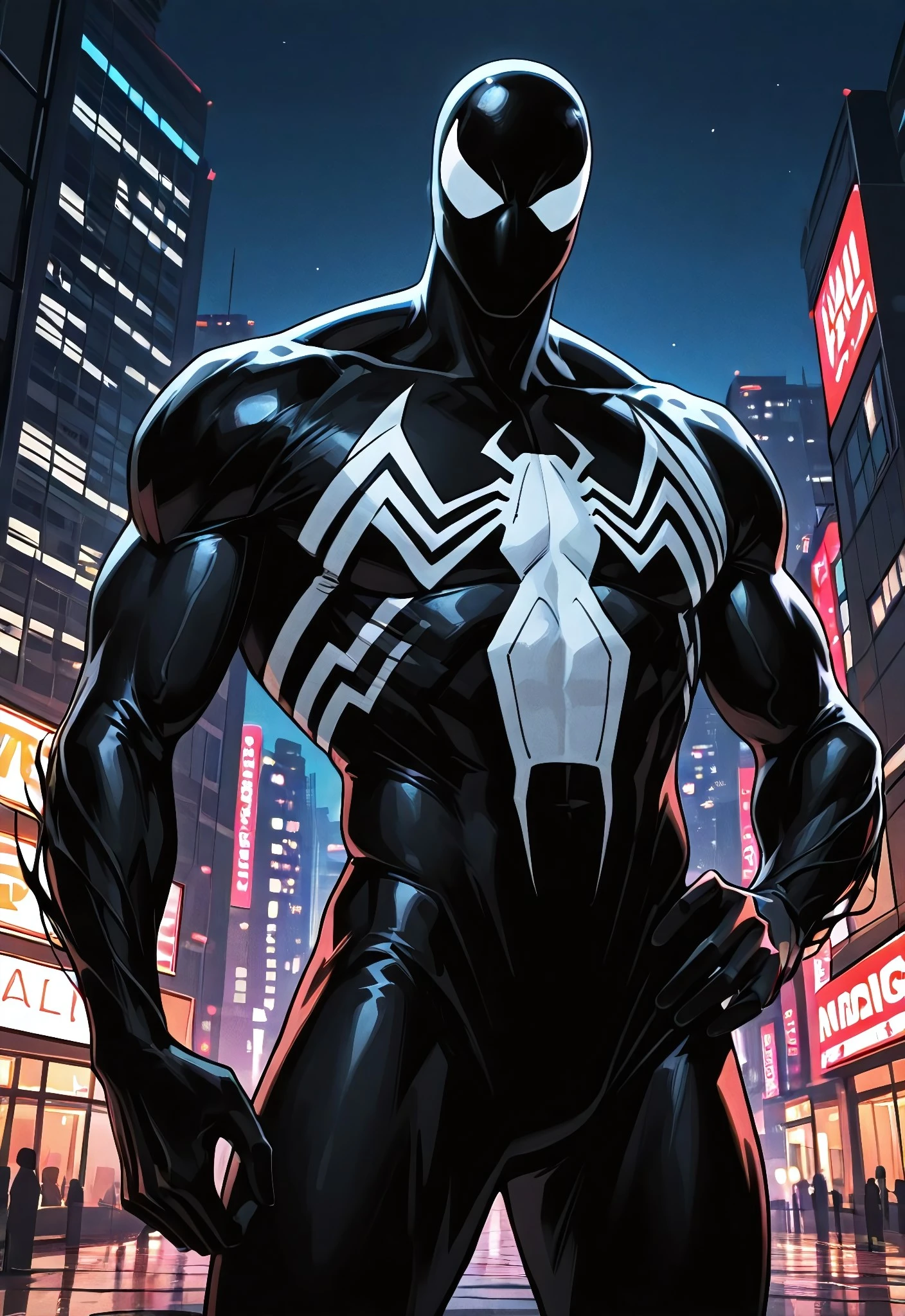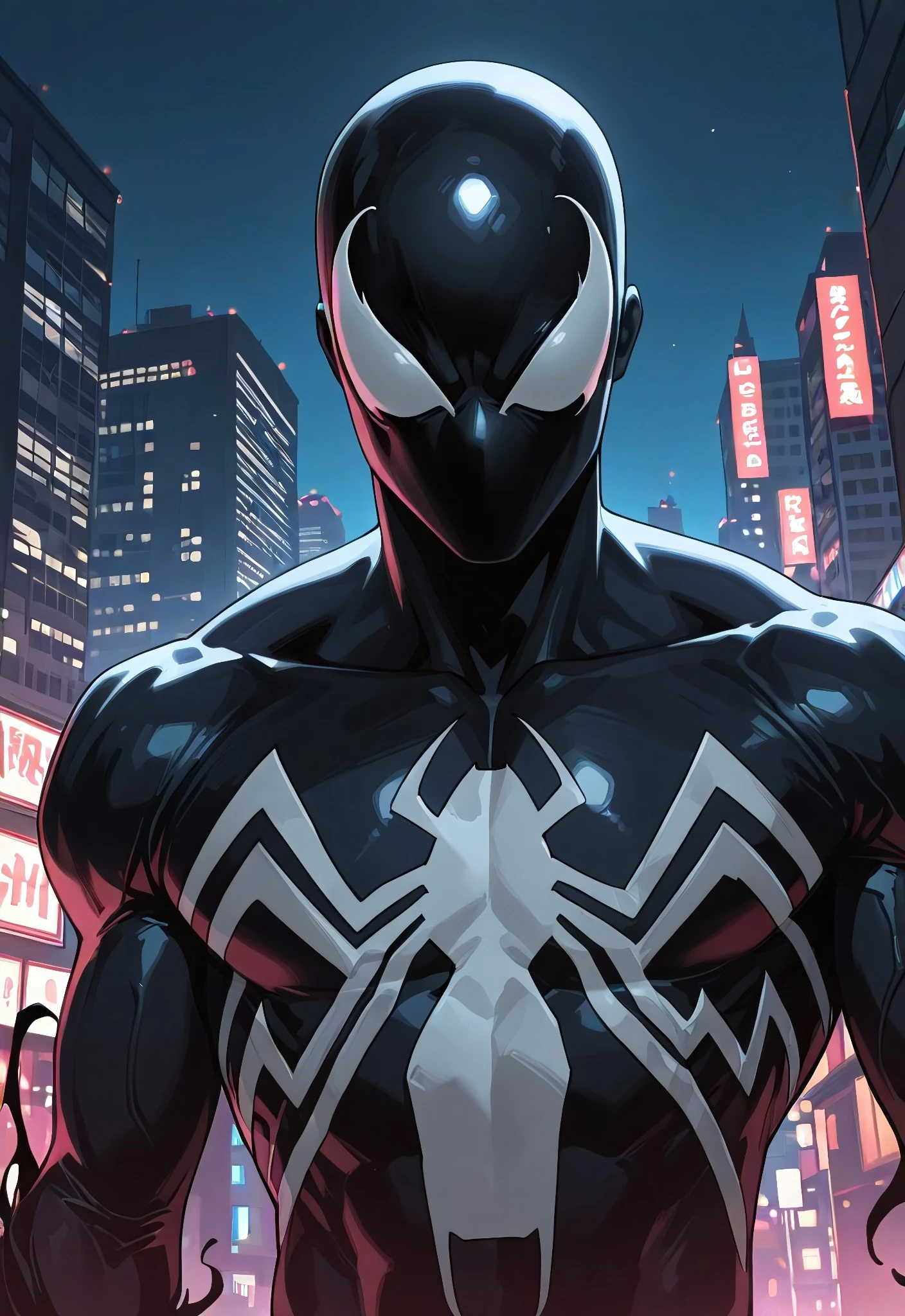 spiderman1999_(amazing99)comicsXL, symbiote, body suit, black suit, spider print, 1boy, solo, mask, muscular,Prompt Symbiote Spider-Man Black Suit "1999" Illustrious: