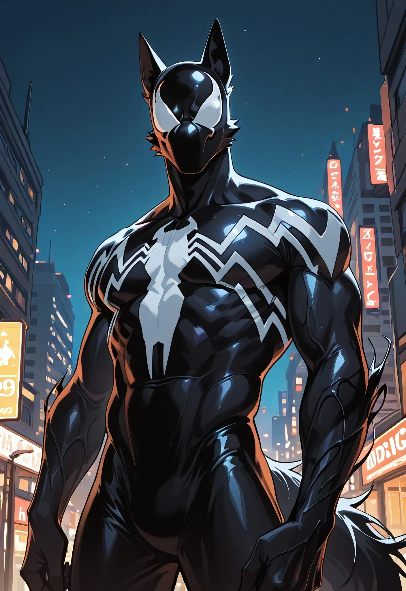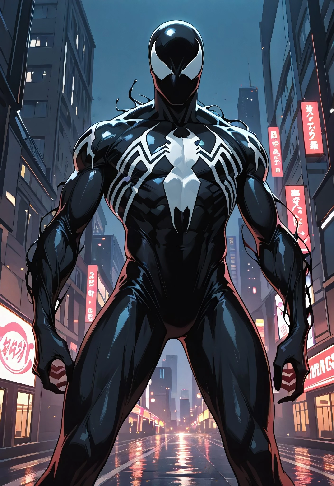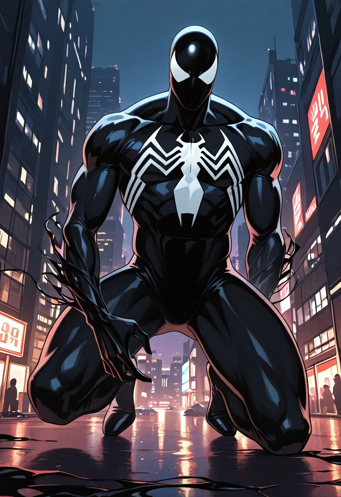 spiderman1999_(amazing99)comicsXL, symbiote, body suit, black suit, spider print, 1boy, solo, mask, muscular,Prompt Symbiote Spider-Man Black Suit "1999" Illustrious: