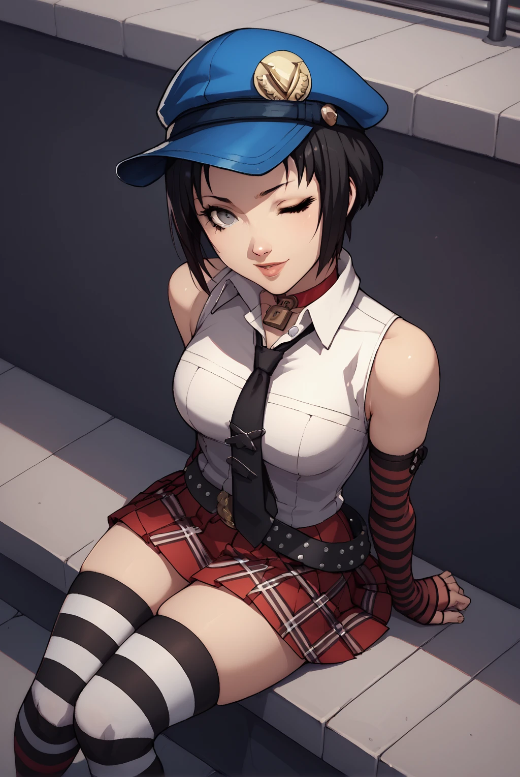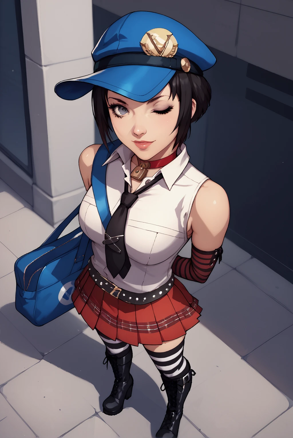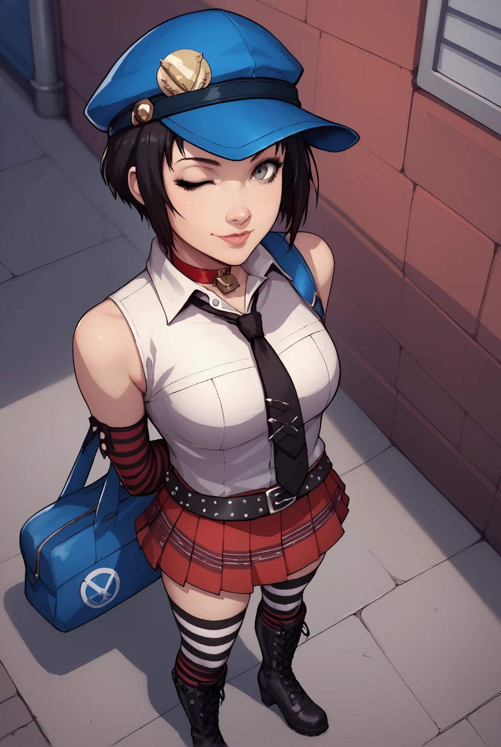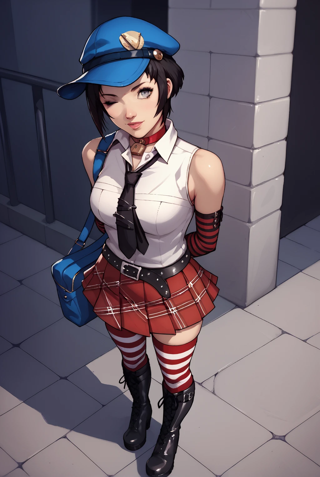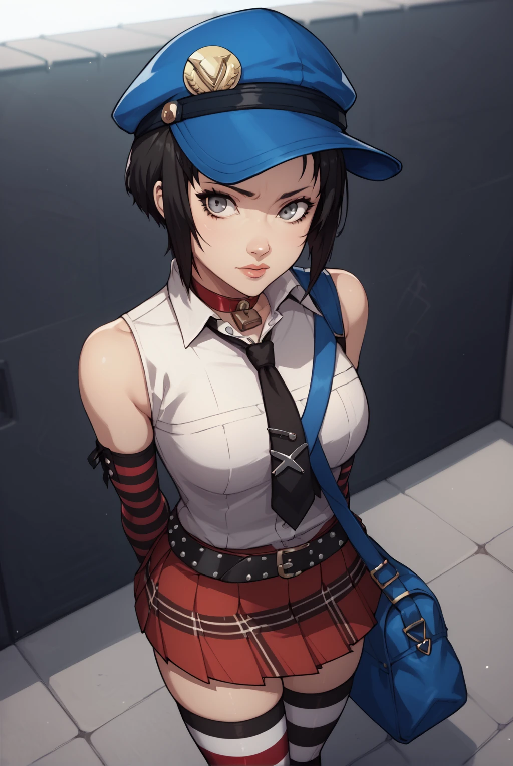 padlock choker, red choker, sleeveless shirt, white shirt, bare shoulders, necktie, elbow gloves, cabbie hat, one shoulder bag, plaid skirt, striped gloves, black and white striped stockings, striped stockings