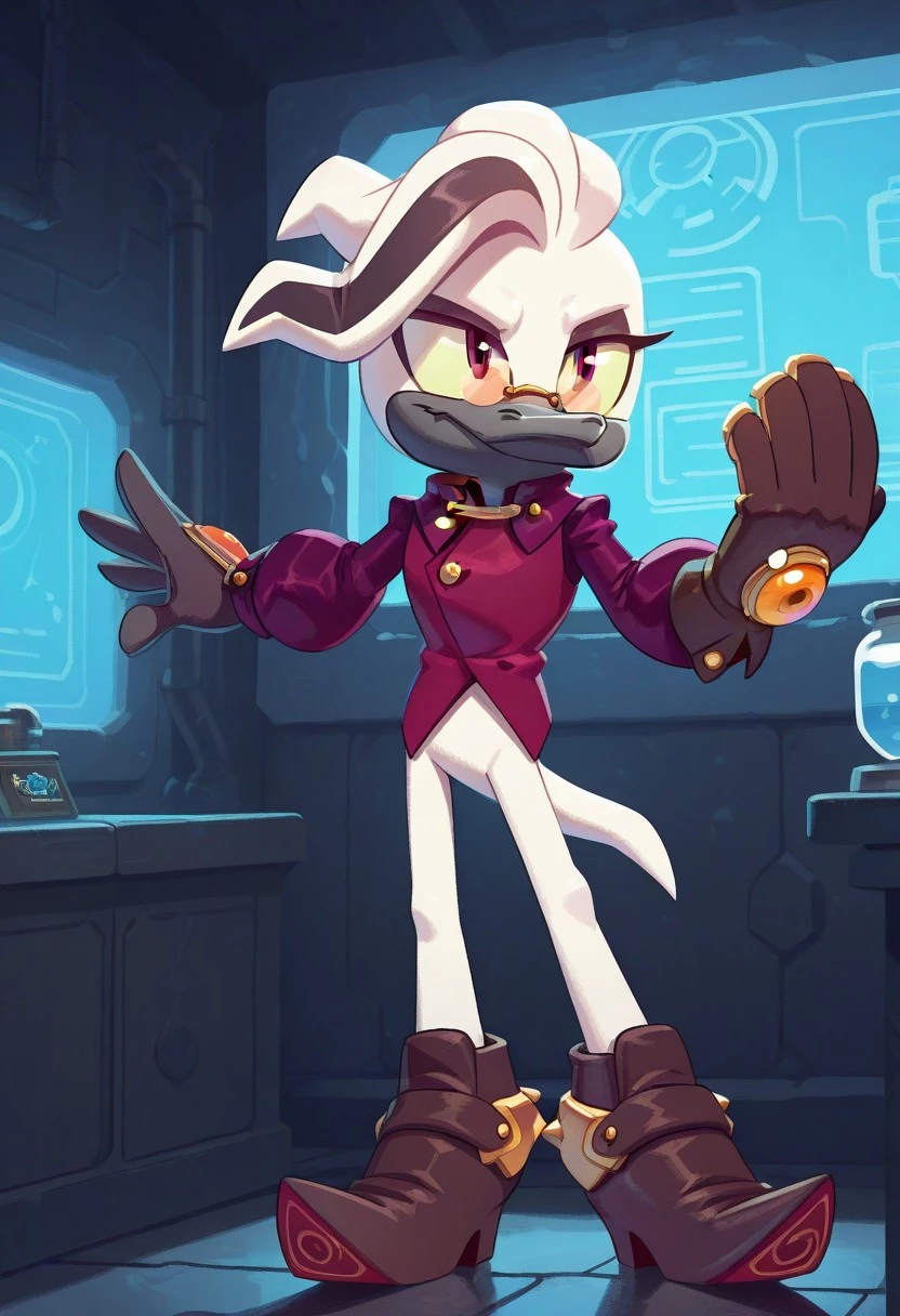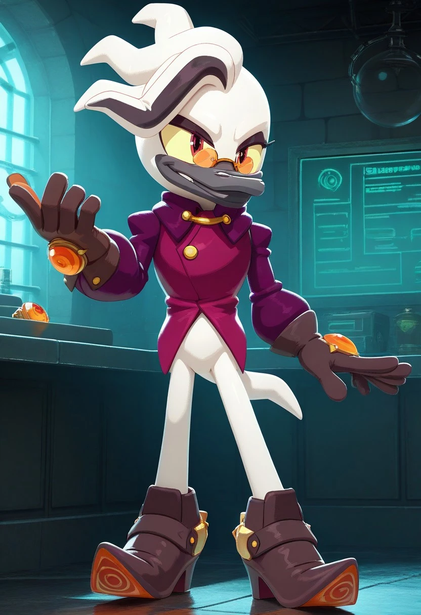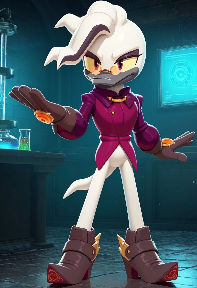 Starline the Platypus, white skin, black beak, yellow sclera, dark pink eyes, orange glasses, white tail, satin purple shirt, brown glove with orange gem in center, no pants, brown heels