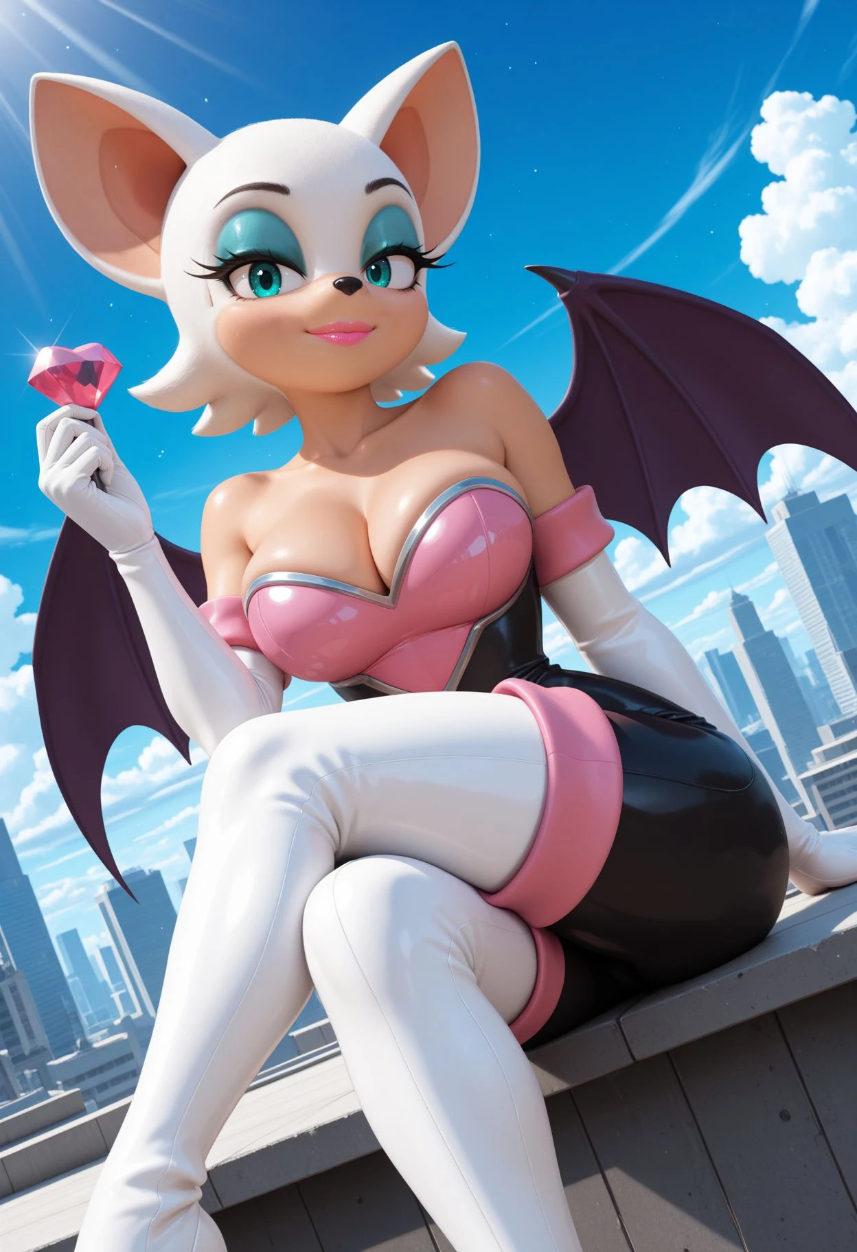 Main Prompt: 1girl, solo, furry female, short hair, white hair, bat ears, bat wings, narrowed eyes, teal eyes, makeup, aqua eyeshadow, eyelashes, pink lipstick, animal nose, large breasts, narrow waist,