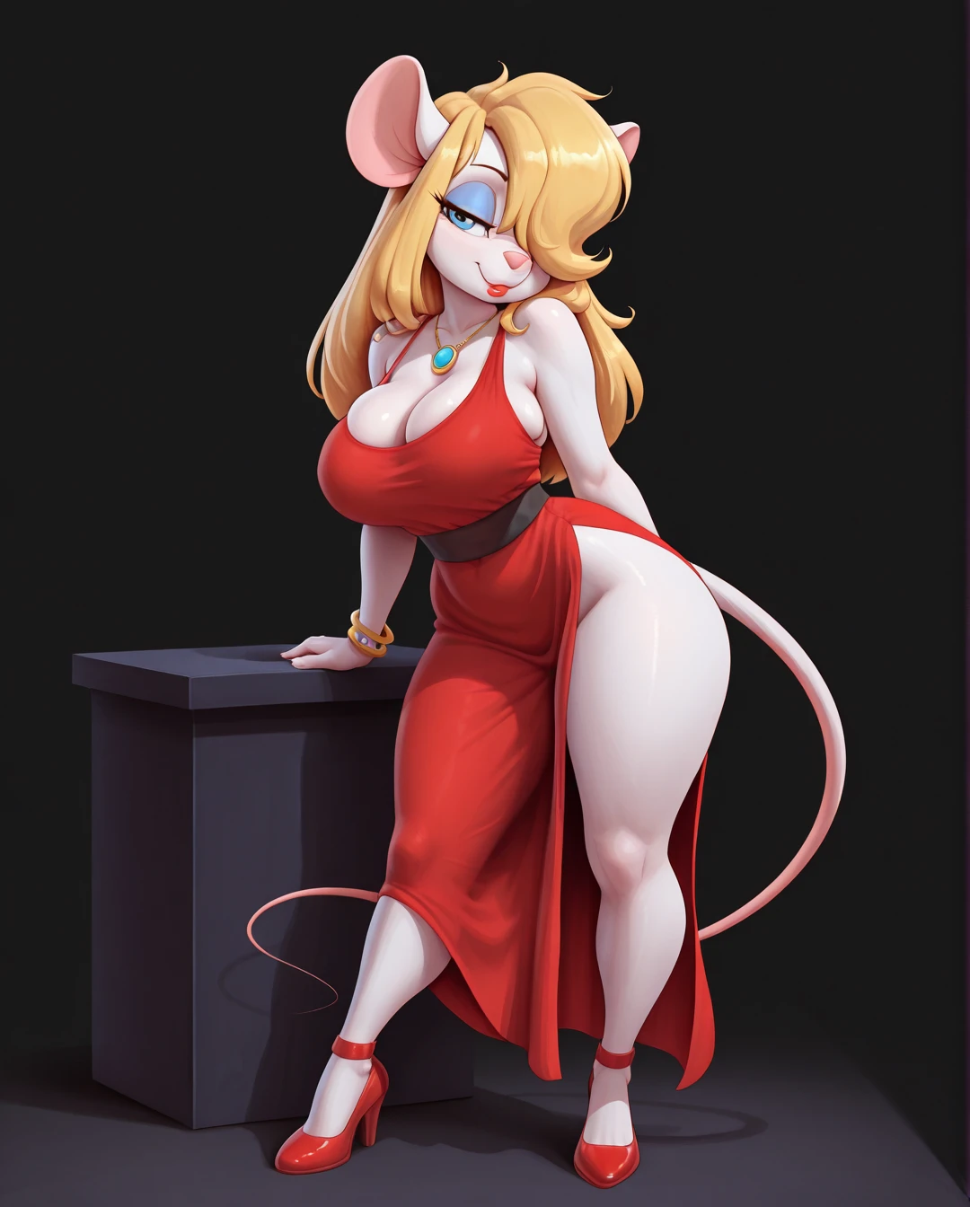furry female, long hair, mouse girl, animal nose, blue eyes, animal ears, body fur, mouse tail, blonde hair,