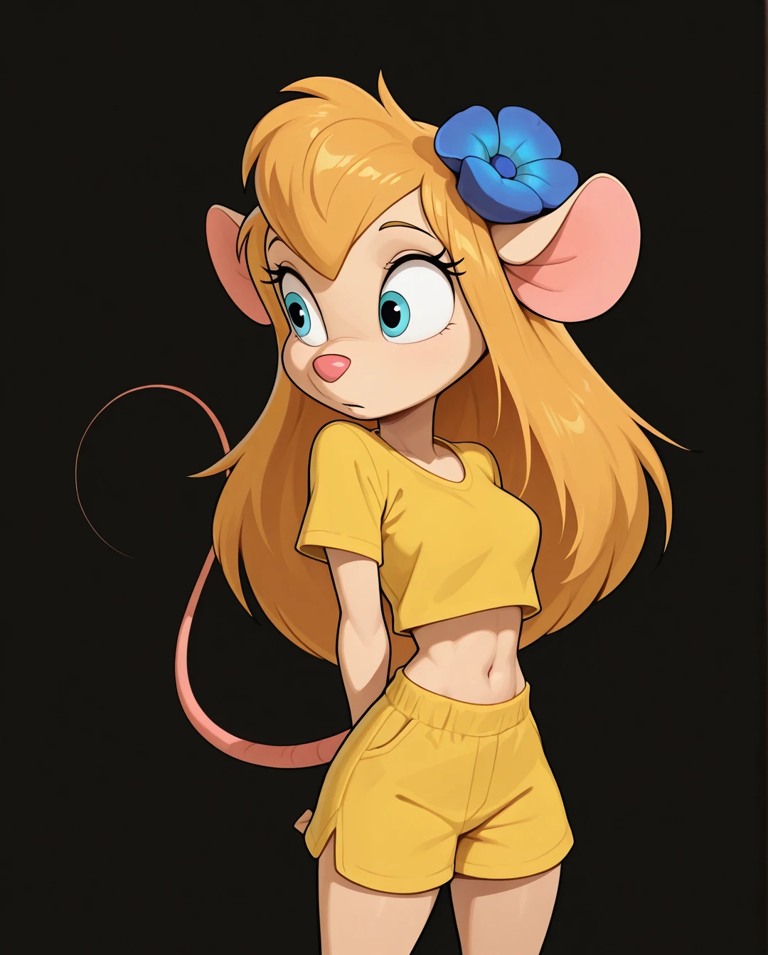 yellow shirt, yellow shorts, hair ornament, short sleeves, hair flower, midriff, crop top,