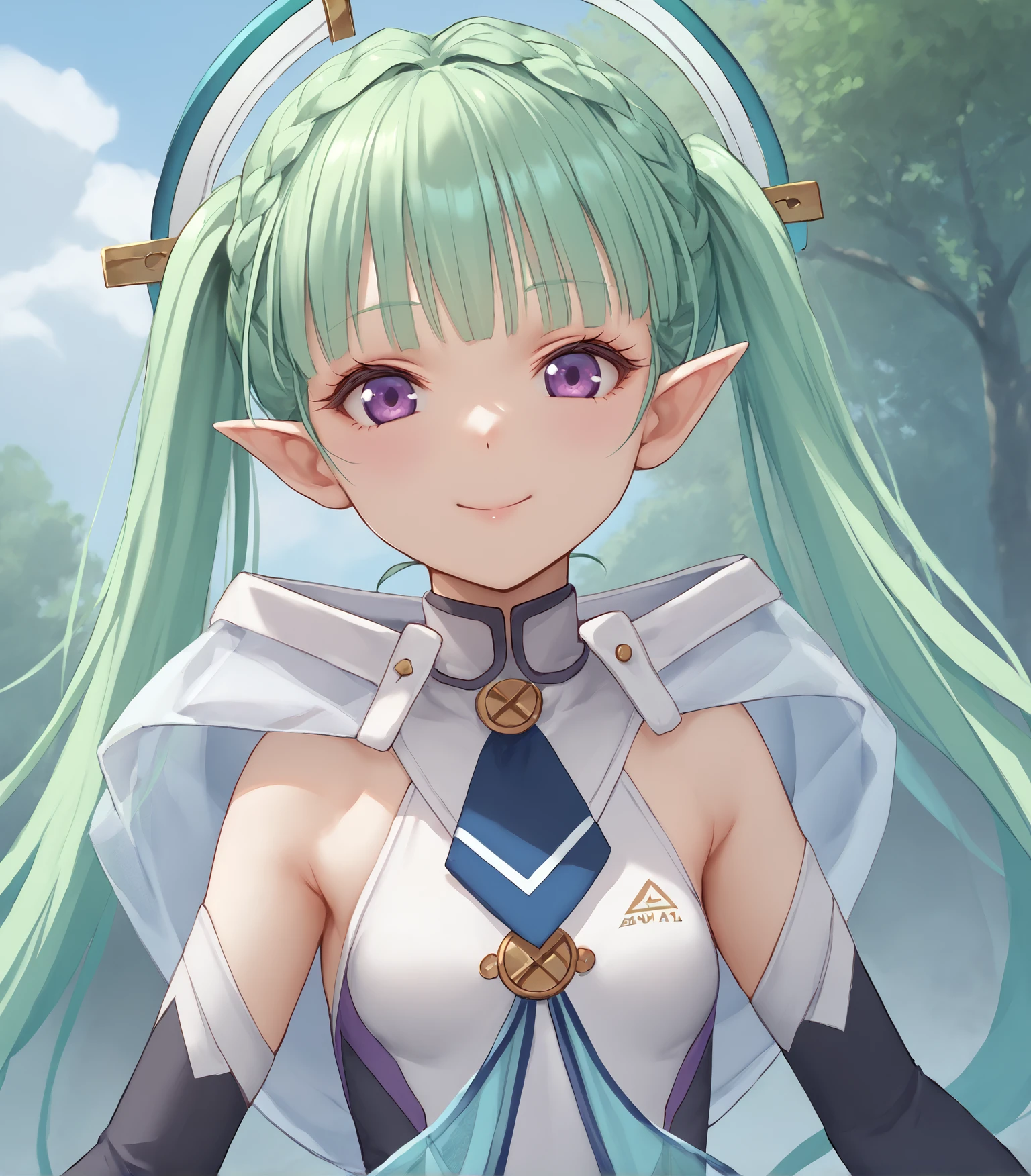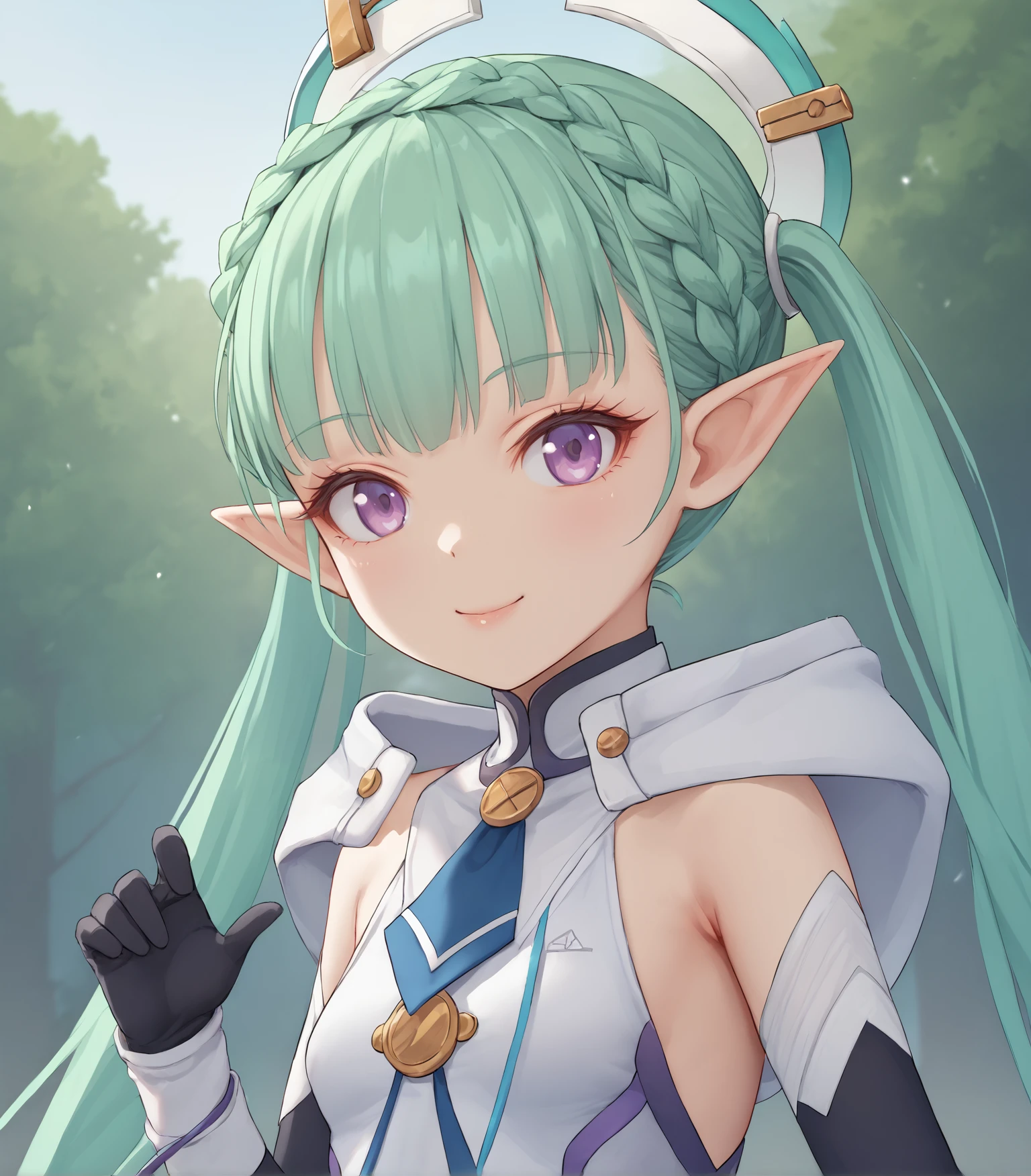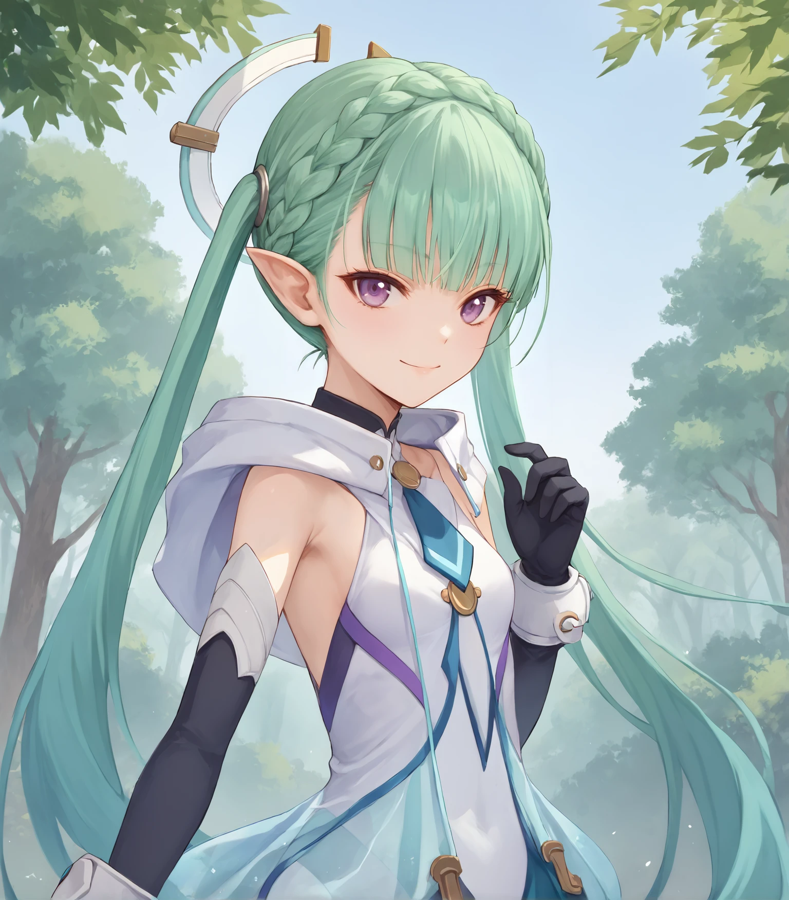 <lora:Mare:0.9>, Mare, long hair, green hair, twintails, purple eyes, halo, petite, small breasts, hood, white dress, white boots, aqua skirt, see-through skirt, translucent skirt, long gloves, black gloves, black thighhighs,This is an individual character upload from the main character pack for use with the Civitai generator service.