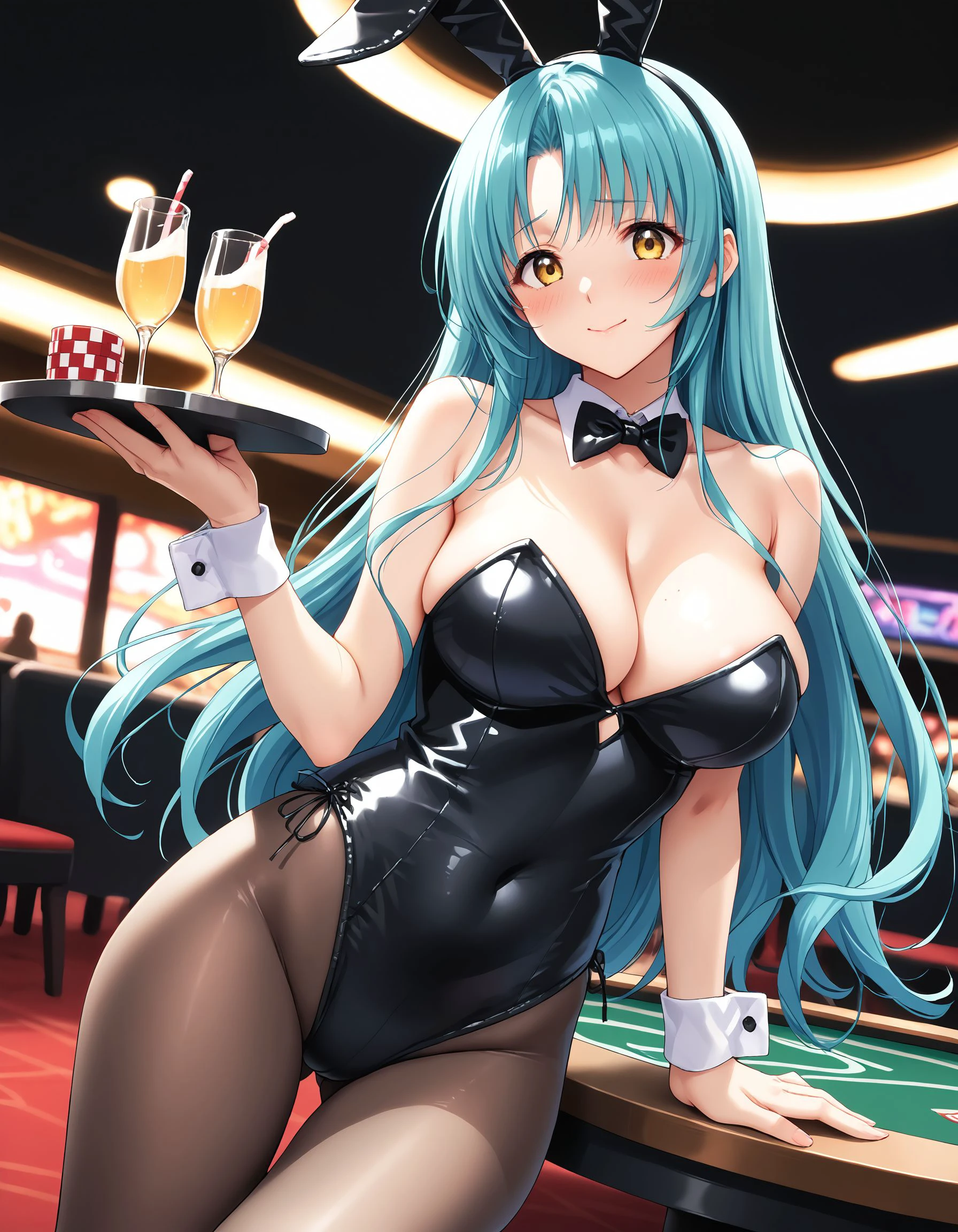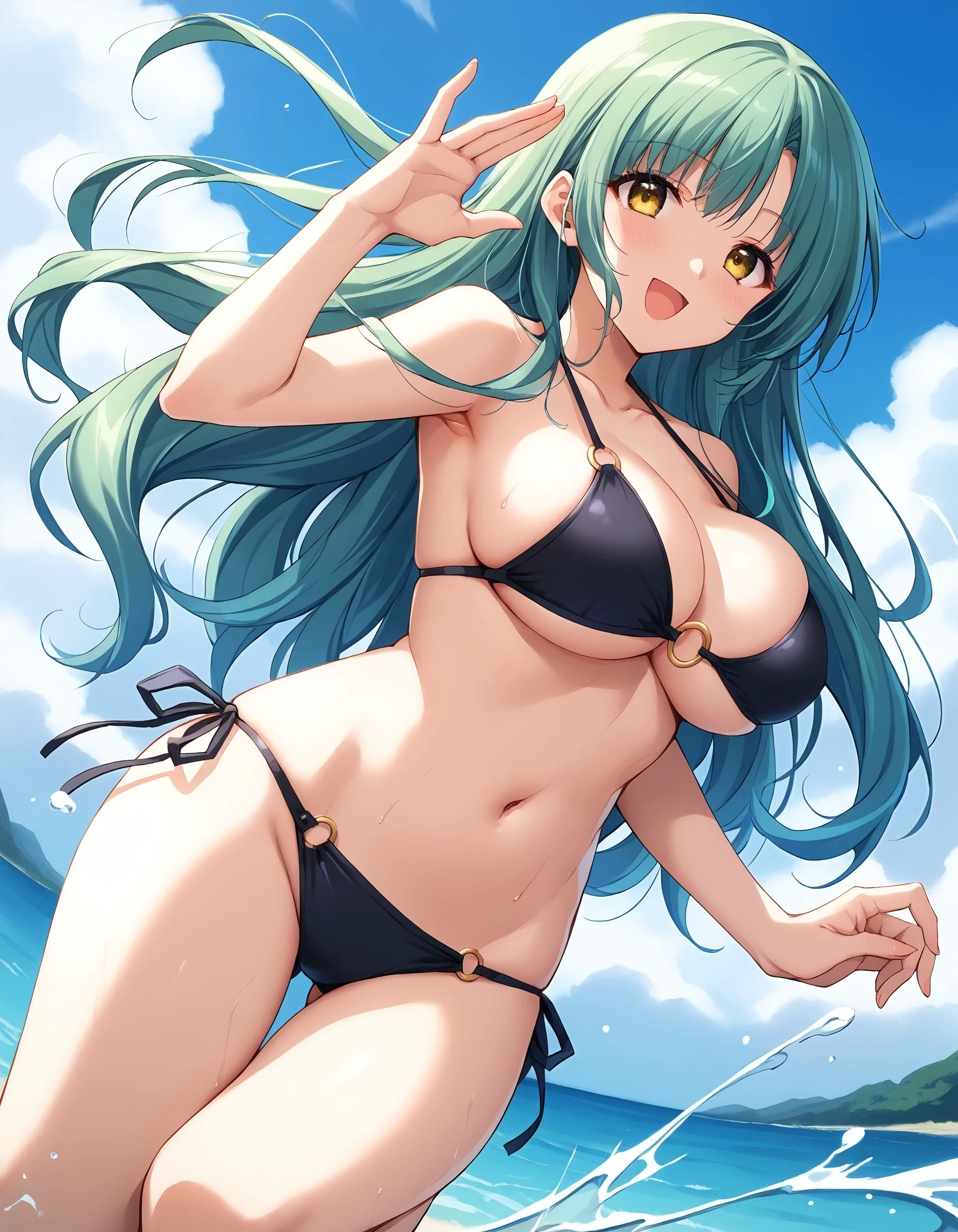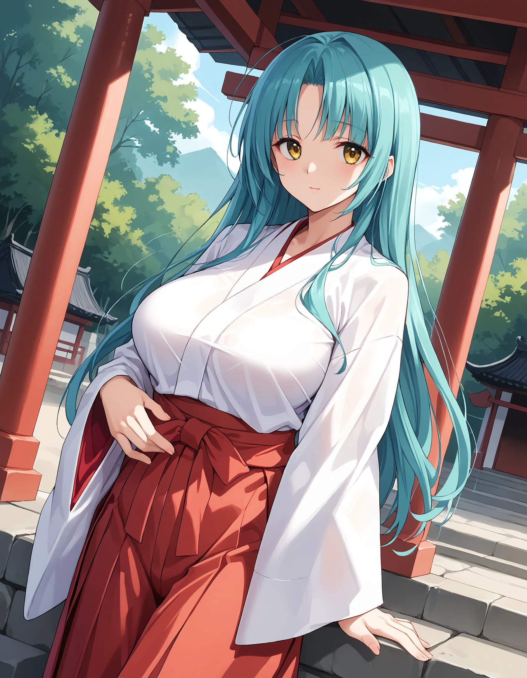 miyuki, turquoise hair, long hair, yellow eyes, large breasts,