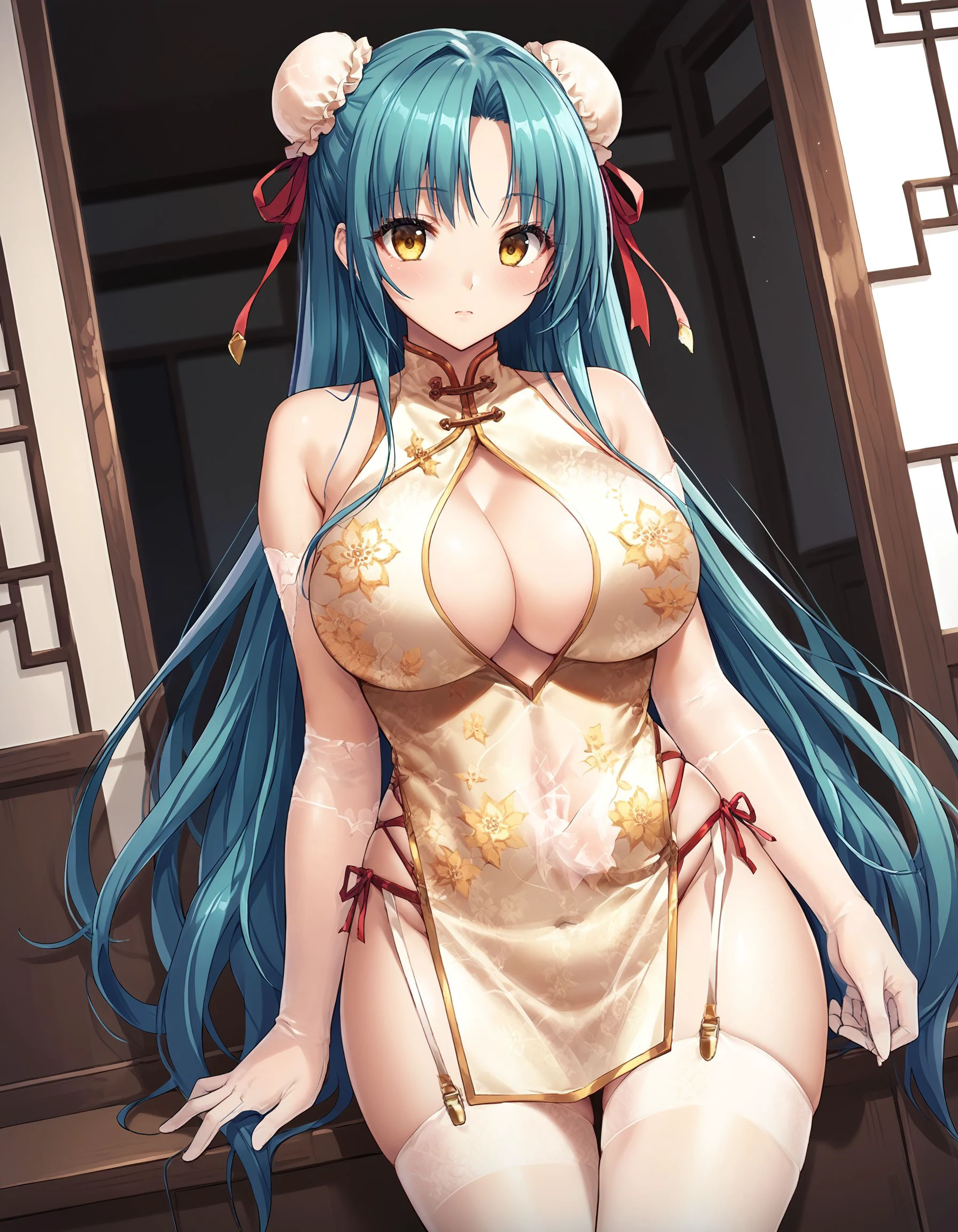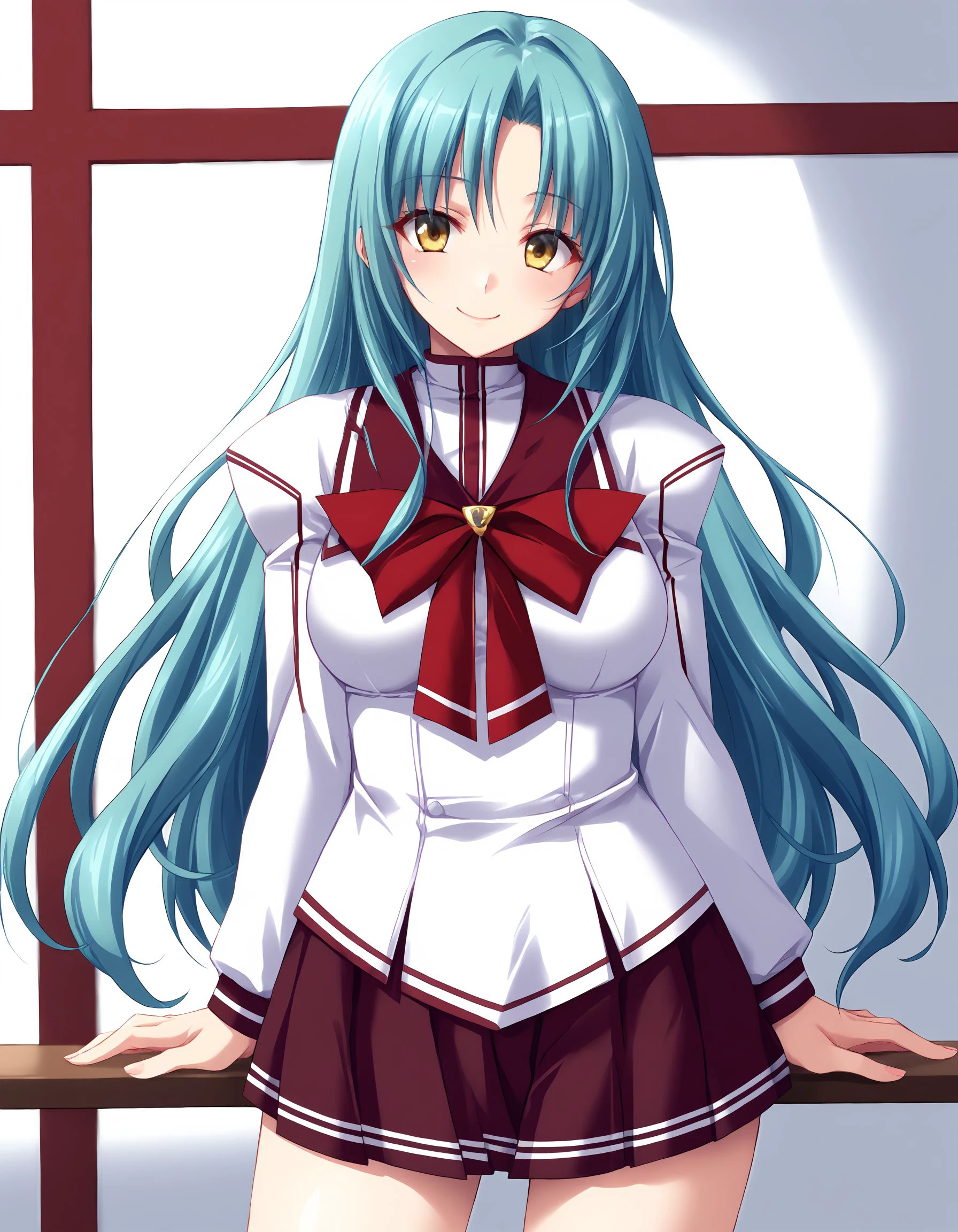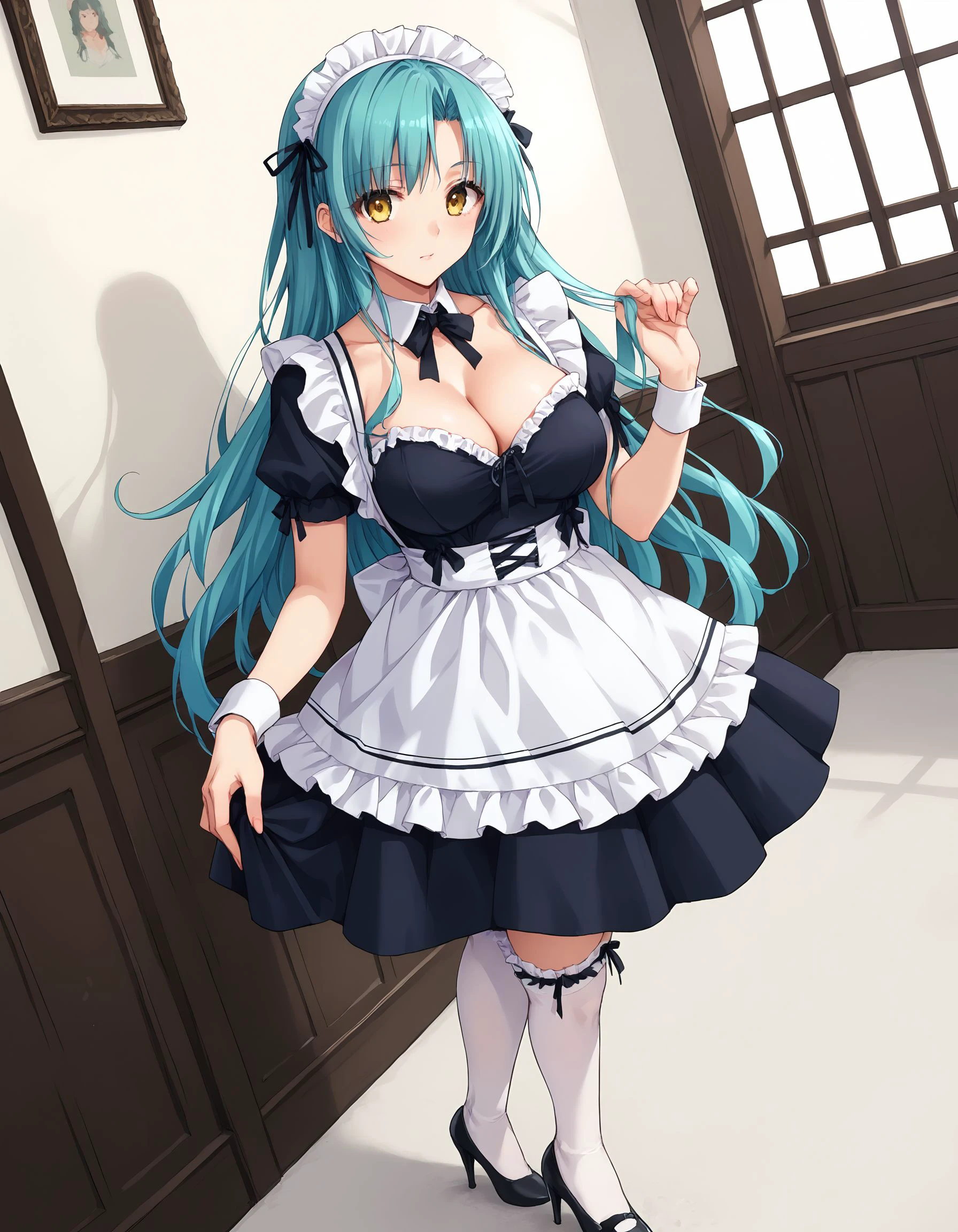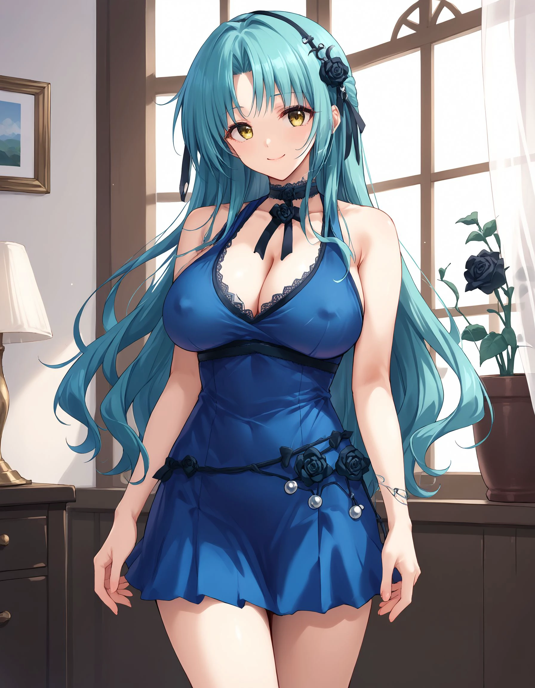 miyuki, turquoise hair, long hair, yellow eyes, large breasts,