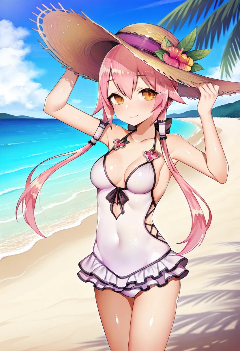 casual one-piece swimsuit, white one-piece swimsuit, hat,