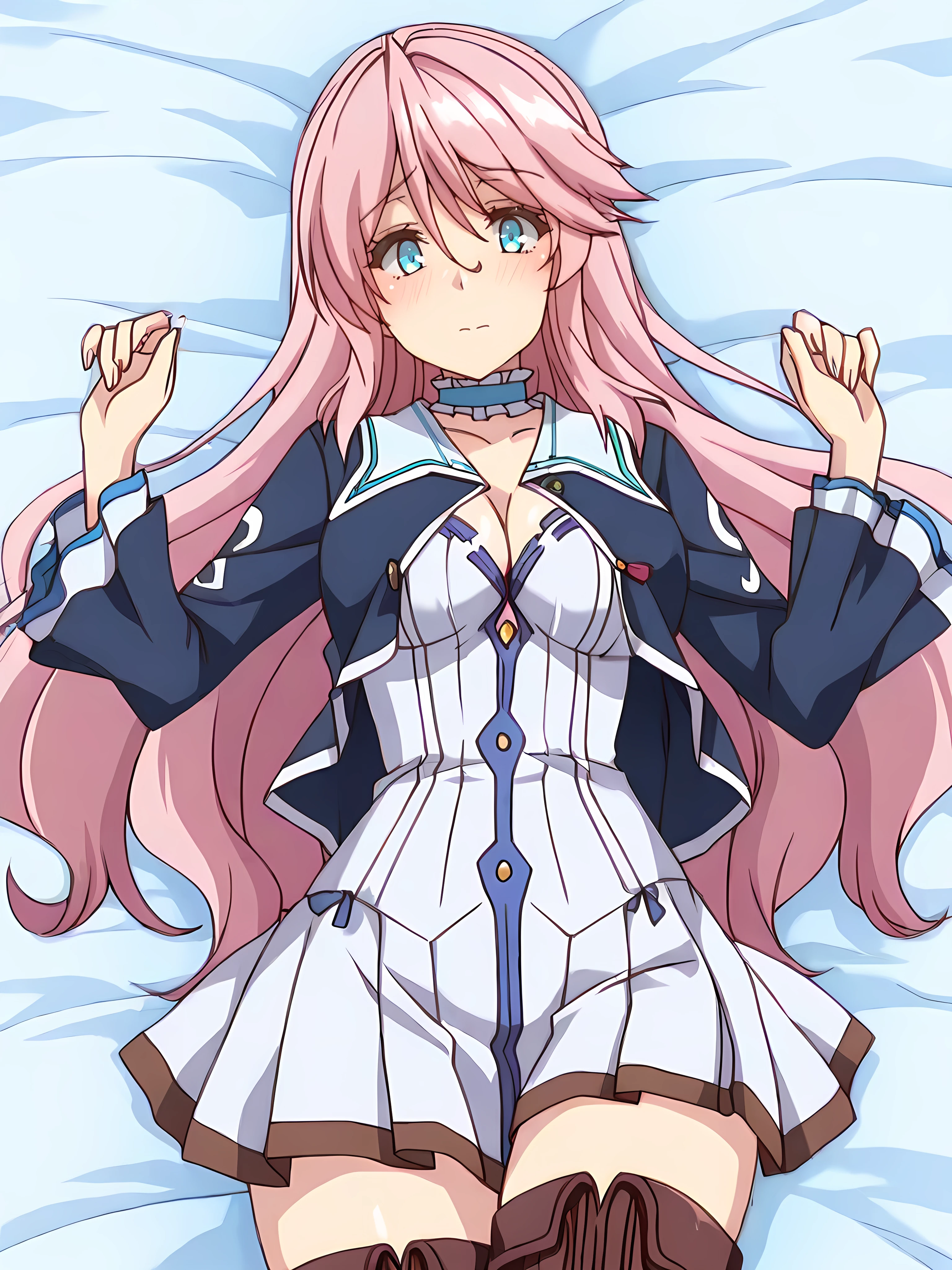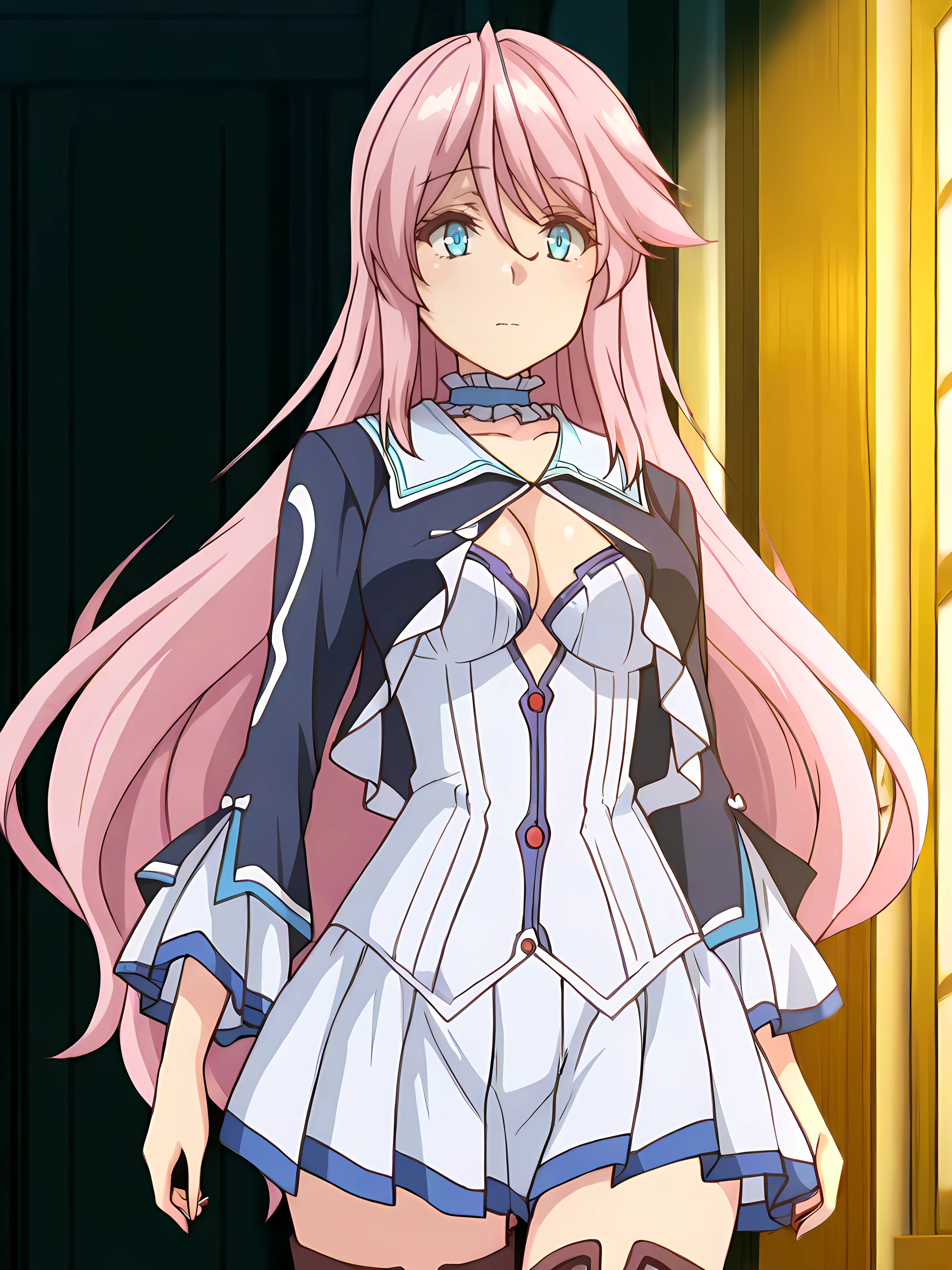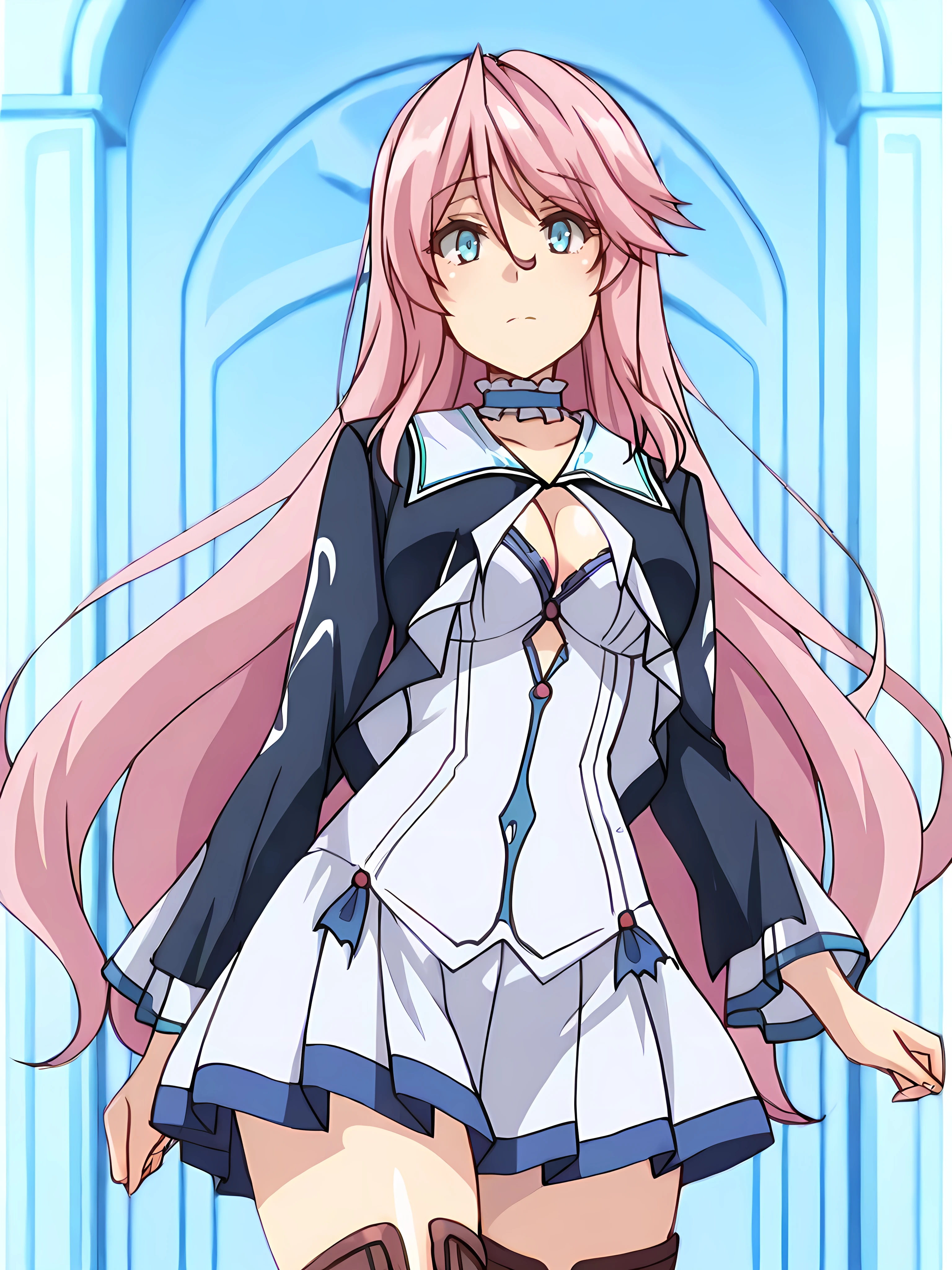 freiadress,frilled choker,sailor collar, cleavage,blue long sleeves jacket, open jacket, white dress, frills, white pleated skirt, zettai ryouiki,brown thigh boots