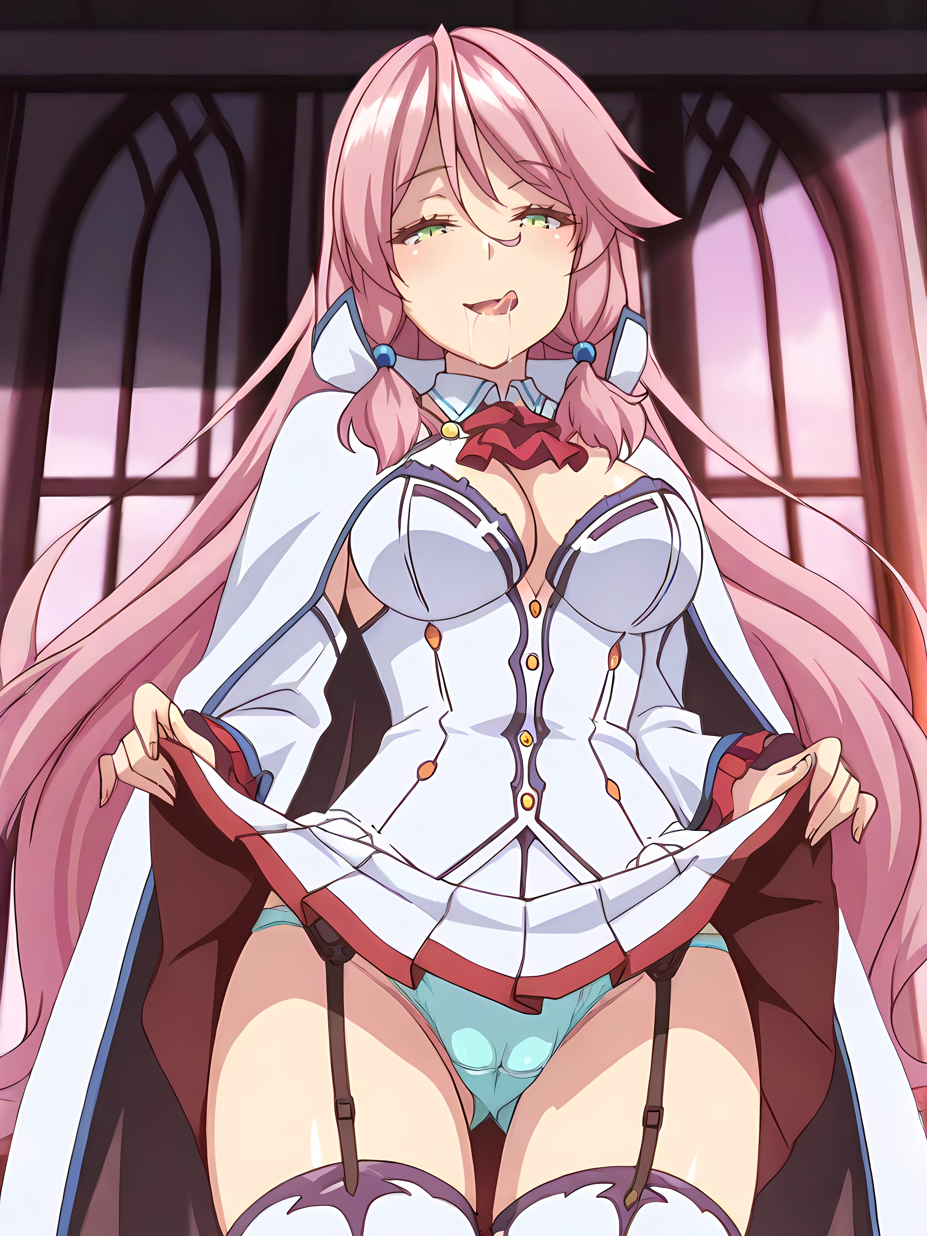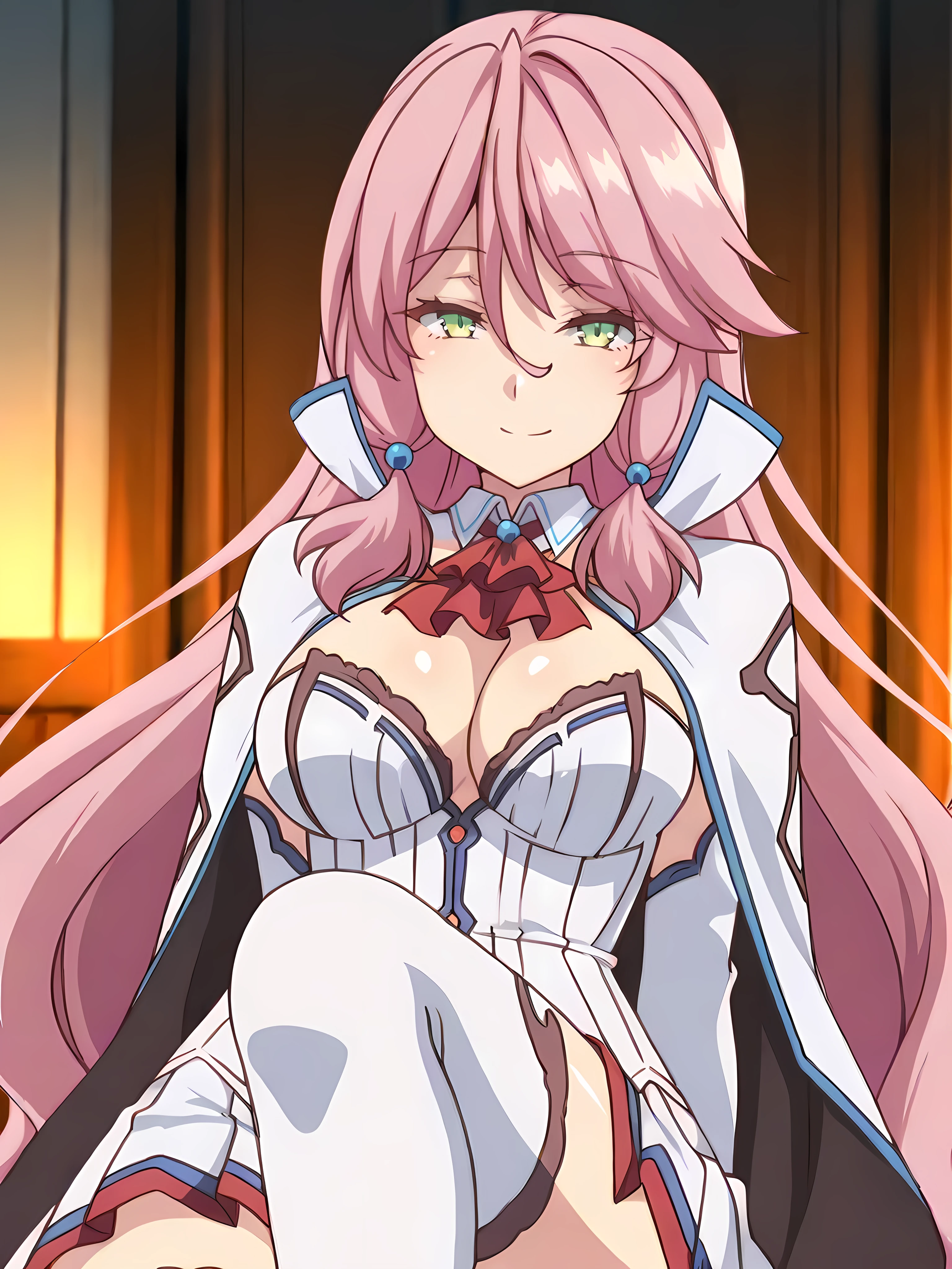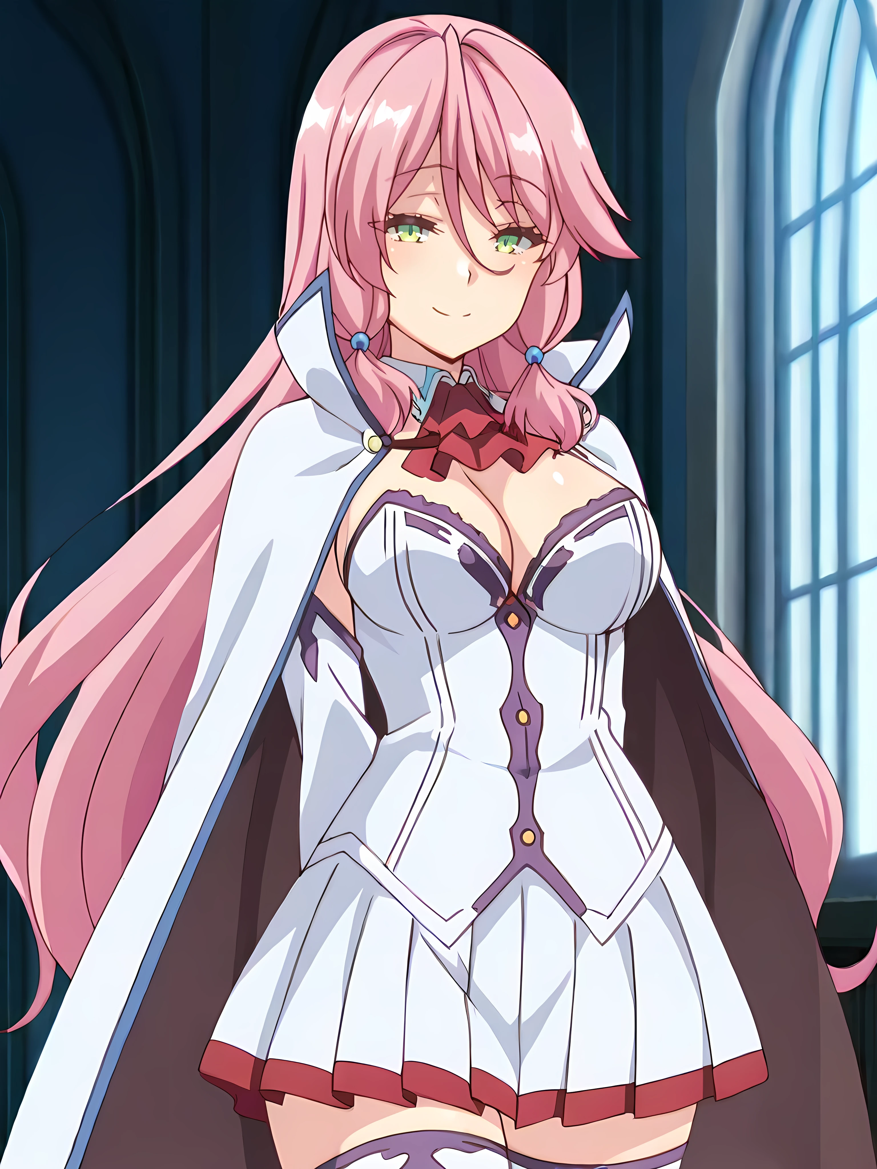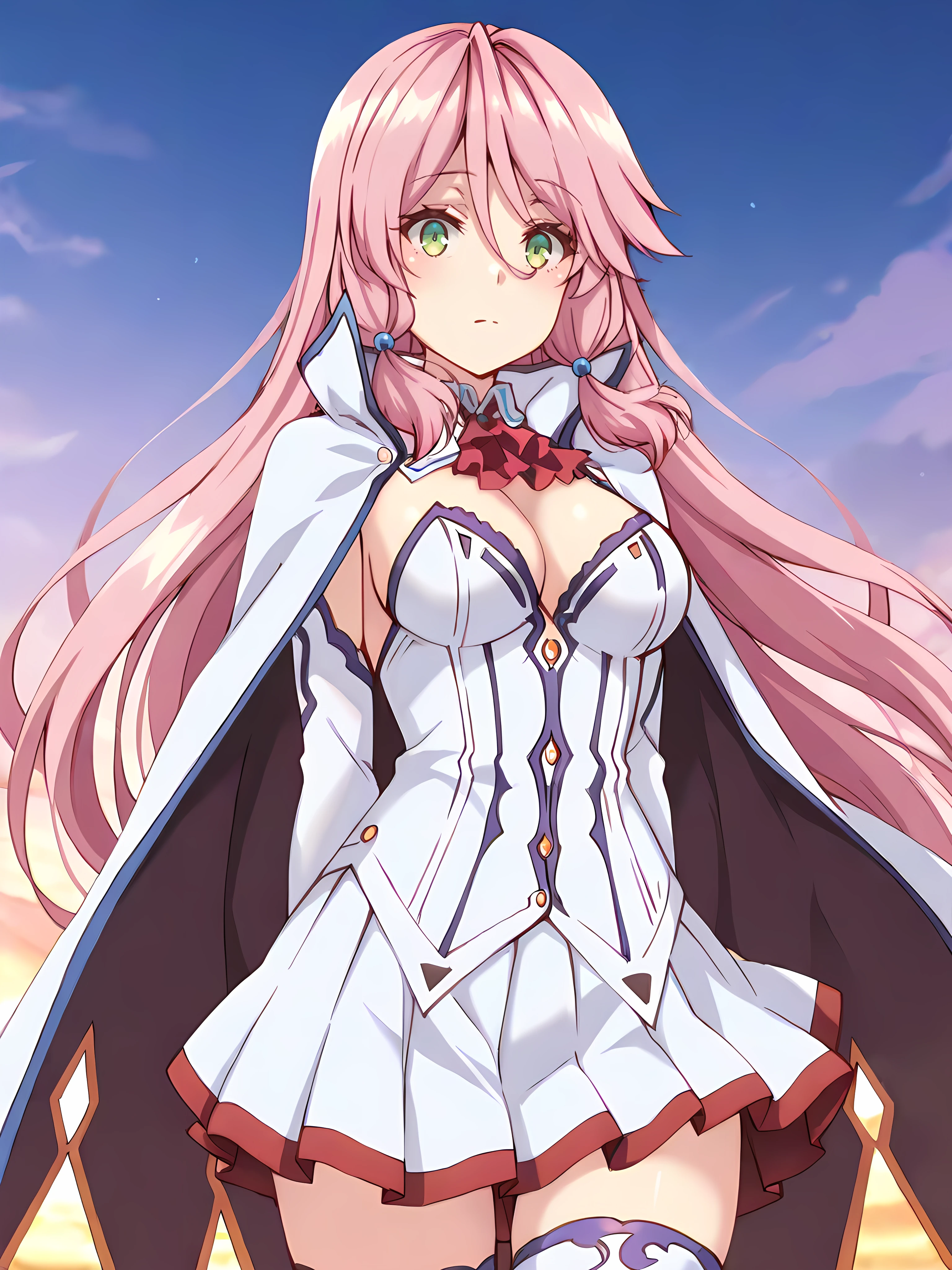flaredress,hair ornament,blue hair bobbles,white cape,red ascot, cleavage, white corset, white pleated skirt,zettai ryouiki, white thighhighs,