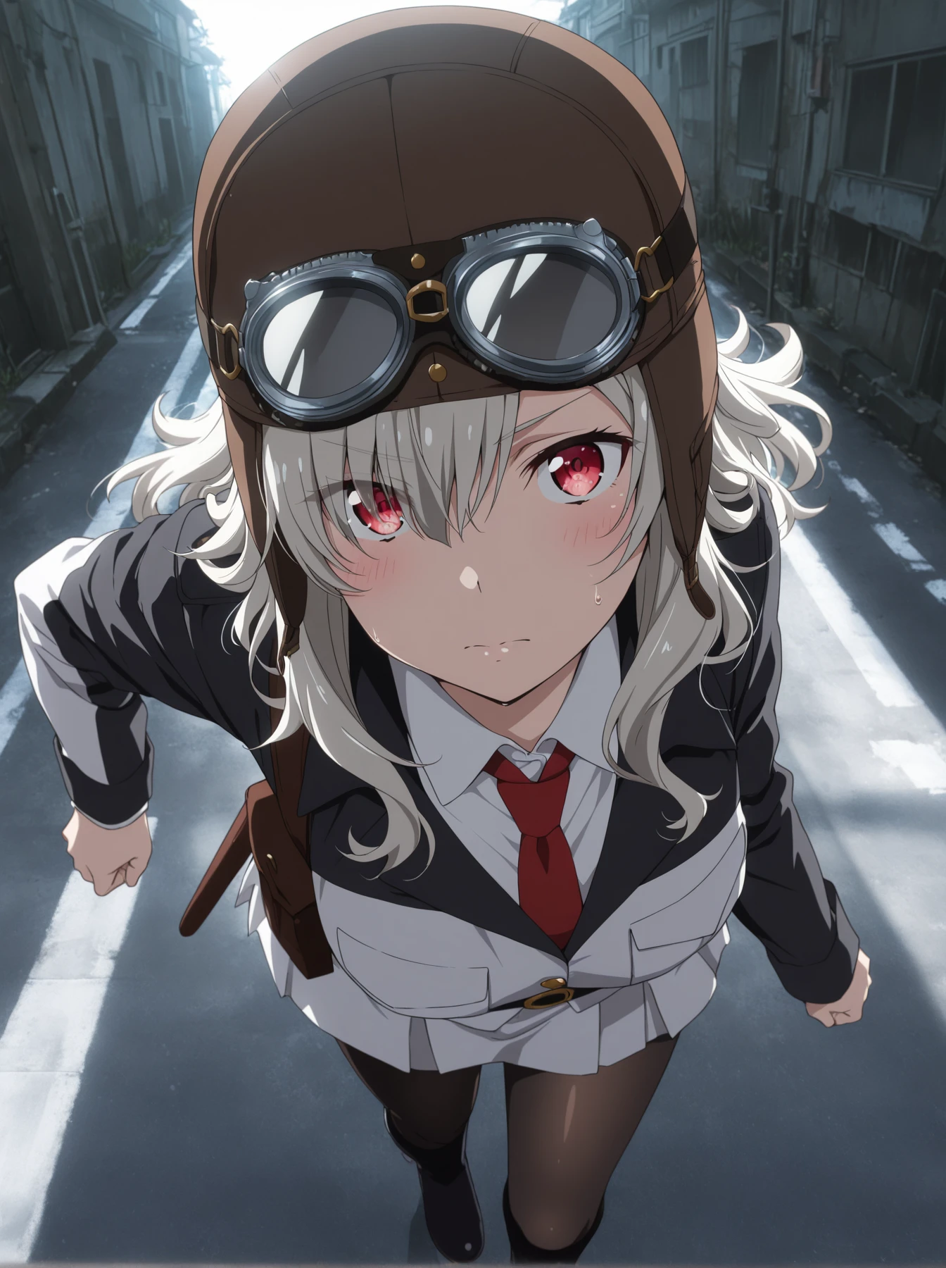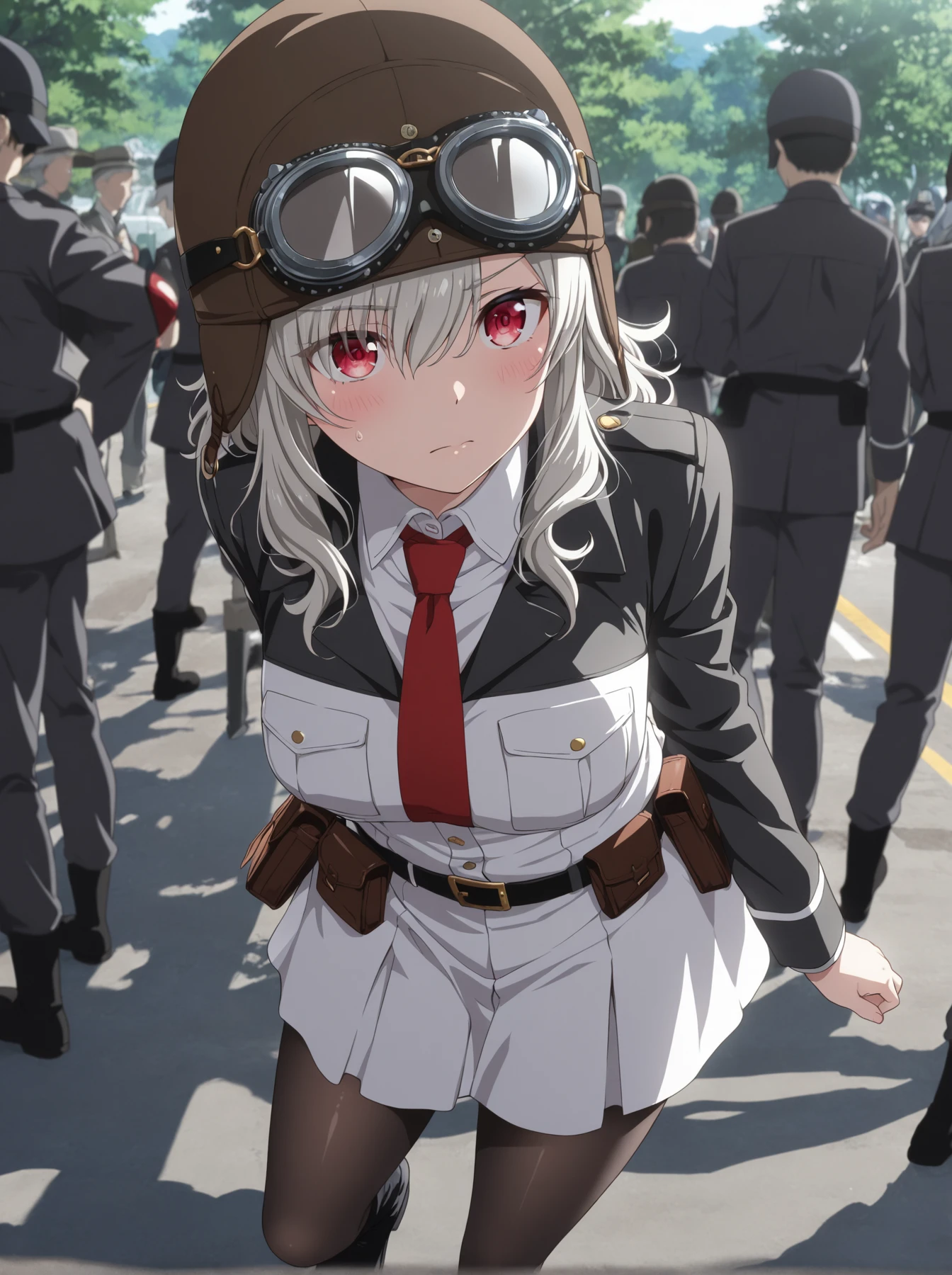 Pilot: (AzuzuPilot, red eyes, gray hair), (military uniform, brown aviator cap, goggles on headwear, two-tone jacket, long sleeves, white skirt, red necktie, pantyhose, black boots, black belt),